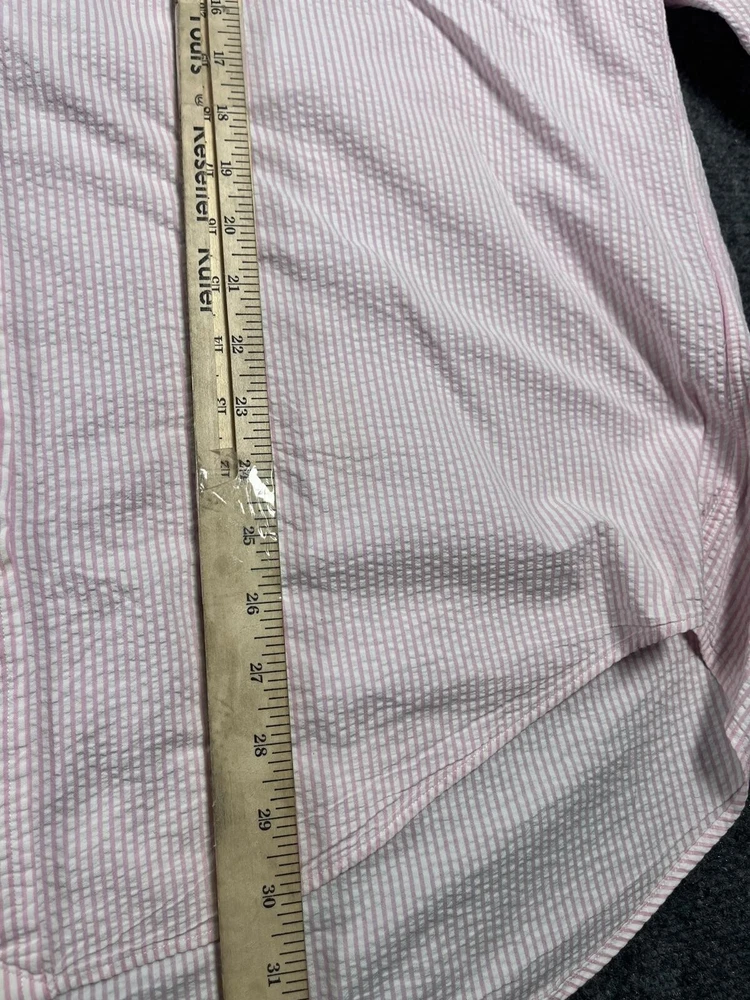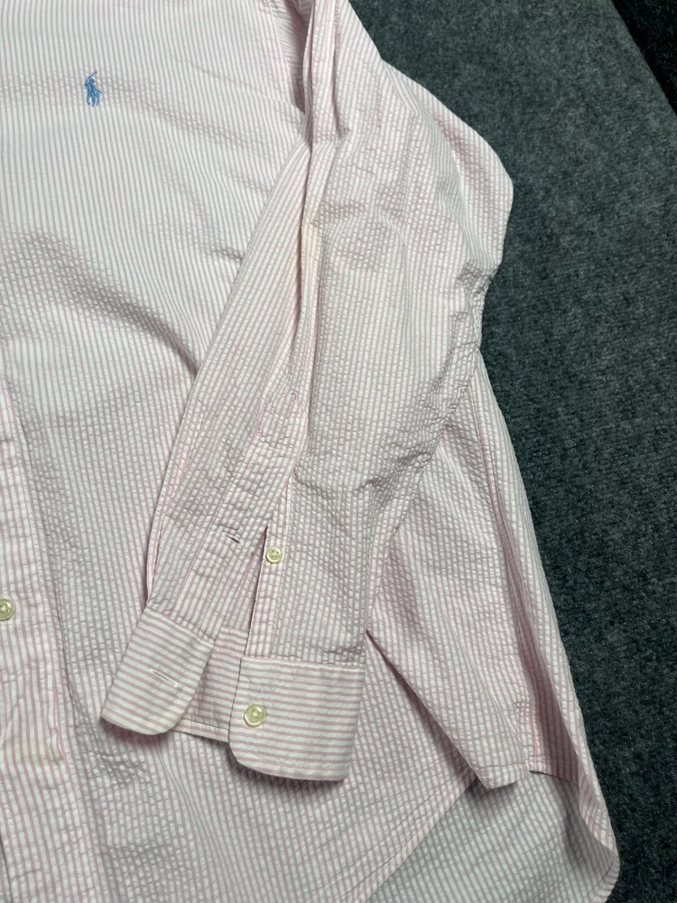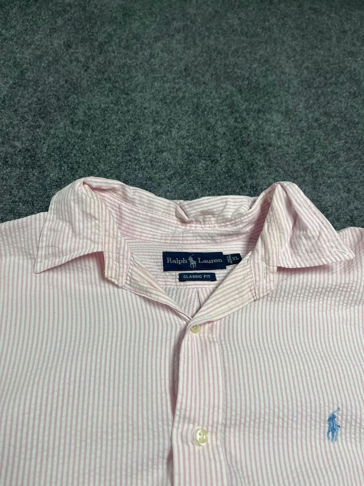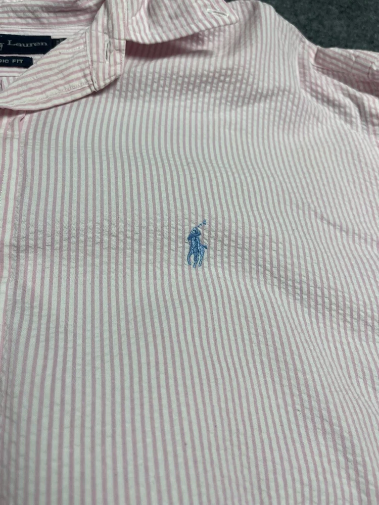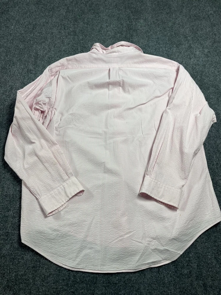 This Ralph Lauren button-up shirt is a must-have for any fashion-forward man. The classic fit and colorful striped pattern make it perfect for any occasion, whether it's a casual day out or a business meeting. The shirt features long sleeves, a collared neckline, and button closure for a sophisticated look. Made of lightweight and easy-care cotton material, this shirt is machine washable for convenience. The shirt also boasts embroidered accents and a button-down collar style for added style. Available in XL size and chest size of 50 inches, this shirt is perfect for men who want to look and feel their best.