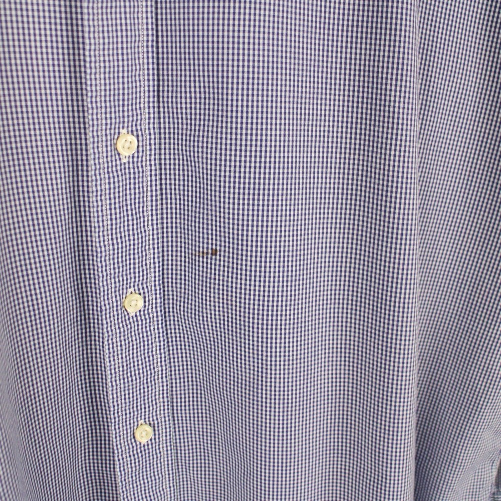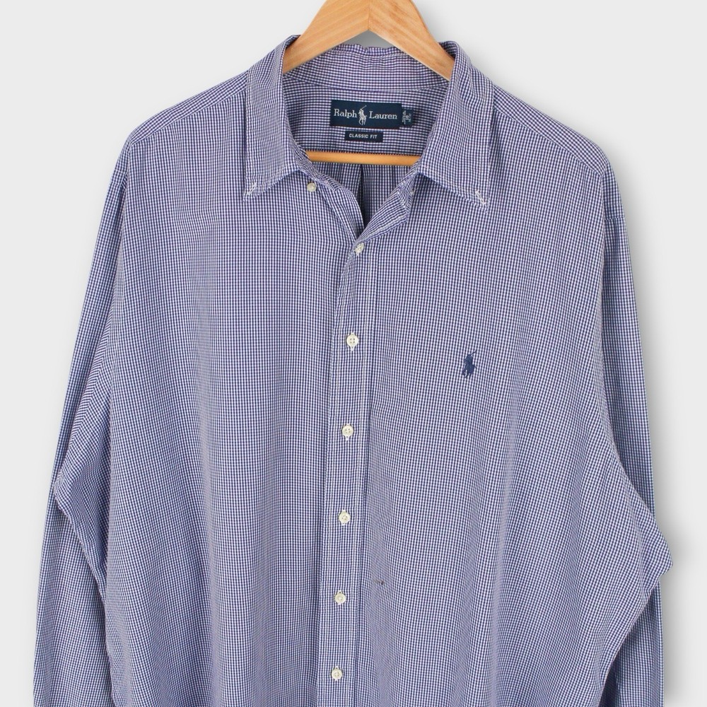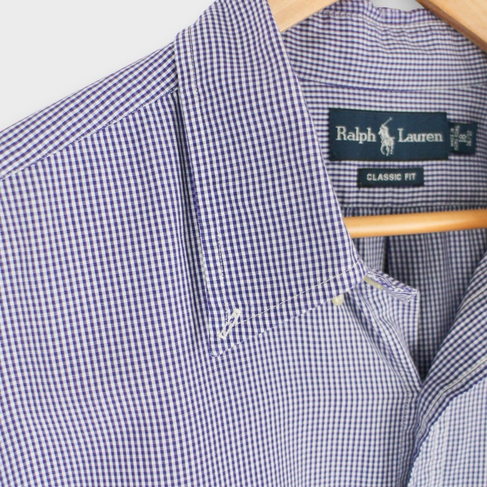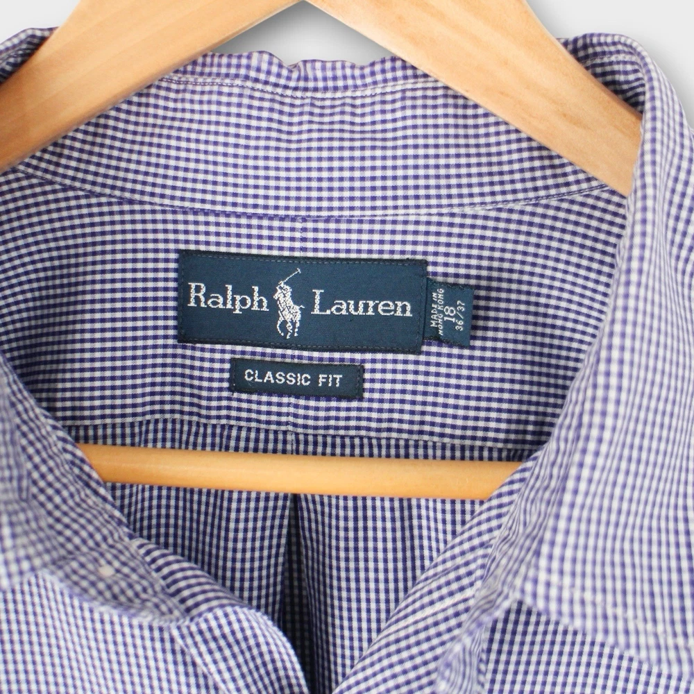 Timeless Ralph Lauren men’s button-down shirt in a blue and white micro-check pattern. Features the signature embroidered pony logo on the chest and a comfortable Classic Fit cut — perfect for both casual and business settings. Details: • Brand: Ralph Lauren • Size: 18 (Neck) / 36–37 (Sleeve) • Color: Blue & White Check • Material: 100% Cotton • Fit: Classic Fit • Features: • Button front • Button-down collar • Chest logo embroidery • Long sleeves with button cuffs • Made in Malaysia Condition: Good pre-owned condition — small faint mark on the front (see close-up photo). No holes or major flaws. ⸻ 📏 Measurements (approx.): • Pit to Pit: 29” • Length: 31” • Sleeve: 26”