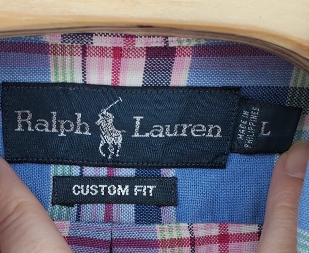 Ralph Lauren Custom Fit Blue Pink Plaid Button Down Shirt Men's Size Large Nice. It's a blue and pink plaid with a pink embroidered pony on the left side of the chest and it's made of 100% cotton. Please check measurements as preowned item measurements may vary. The measurement across the chest laying flat is 24 1/2 inches and the length from the shoulder to the bottom is 30 inches.