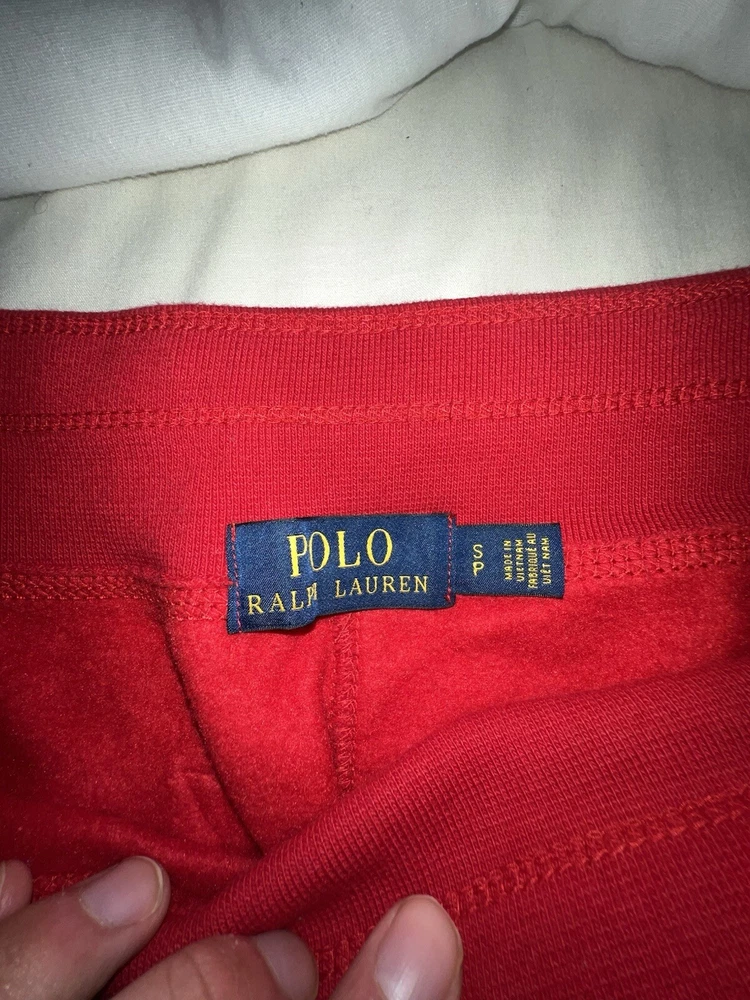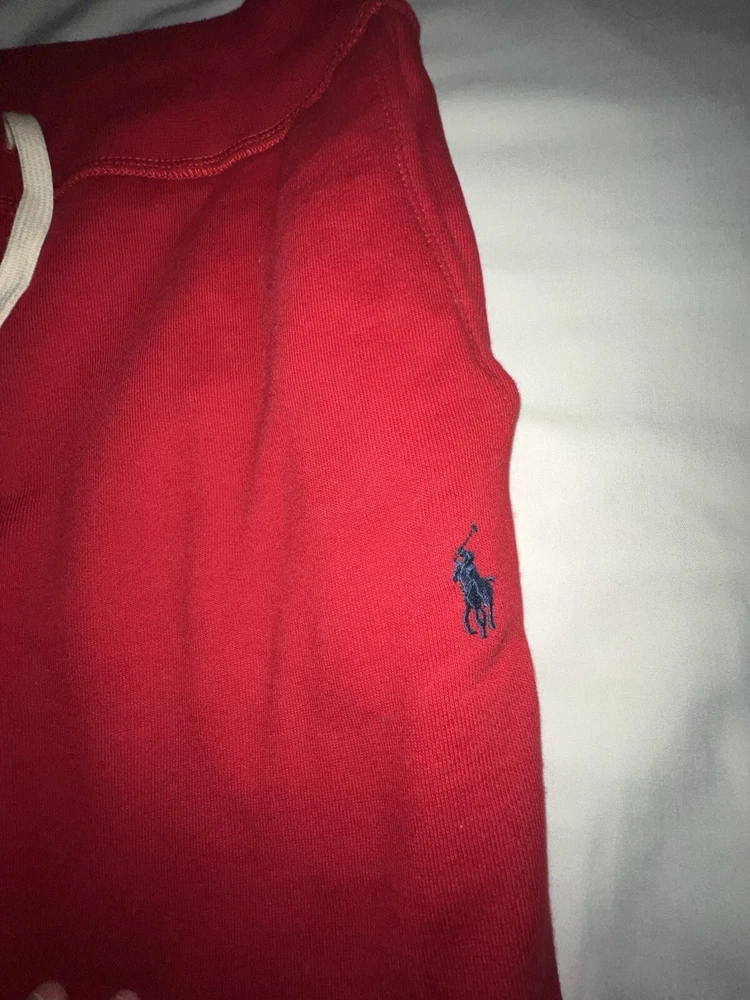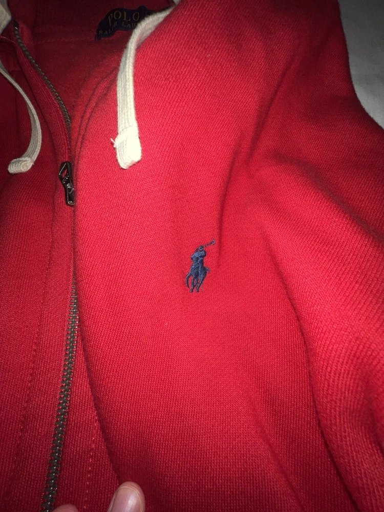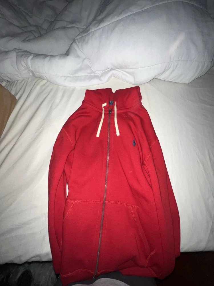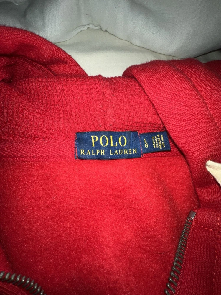 Elevate your style with this striking Ralph Lauren Denim hoodie in red. Crafted with high-quality fleece fabric, this hoodie is perfect for any occasion. It features a full-zip closure and is lined for added comfort. The hoodie is available in size L and comes with a matching pair of pants in size S.