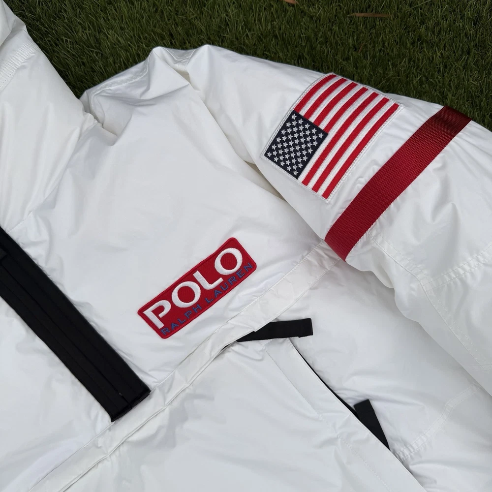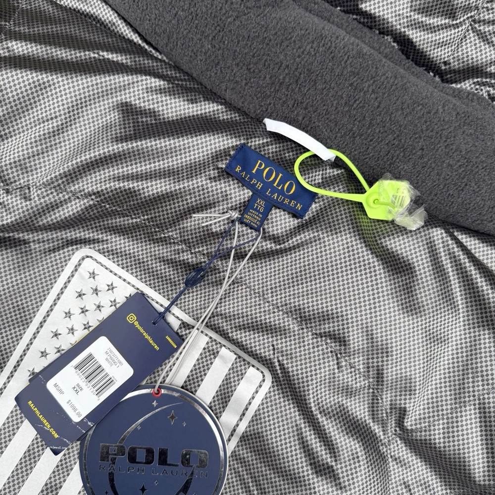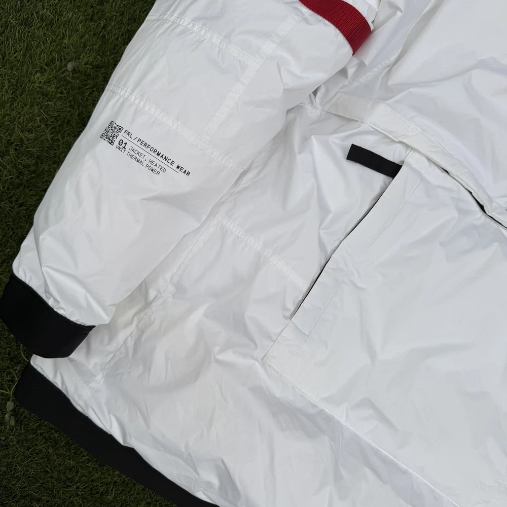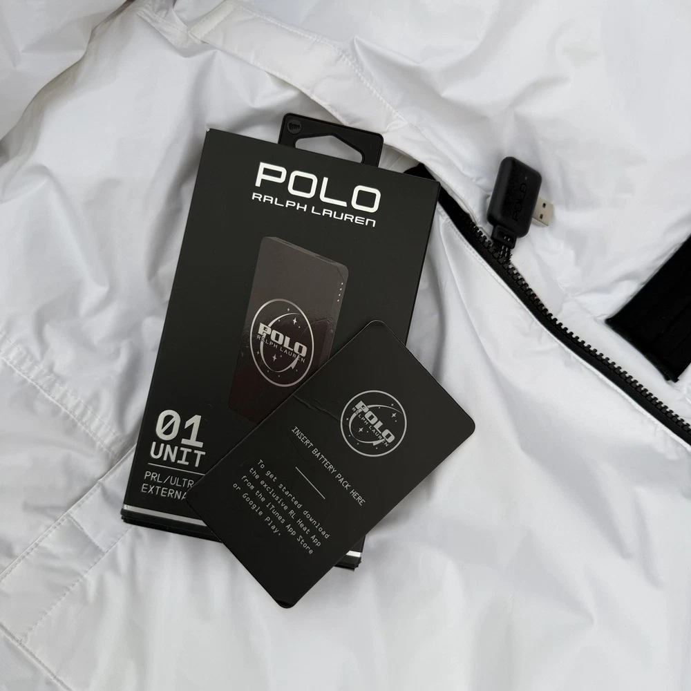 A rare, limited-edition Polo 11 RL Heat jacket, directly inspired by one of Ralph Lauren’s most iconic 1990s designs, combining classic Polo aesthetics with advanced wearable technology. This jacket features RL Heat, Polo Ralph Lauren’s proprietary onboard heating system, using ultra-light, fully flexible carbon and silver ink technology to deliver up to 11 hours of adjustable warmth. Heat levels are controlled in real time via the exclusive RL Heat app (available on iOS and Android) and powered by a Polo-branded Mophie battery, which is included. Filled with ethically sourced 750-fill-power down for natural insulation and finished with a water-repellent ripstop shell, this piece is both functional and collectible. ⸻ Condition • Pre-Owned with original tags • Includes one original Polo-branded Mophie battery pack Details & Features • Limited-edition Polo 11 RL Heat model • RL Heat app–controlled warming system • Up to 11 hours of heat • Water- and wind-repellent • Hood with fleece-lined collar • Half-zip placket with “Polo Ralph Lauren” zip pulls • Long sleeves with neoprene cuffs • American flag patch at left sleeve • “Polo Ralph Lauren” patches at left chest and right sleeve • Kangaroo pocket with zip closures (sides & top) • Neoprene hem • Zip vent along left side • American flag print at interior • Fully lined and filled ⸻ Materials • Shell: 100% polyester • Lining: 100% nylon • Fill: 90% white duck down, 10% white duck feathers • 750 fill power (high-loft, premium insulation) • Spot clean only ⸻ Size & Measurements (lying flat, approx.) • Size: XXL • Shoulder (seam to seam): 24 in • Chest (pit to pit): 31.5 in • Sleeve (shoulder seam to cuff): 27 in • Back length (collar to hem): 32.5 in ⸻ Notes • Ideal for collectors of Ralph Lauren / Polo / RL Heat pieces • Limited production, no longer available in retail • Please review all photos and measurements carefully