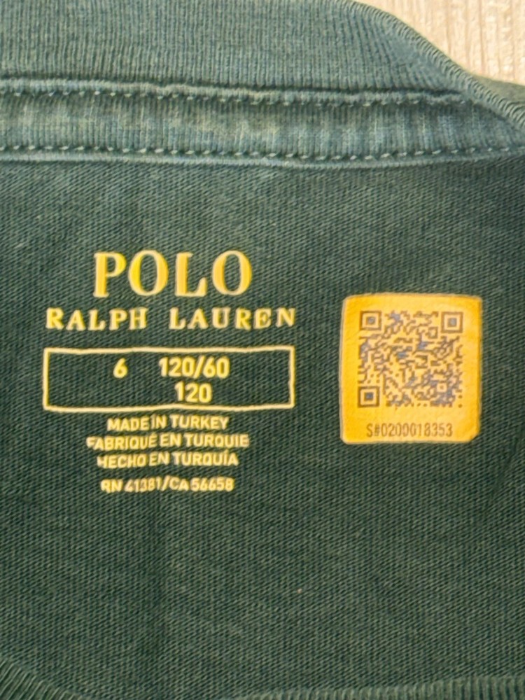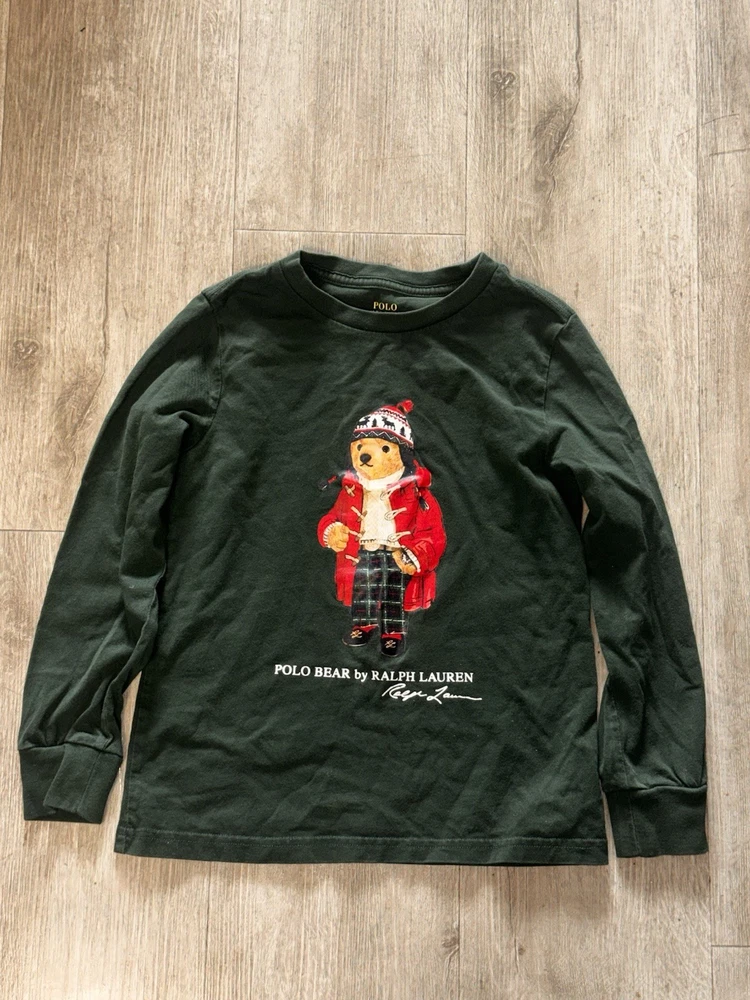 Authentic Polo Bear by Ralph Lauren long sleeve shirt featuring the iconic Polo Bear dressed in a winter/holiday outfit. Classic Ralph Lauren graphic with embroidered-style print on a deep green base. Perfect for fall/winter wear, holiday outfits, or Ralph Lauren collectors. Details: • Brand: Polo Ralph Lauren • Design: Polo Bear graphic • Color: Dark Green • Size: Kids Size 6 (per printed neck tag) • Sleeve: Long sleeve • Made in Turkey Condition: Pre-owned with light general wear. No holes, rips, or major stains noted. Print remains vibrant. Please review all photos for exact condition. Notes: Tag indicates kids sizing. Please reference photos for sizing details. Buyer pays shipping.