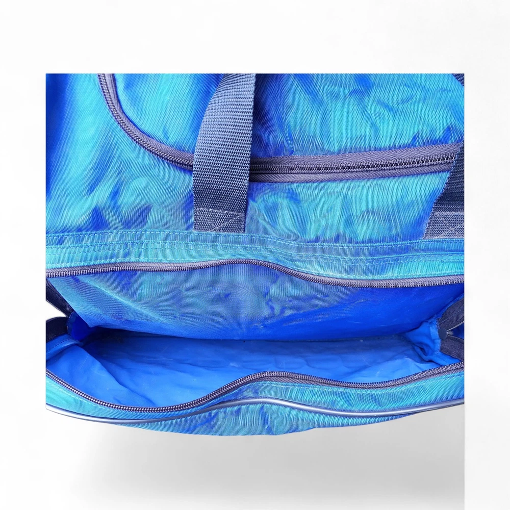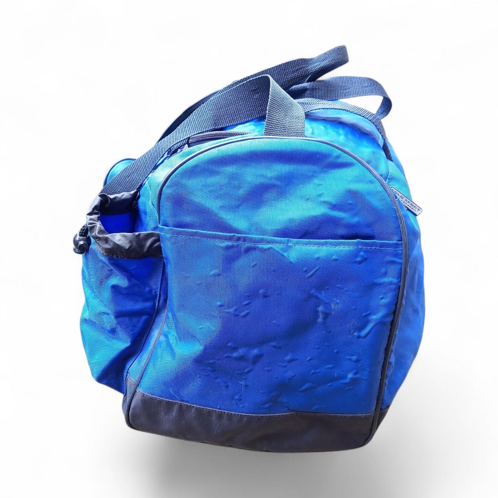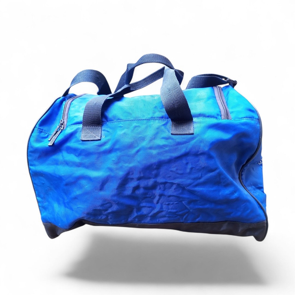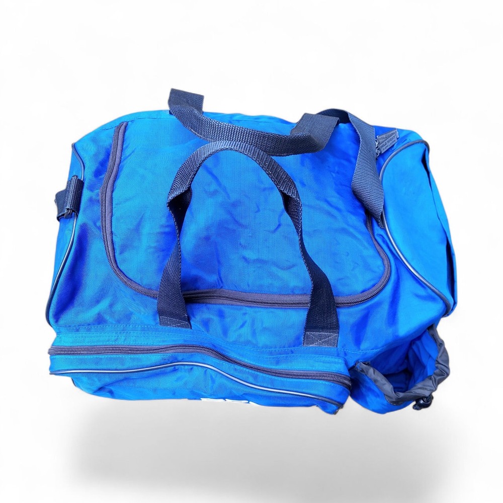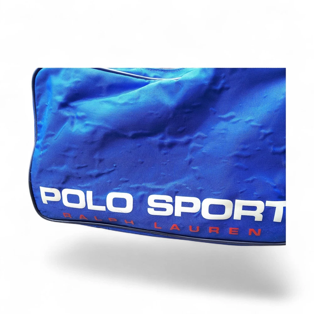 The Ralph Lauren Polo Sport Duffle Gym Bag is a stylish and spacious medium-sized bag perfect for casual occasions. Made of durable nylon material with a solid blue color and vintage design, this duffle bag features a zip closure and adjustable shoulder strap for easy carrying. The bag is adorned with the iconic Polo Ralph Lauren brand logo and is ideal for both men and women who appreciate classic American sportswear aesthetics from the 90s.