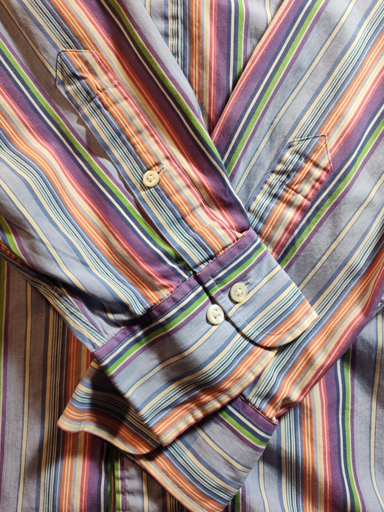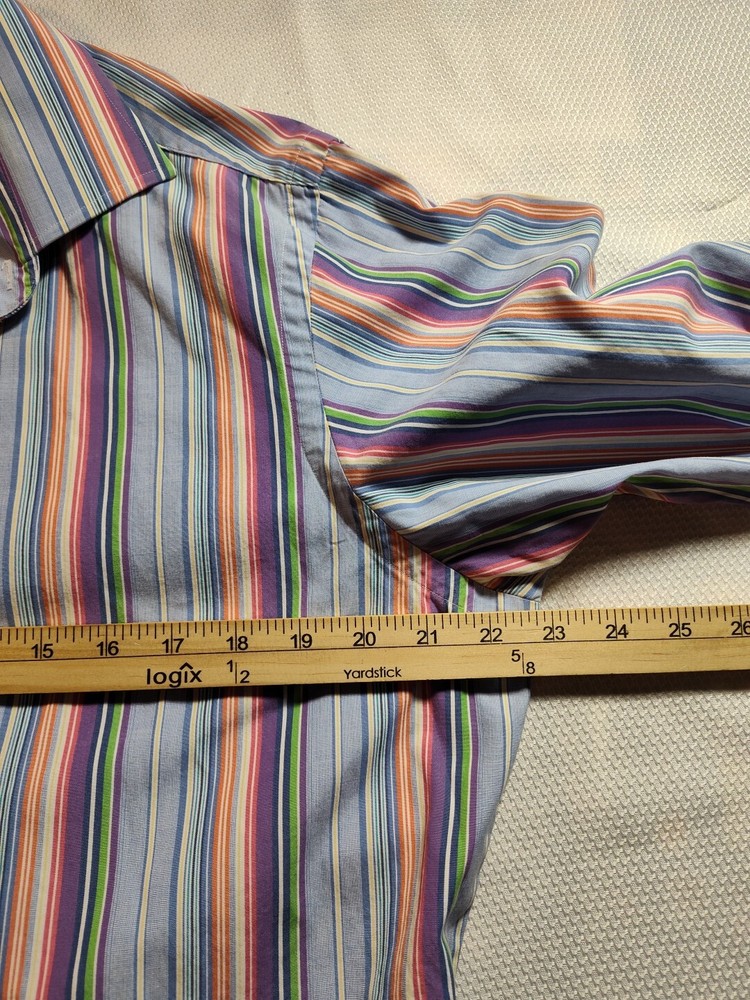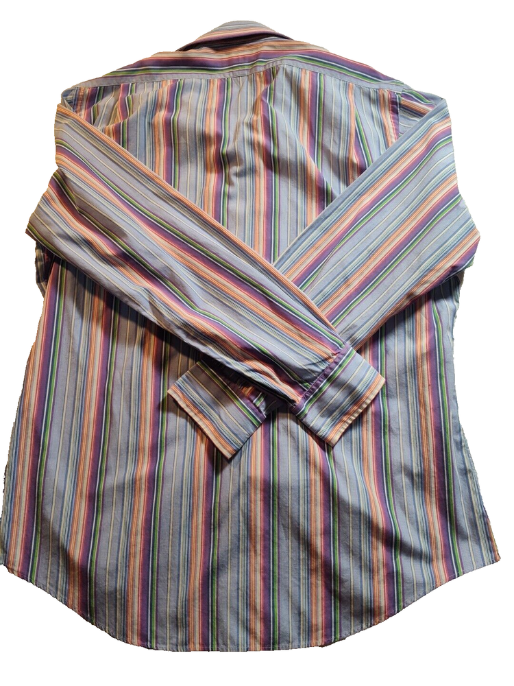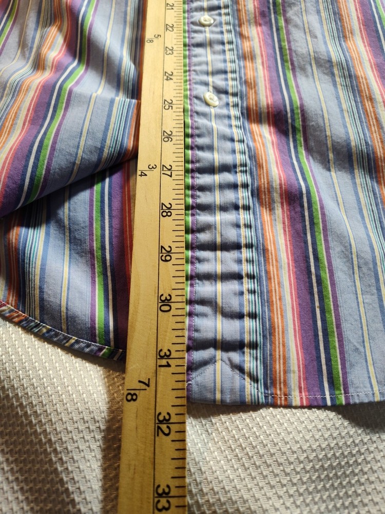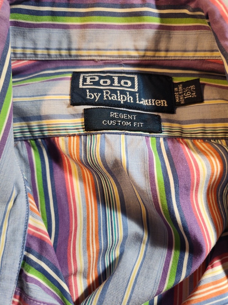 This is a Polo Ralph Lauren Regent shirt for men in size Large. Made of woven cotton fabric, it features a striped pattern in multicolors with a collared neckline and long sleeves. The shirt has a button-up closure and is designed with a Colorblock Stripe theme. Ideal for various occasions such as travel, casual, formal, or workwear, it offers a Custom Fit and is part of the Polo By Ralph Lauren Regent Shirt collection. Combined Shipping for multiple items is available upon request. We offer discount on the Shipping & Handling charge for any additional item being sent to the same address. Contact us with any issues and we will work to resolve them without delay! Satisfaction Guaranteed or Money Back with Free Returns!