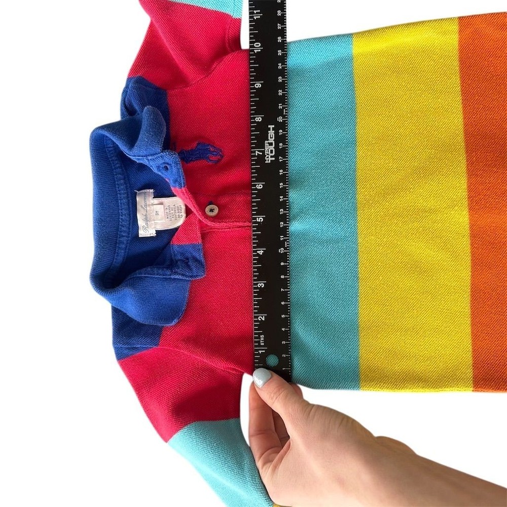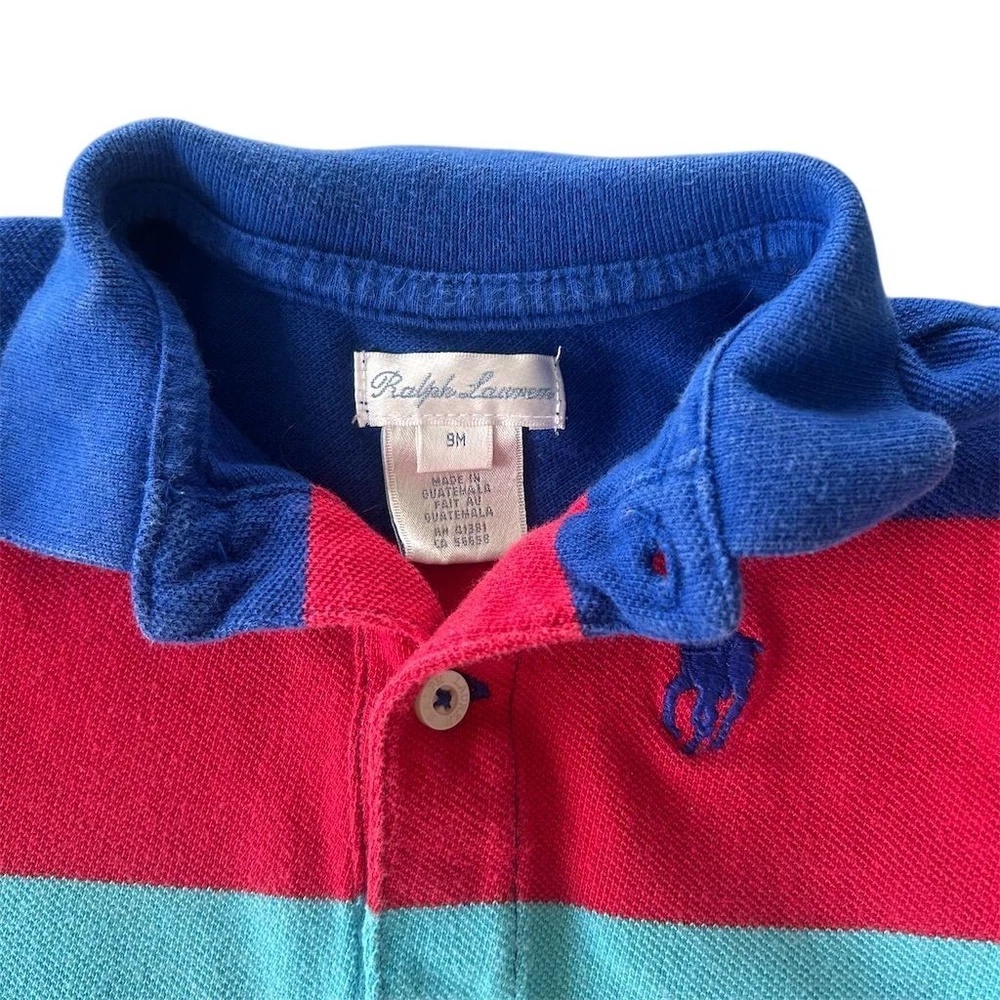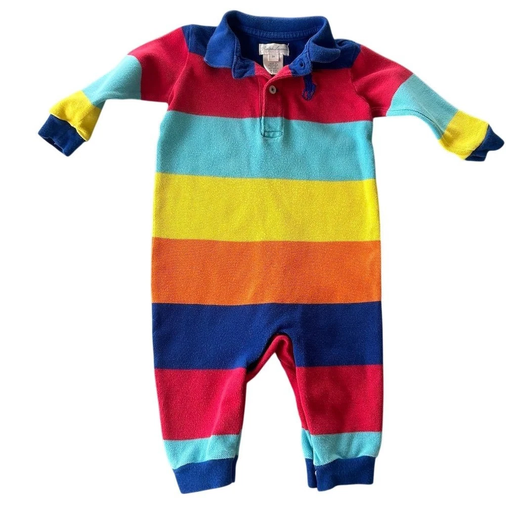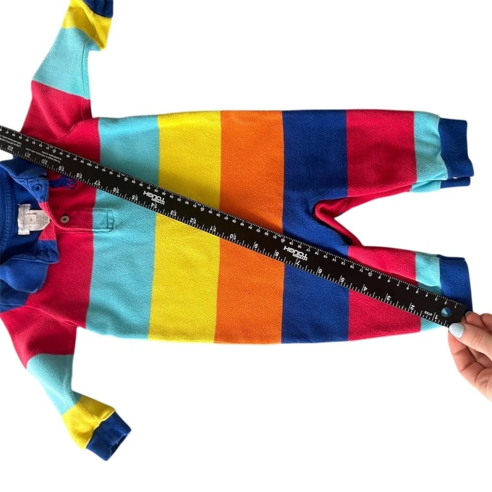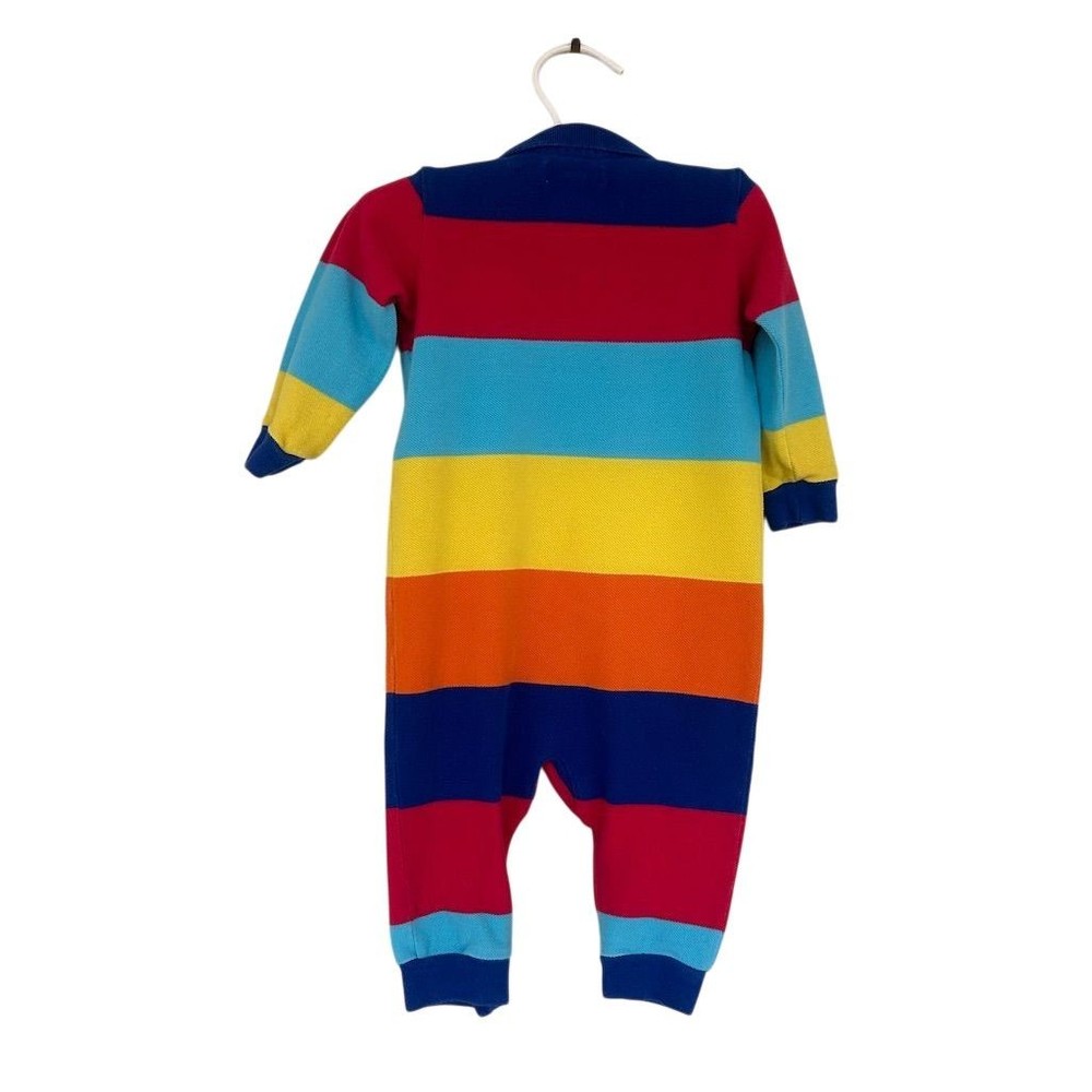 Long-sleeve polo romper features a vibrant multi-color horizontal stripe pattern in primary and pastel tones. Crafted from classic cotton mesh piqué fabric, it includes a two-button placket, ribbed polo collar, and the signature embroidered pony logo on the chest. The one-piece design is finished with ribbed cuffs and snap closures at the base for easy dressing. This item is in good pre-owned condition. Measurements: • Pit to Pit: 10" • Length: 22" • Sleeve Length: 8.5" Rainbow, Preppy, Classic, Nautical, Colorful, Dopamine Dressing, Playwear, Baby Shower Gift, Designer, Pique, Striped, Primary Colors, Long Sleeve Brand: Ralph Lauren Product Type: Romper Audience: Baby Boys Size: 9M Color: Multicolor Material: 100% Cotton Pattern: Striped Sleeve Length: Long Sleeve Neckline: Collared Closure: Snap/Button Logo: Embroidered Pony All items come from a smoke free, golden retriever dog friendly home. All of items unless NWT or Dry Clean Only are washed with Tide. We try our best to disclose any flaws with items, if we miss something please reach out and let us know.