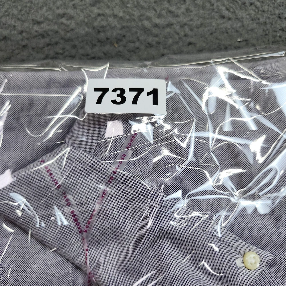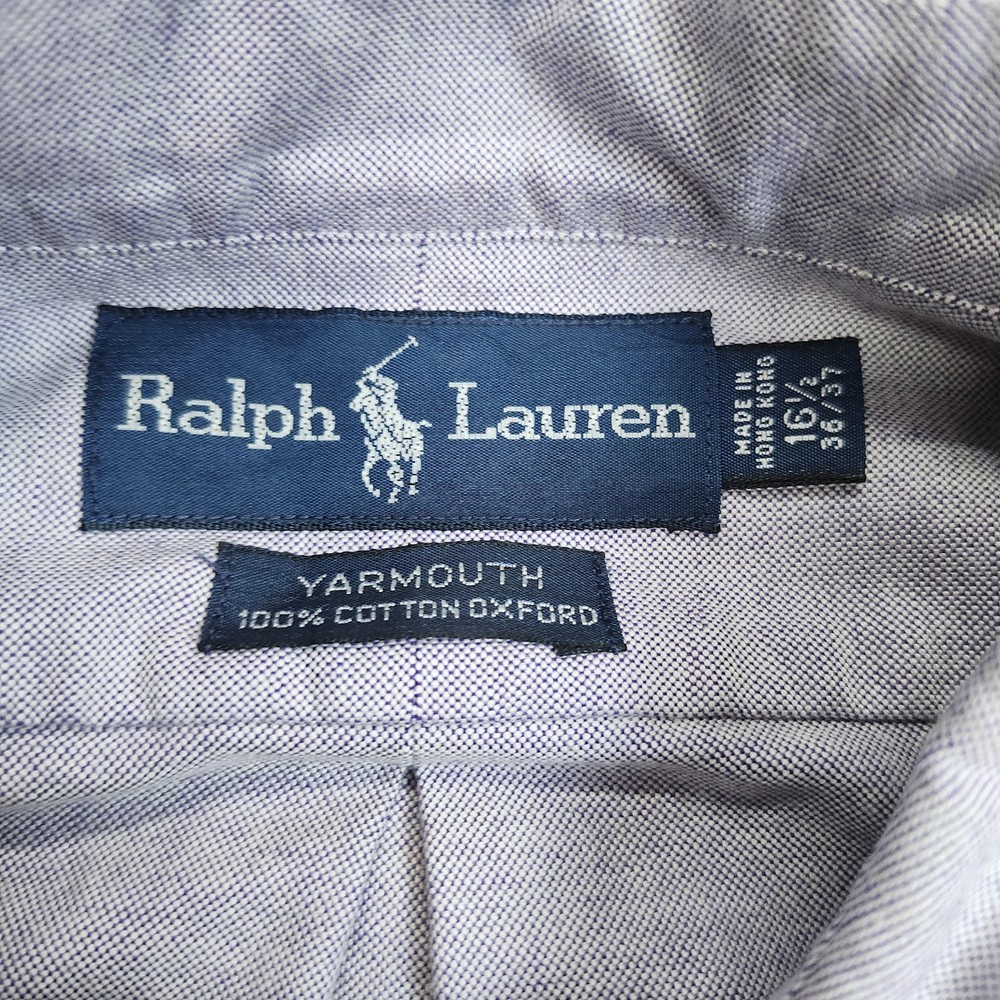 Brand: Ralph Lauren. Style: Mens long sleeve button-down collar oxford dress shirt from the Yarmouth collection. Color: Light blue woven oxford cloth with a finely textured appearance. Size: Mens 16.5 neck with 36/37 sleeve length, as indicated on the neck size tag. Material: 100% cotton oxford fabric; detailed fiber content and care instructions appear on the interior label. Country of origin: Made in Hong Kong, according to the woven neck and interior tags. Branding and labels: Navy woven neck label displaying the Ralph Lauren wordmark and polo rider logo, side tab with size and country information, and separate YARMOUTH 100% COTTON OXFORD label below the collar seam. Front design: Traditional button-front placket with a left chest embroidered polo player logo in multicolor thread. Back design: Solid blue back panel with a center box pleat beneath the yoke for ease of movement. Fit and silhouette: Classic fit oxford shirt with a button-down collar, long sleeves, and a curved shirttail hem designed to be worn tucked in. Features: Woven cotton oxford fabrication, front button closure, button-down collar points, barrel cuffs with adjustable buttons, and signature chest pony logo embroidery. Intended use: Suitable for business and office wear, dress-casual occasions, or layering under sweaters and blazers. Additional details: Shirt is photographed laid flat on a textured surface with a measuring ruler visible in some images for size reference; the final photo shows the garment folded inside a clear poly bag labeled with inventory sticker number 7371 for organizational purposes.