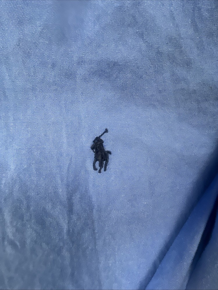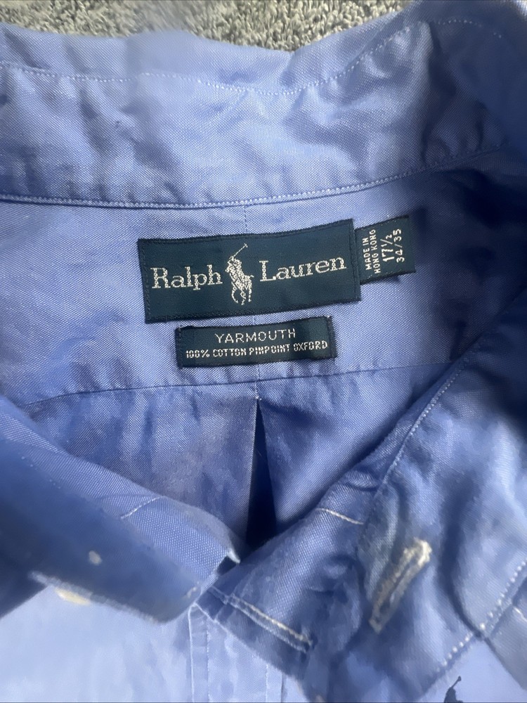 The product is a men's Ralph Lauren Yarmouth button-down dress shirt in size 17.5 and a regular fit. Made from 100% cotton with a blue striped pattern, this classic oxford shirt features a collared neckline and long sleeves with barrel cuffs. Ideal for formal occasions, this shirt exudes timeless style and quality craftsmanship synonymous with the Ralph Lauren brand.