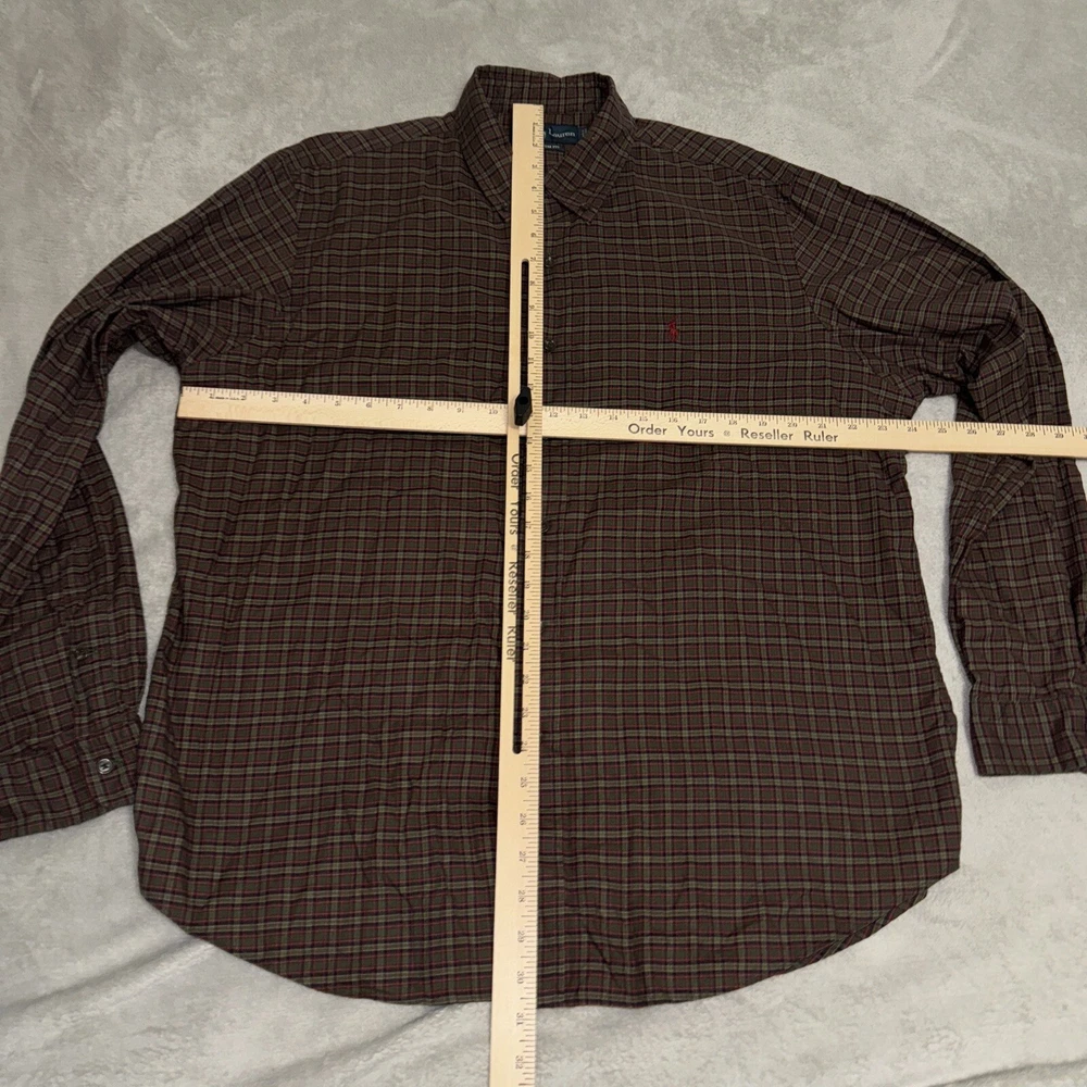 Elevate your wardrobe with this stylish Ralph Lauren shirt in size XL. The green plaid pattern and embroidered accents add a touch of preppy sophistication to this collared button-down shirt. The shirt is made of heavyweight woven cotton fabric, making it suitable for all seasons. Perfect for any occasion, whether it be travel, party/cocktail, or casual wear, this Ralph Lauren shirt is a must-have addition to your closet. The shirt features a button-down collar style and long sleeves, making it a versatile piece for any season. Machine washable for easy care.