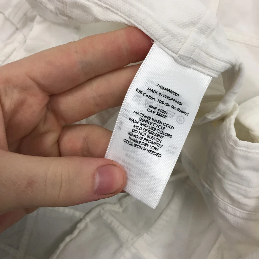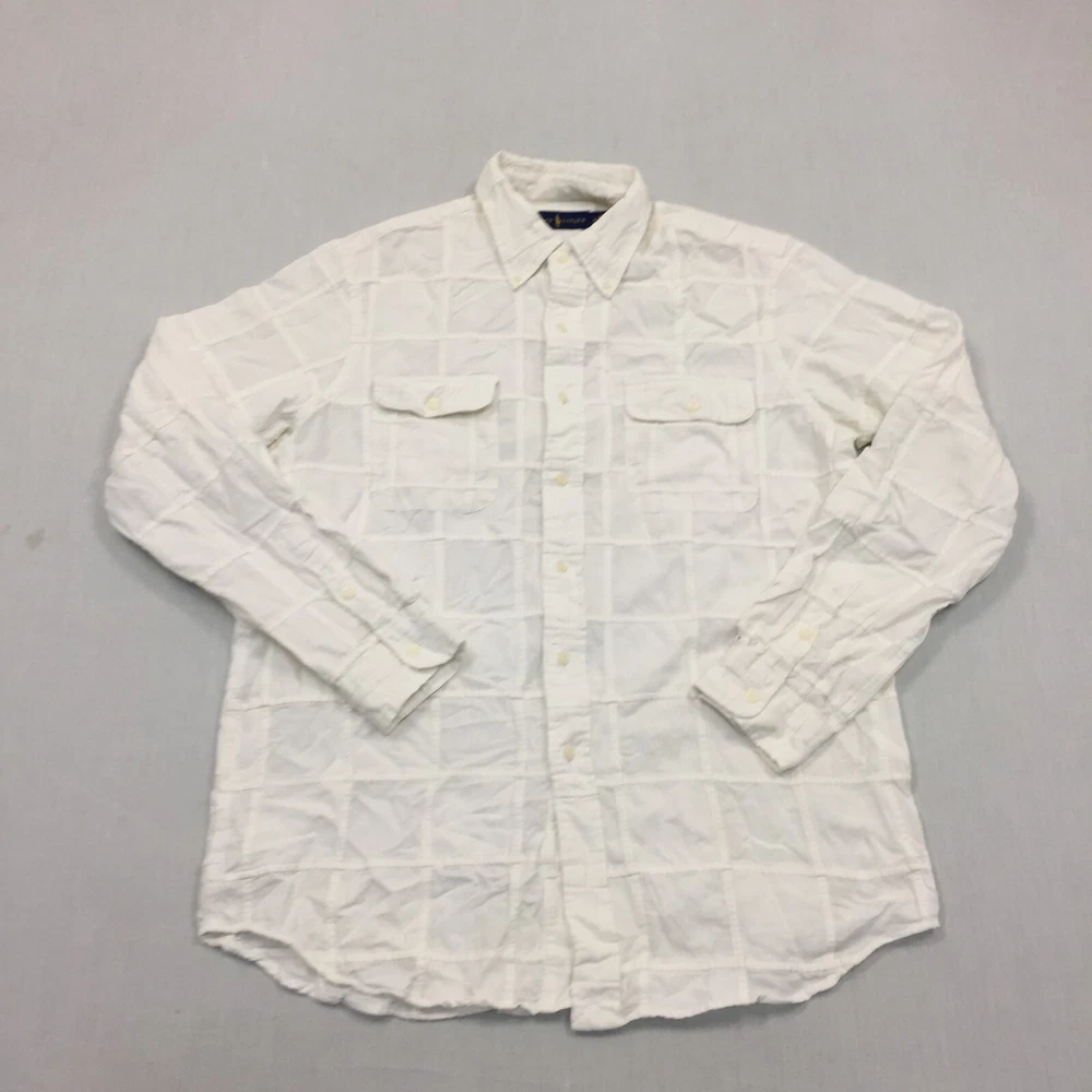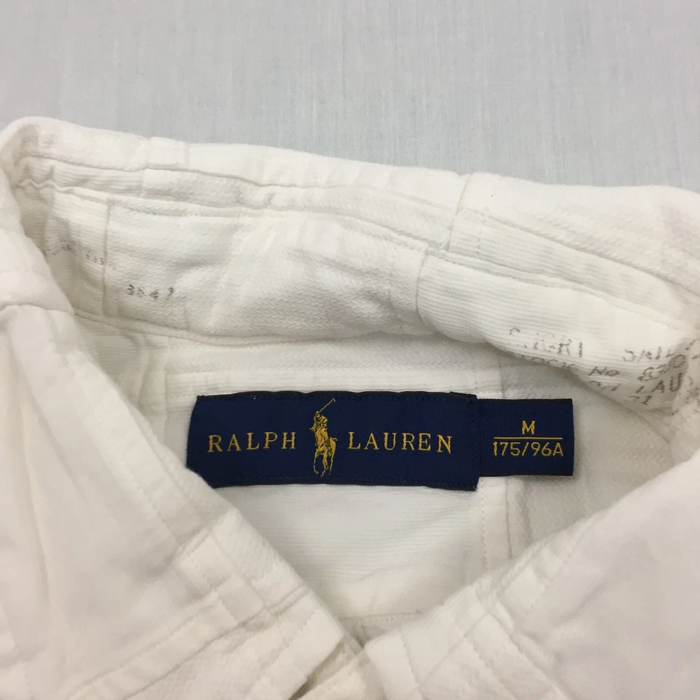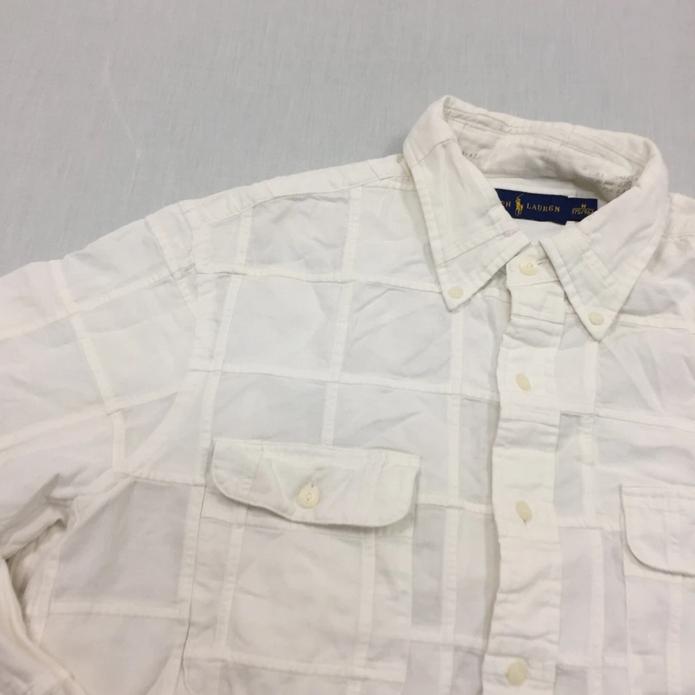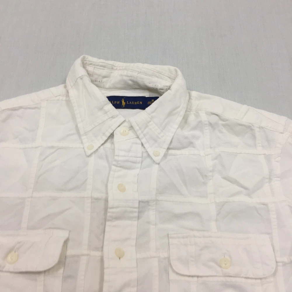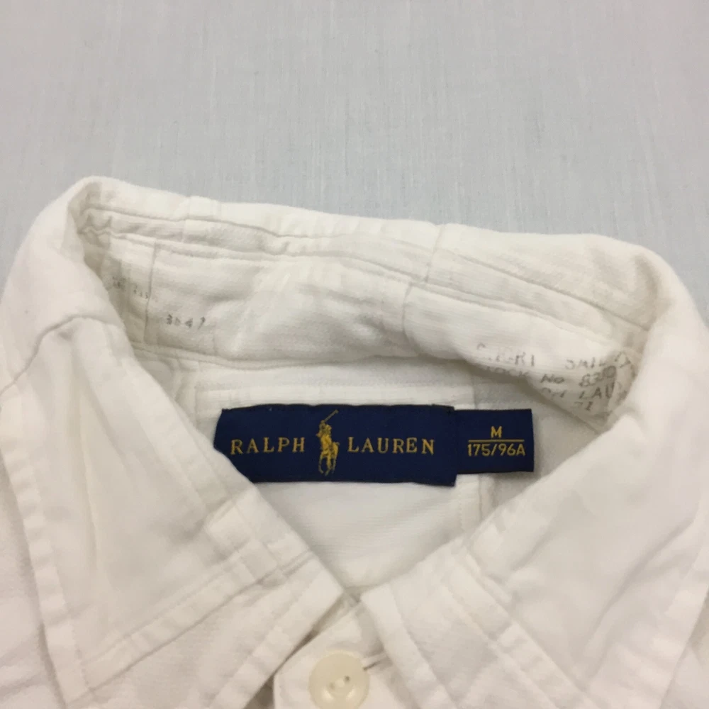 Handmade: No Vintage: No Season: Autumn, Spring, Summer, Winter Features: All Seasons Accents: Button Garment Care: Machine Washable Type: Button-Up Collar Style: Button-Down Seller Notes: “Good used condition, check below for full description & photos.” Neckline: Collared Theme: Classic Country/Region of Manufacture: Unknown Occasion: Business, Casual, Formal Fabric Type: Canvas Department: Men Closure: Button Personalise: No Sleeve Length: Long Sleeve Material: Cotton Blend, Silk Fit: Regular Colour: White Brand: Ralph Lauren Size: M Size Type: Regular