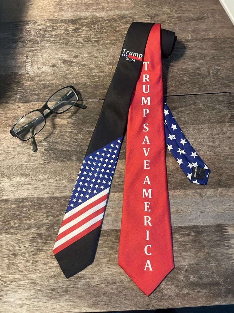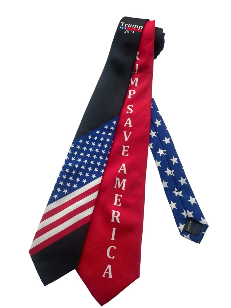 Ralph Marlin Men's Vote Trump 2024 United States Election Republican GOP USA Stars Stripes Flag Necktie | Red, White, Blue | Neck Tie Front of tie is made up of two pieces: red tie is 3 inches wide with the letters slogan Vote Trump 2024 celebrating Americas 45th president, Donald Trump, while top tie features the American flag and is 2 1/2 inches wide. Finally, the ties tail is a pattern of white stars on a the flag blue background. You will love this one.. just let it fly! Features Front of tie is made up of two pieces: red tie is 3 inches wide with the letters slogan Vote Trump 2024 celebrating Americas 45th president, Donald Trump, while top tie features the American flag and is 2 1/2 inches wide. Finally, the ties tail is a pattern of white stars on a the flag blue background. You will love this one.. just let it fly! Standard size length tie for men : 57 inches long Proudly patented as The 3D Tie : a Ralph Marlin original design! Fast and Free Shipping You're already purchasing the item. Why pay additional for shipping, especially slow shipping? We get your order shipped out within 1-business day and delivered to your doorstep as quickly as possible. Competitive Pricing With our dynamic pricing model, our prices are always competitive. Our prices are some of the lowest that you will find on the internet. Rest assured that you're getting a good deal when purchasing with us. 30-day Money Back Guarantee We are committed to making sure that you leave this transaction satisfied. If you're unhappy with the product for any reason, you may return it back for your money-back or a replacement within 30 days. No questions asked!