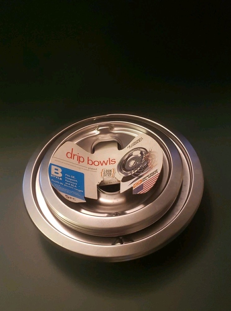 Item(s) in pictures and description are sold as is. Any known issues will be stated. Feel free to message me anytime if you have any questions or need additional images. Response time usually within 8 hrs. Thank you. The Range Kleen 5 Piece Drip Pan Set Size B is a high-quality kitchen accessory designed for electric cooking appliances. Made of durable stainless steel, these drip pans are compatible with GE, Hotpoint, Kenmore, and RCA ranges. The set includes 5 pans, each with a glossy silver finish, making them both functional and aesthetically pleasing. Suitable for cooktops, these drip pans are the perfect addition to your kitchen for catching any spills or drippings during cooking. Made in the United States by Range Kleen Manufacturing, Inc., these drip pans are a reliable and convenient addition to your cooking appliance.