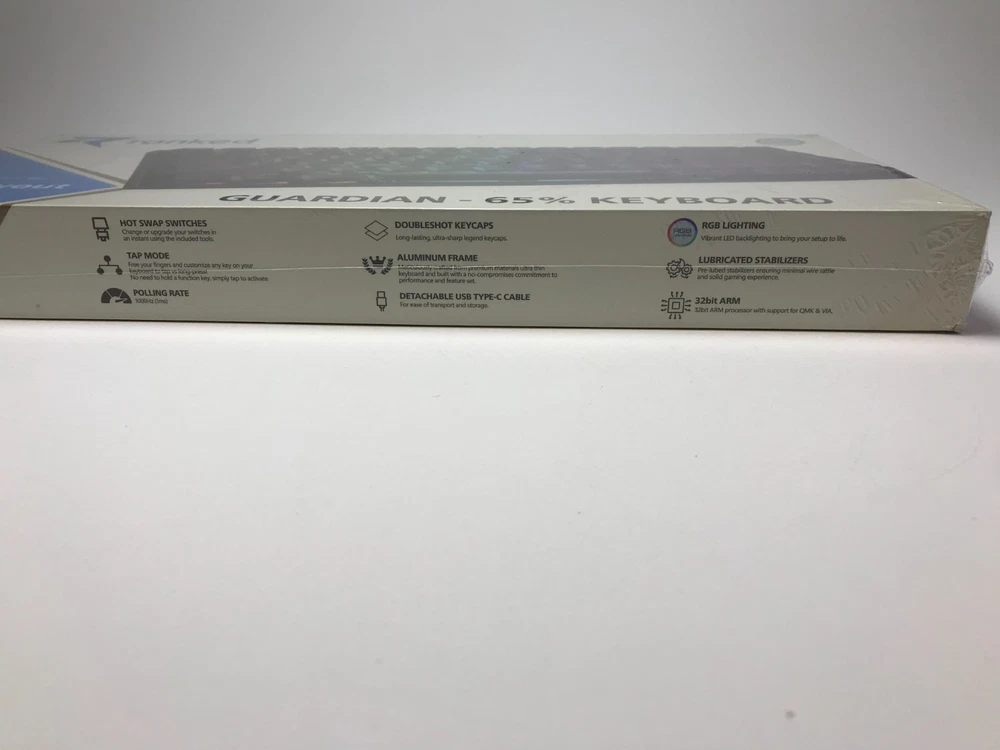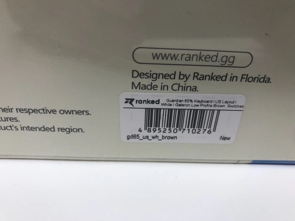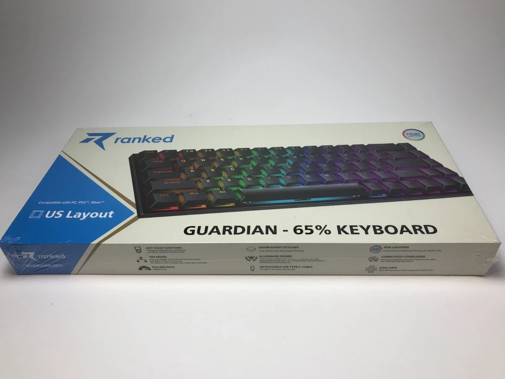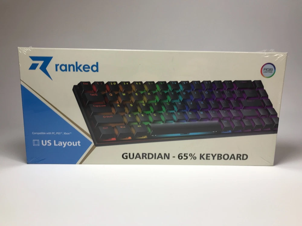Brand New / Factory Sealed. Ranked Guardian g65 low-profile mechanical gaming keyboard in ANSI US layout. Compact 65% style that saves desk space but keeps the keys most people actually use. Aluminum body, smooth low-profile feel, and full anti-ghosting for gaming or fast typing. Item specifics + key specs Brand/Model: Ranked Guardian g65 Layout: ANSI US (US International) Keys: 68-key compact (65% style) Switches: Gateron brown mechanical (tactile) Case material: Aluminum Keycaps: ABS doubleshot Features: Full N-Key Rollover + Anti-ghosting Software: Supports Ranked Utility software Connection: Wired USB (plug & play) Cable length: 1.5 m (5.2 ft) Size: 12.2 x 5.2 x 0.7 in (311 x 101 x 20 mm) Weight: 1.1 lb (0.5 kg) Includes: Factory sealed keyboard