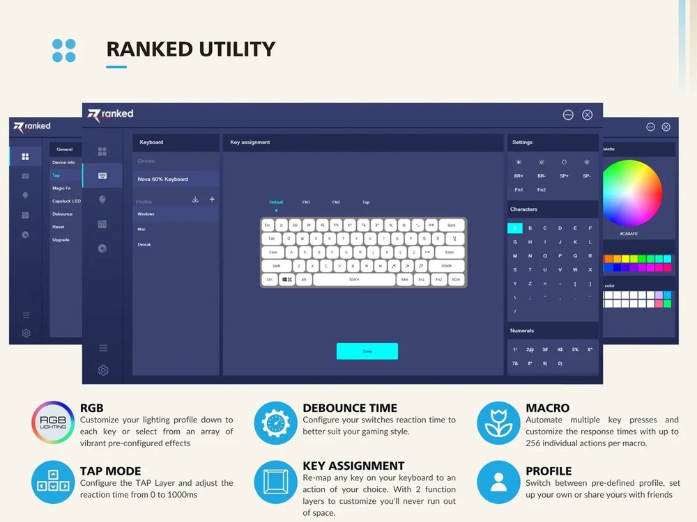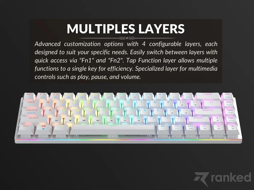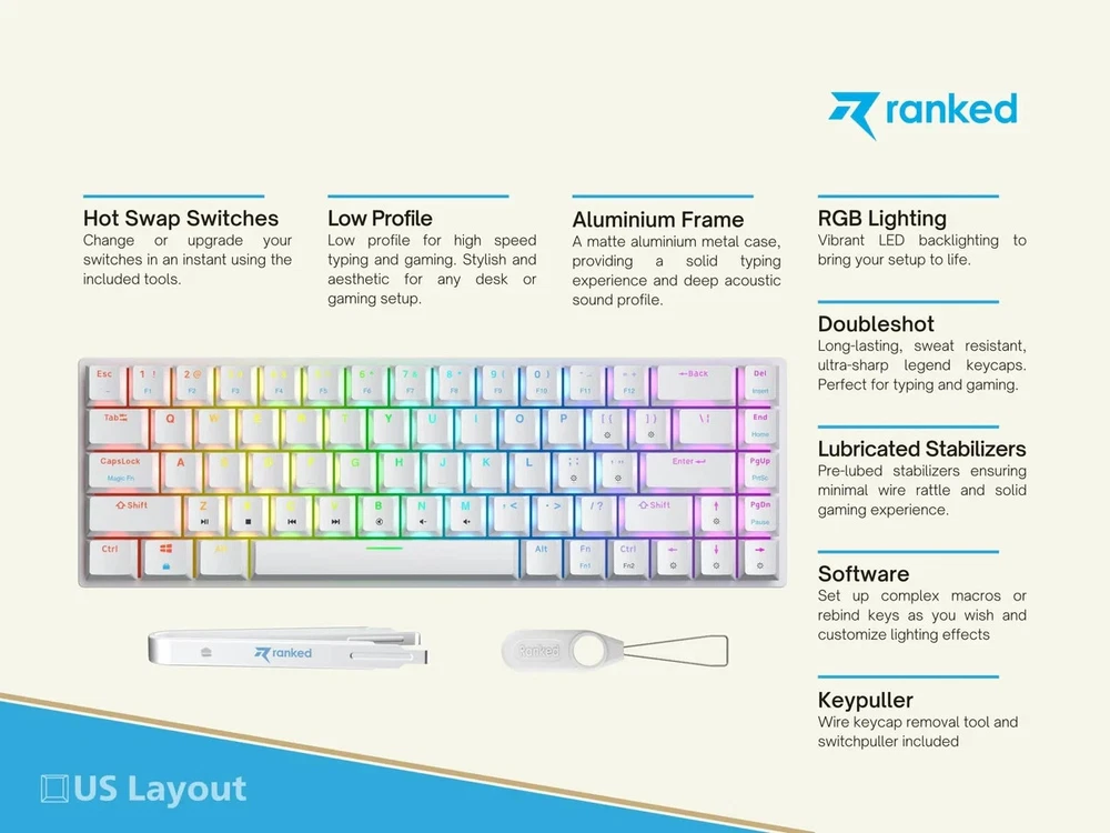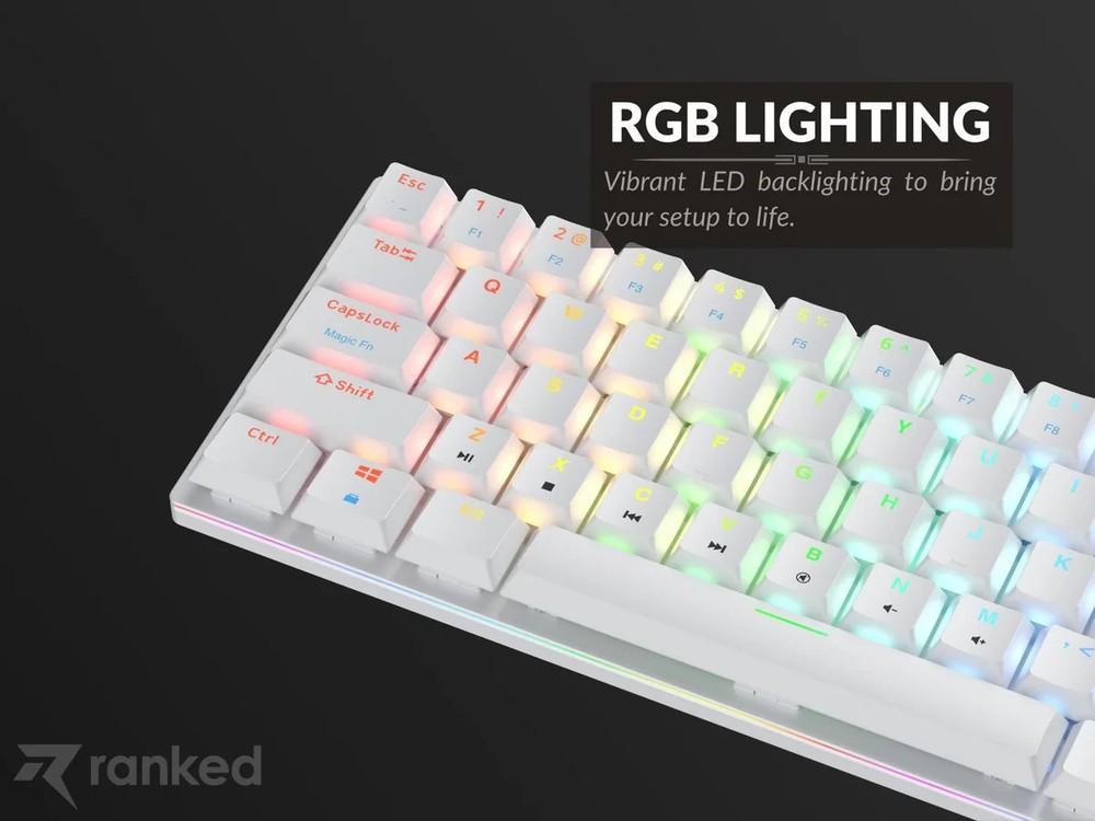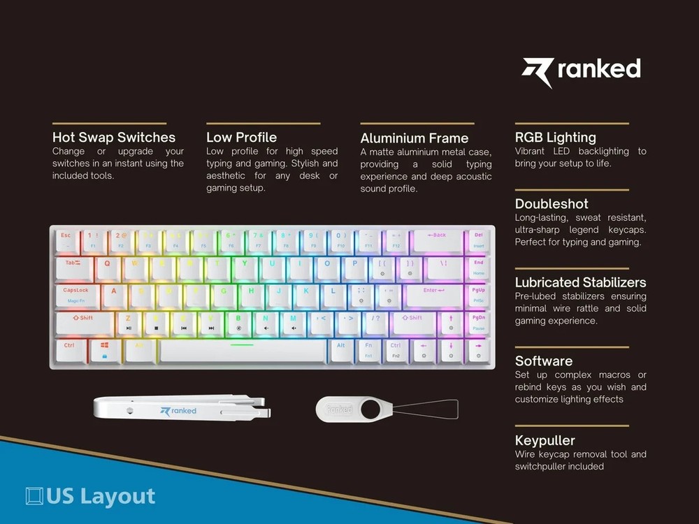 Brand New / Factory Sealed. Ranked Guardian g65 low-profile mechanical gaming keyboard in ANSI US layout. Compact 65% style that saves desk space but keeps the keys most people actually use. Aluminum body, smooth low-profile feel, and full anti-ghosting for gaming or fast typing. Item specifics + key specs Brand/Model: Ranked Guardian g65 Layout: ANSI US (US International) Keys: 68-key compact (65% style) Switches: Gateron brown mechanical (tactile) Case material: Aluminum Keycaps: ABS doubleshot Features: Full N-Key Rollover + Anti-ghosting Software: Supports Ranked Utility software Connection: Wired USB (plug & play) Cable length: 1.5 m (5.2 ft) Size: 12.2 x 5.2 x 0.7 in (311 x 101 x 20 mm) Weight: 1.1 lb (0.5 kg) Includes: Factory sealed keyboard
