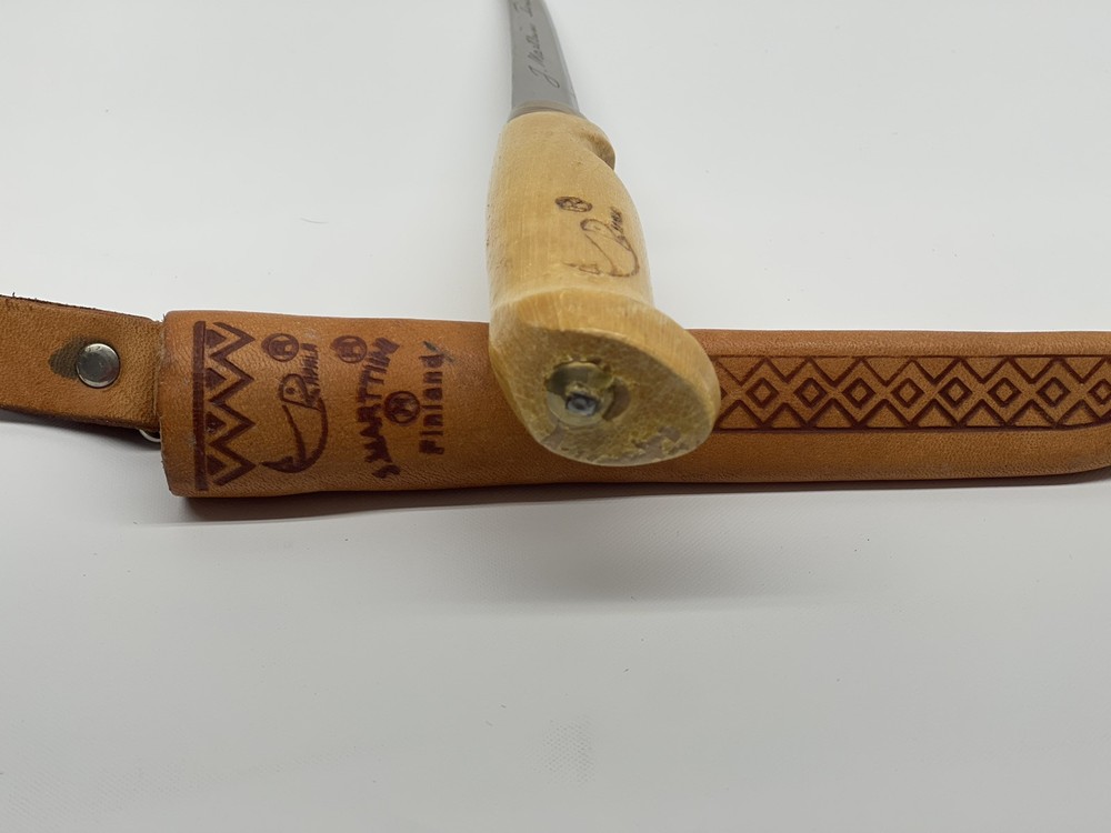 The product is a Rapala J. Marttiini fillet knife made in Finland with a stainless steel blade and a wood handle. It comes with a leather sheath for storage and has a trailing point blade edge. This fillet knife is designed for fishing use and is over 5 inches in length. It features an encapsulated tang for durability and is suitable for both left-handed and right-handed users.