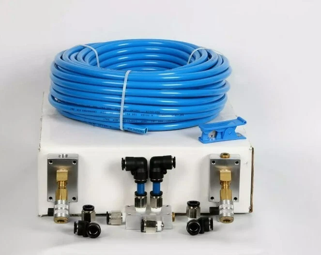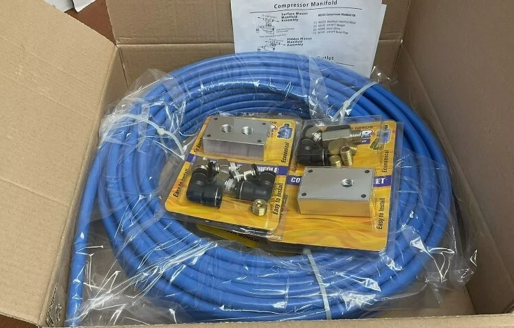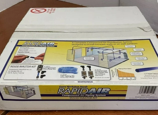 This Rapid Air Garage Shop Compressed Air Line Kit 90500 is the perfect addition to your workshop equipment. It comes with everything you need to set up a compressed air line in your garage or shop. The kit includes a compressor, hoses, and fittings, making it easy to install and use. The brand of this kit is RAPIDAIR, known for their high-quality air tool kits and air compressors. It falls under the categories of Air Tool Kits, Air Tools & Air Compressors, Tools & Workshop Equipment, and Home & Garden. With this kit, you can inflate tires, power pneumatic tools, and other tasks with ease. Description RapidAir Home Garage Nylon Tubing System The best, most efficient DIY compressed air solution for the home garage or workshop. This kit includes all you need to set your space up for convenient compressed air piping. RapidAir Master Kit Includes: (3/8 I.D. X 1/2 O.D nylon tubing) (1) 20100 100 ft. Rapidair Tubing and cutter (2) 90120 Aluminum Outlet Block (1) 90220 Aluminum Manifold Block (6) 50100 3/8 NPT Straight (4) 50300 Union Elbow (2) 50120 Hand Valve (2) 50125 1/4 NPT Brass nipple (2) 50130 1/4 NPT Brass 45 degree (3) 50135 3/8 NPT Brass Plug Perfect for: Your home garage or workshop Hobbyist woodworking applications Powering your personal tools Easy in wall or on wall installation Single air users