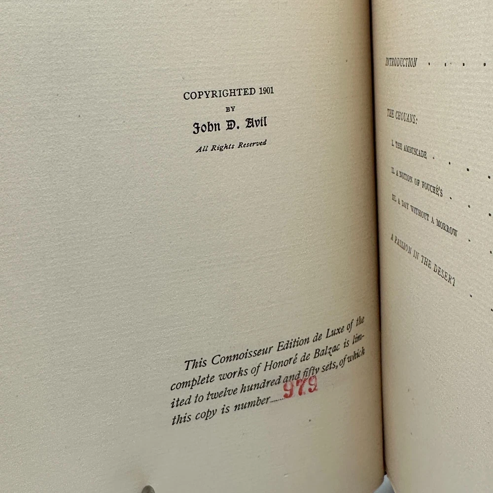 This limited edition, No. 979 of only 1,250 copies. A classic historical novel , The Chouans is Balzac’s first full-length work, weaving romance, war, and political intrigue during the French Revolution. This rare 1901 Connoisseur Edition de Luxe by Avil Publishing Company is one of only 1,250 copies produced . Translated by Ellen Marriage , this edition remains uncut , with original deckled edges and a sturdy green cloth hardcover with a paper spine label . A must-have for collectors of rare French literature and fans of historical fiction !