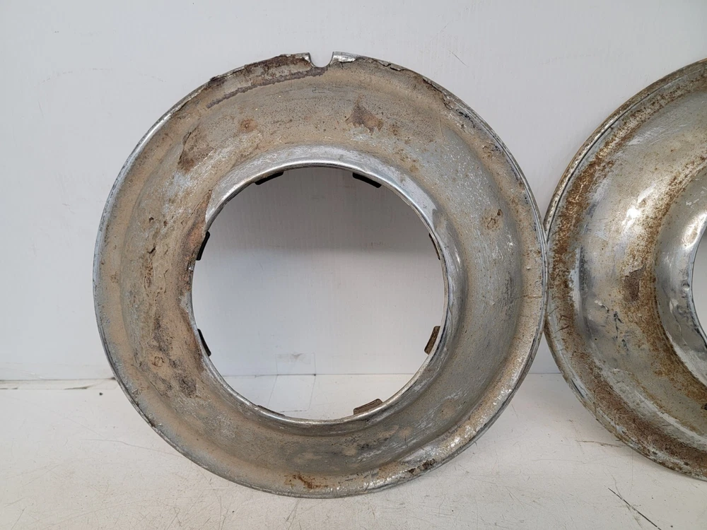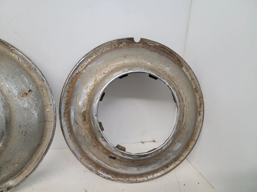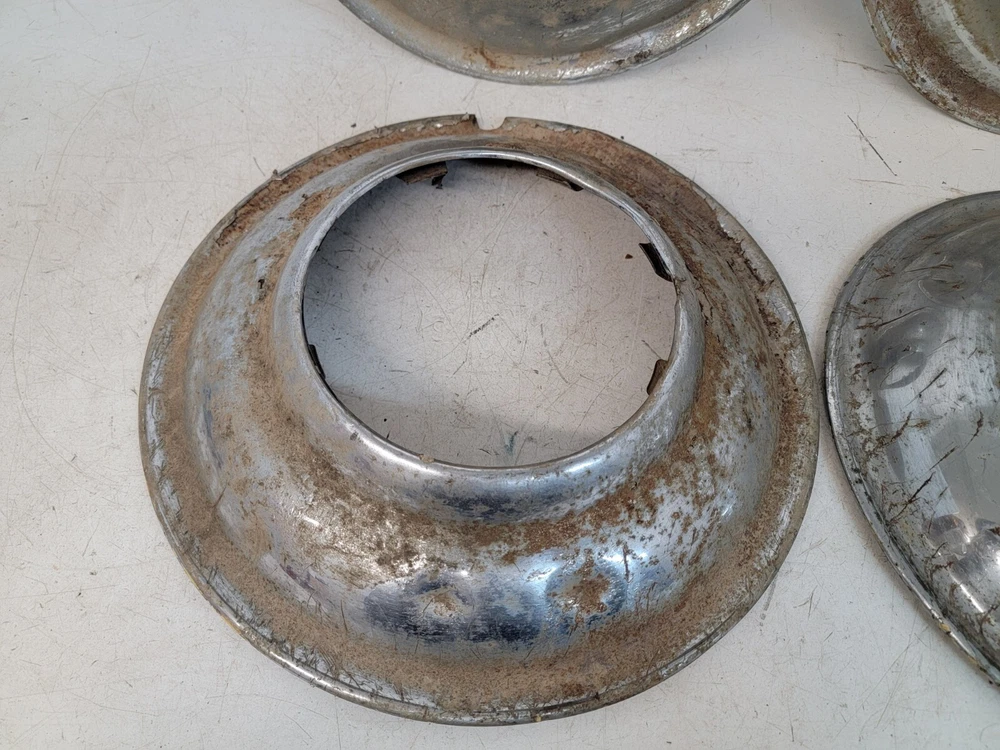 Hello, this listing is for a rare set of (4) vintage wire wheel cover discs that fit on a 1935 Ford 16-inch wheel like shown. The wheel in the pictures is not included, it is only shown so you can see how they fit. They are beat up and have peeling chrome. They would look great on a survivor hot rod as they sit, or go ahead and restore them for your show car. I'm not positive if these were made by Lyon. There is a partial manufacturer stamp on the one of them as-shown. Please ask any questions first, thank you.