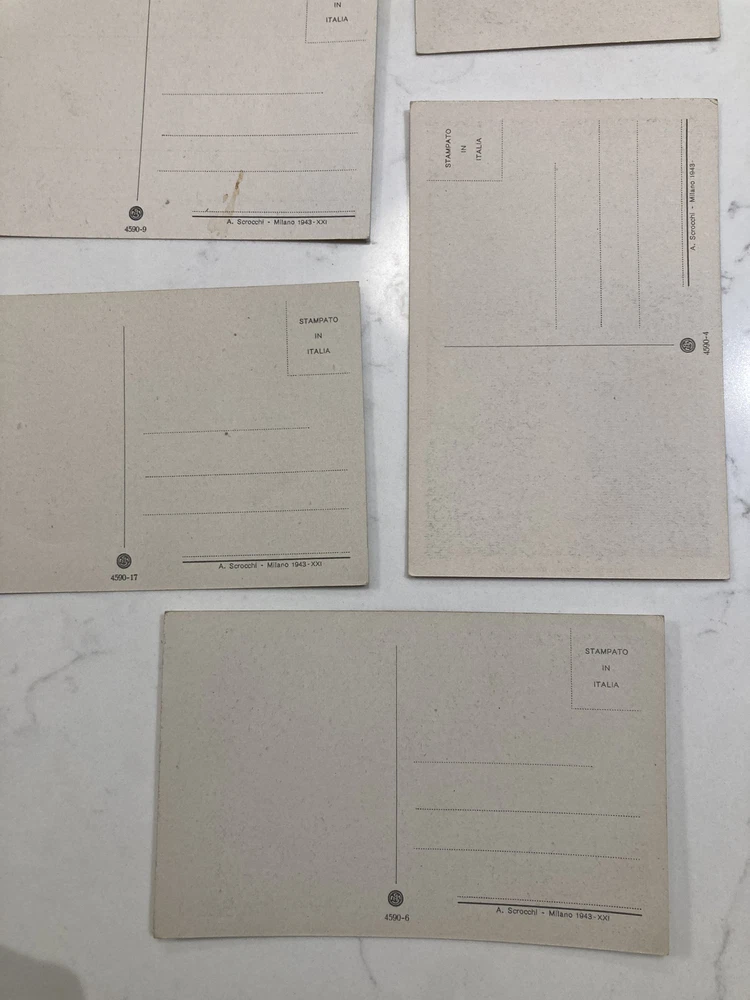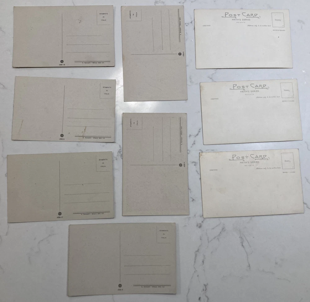 Condition All postcards are unused and unposted. They show light age-related toning and handling consistent with stored paper items, but remain clean and presentable overall. No writing, stamps or postmarks. Please examine all photographs carefully, as they form part of the condition report. Description A well-matched group of 9 unused postcards, offered together as found. The lot consists of 6 Italian scene postcards dated 1943, with captions in Italian, showing period views produced during the Second World War. These are clearly wartime issues and survive unused, which adds to their appeal. Also included are 3 English scene postcards. These are undated, but were found together with the Italian examples and are believed to be from a similar era based on style, paper and printing. While no date can be confirmed, they sit very naturally within a wartime or immediate post-war context and complement the group well. All 9 postcards have been kept unused with blank backs and remain in original condition. Groups like this are popular with collectors of wartime ephemera, vintage postcards and social history material, particularly where items have remained together. Sold as a single group of 9 postcards. The photographs show the exact items you will receive and form part of the description.