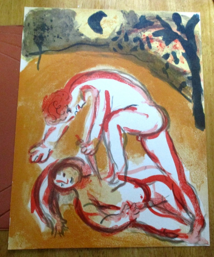 This is a Rare Lithograph Marc Chagall Cain and Abel From Drawings from the Bible 1960we are listing from a N.Y. estate. From Illustrations for the bible,Verve Teriade,1960. This art measures 12" x 10". There is a small fold in the lower corned and tiny split on the border.