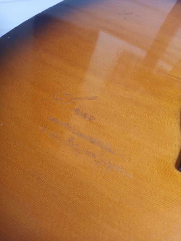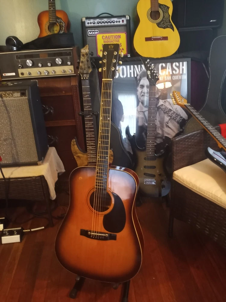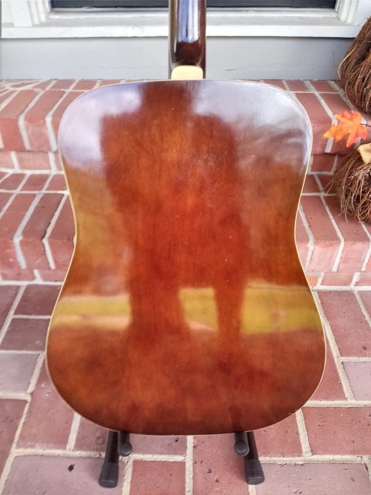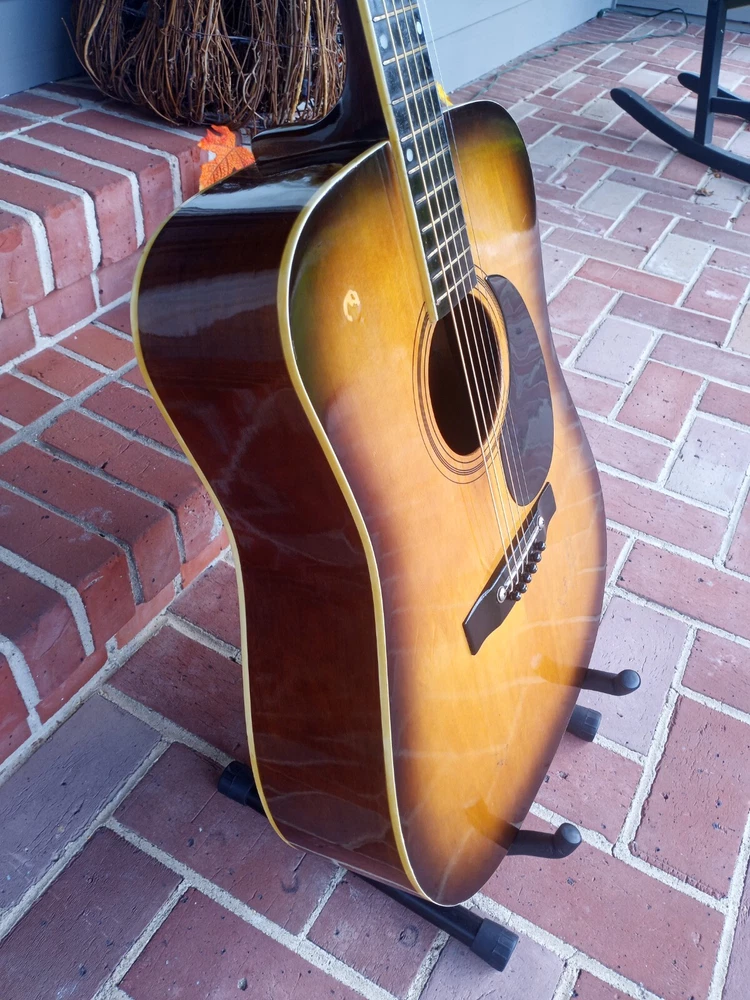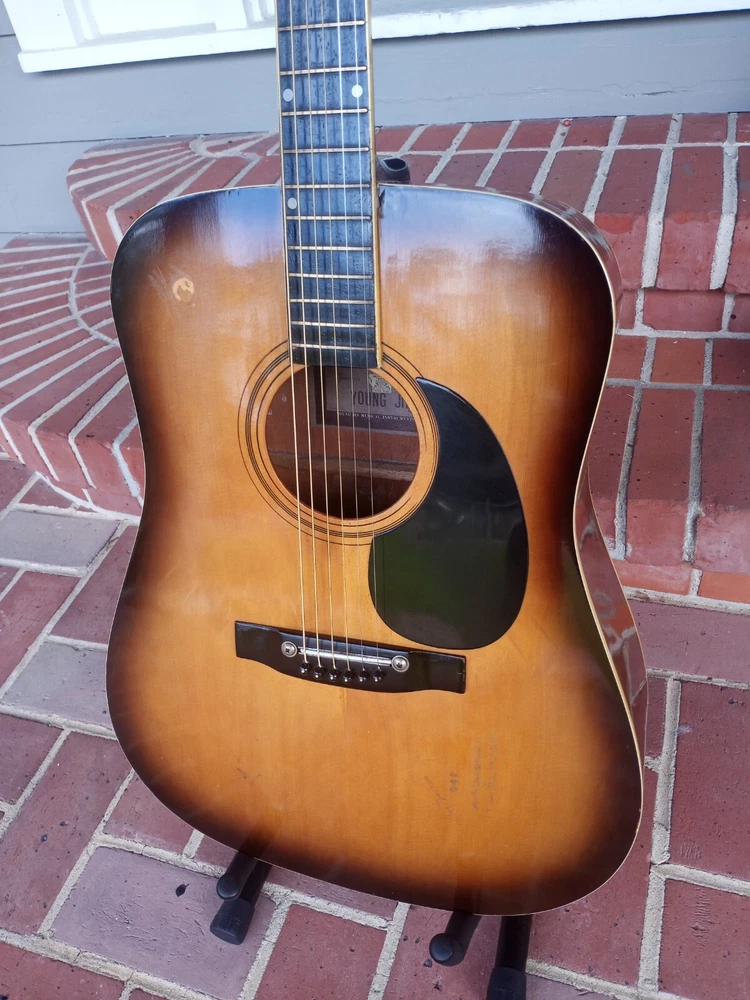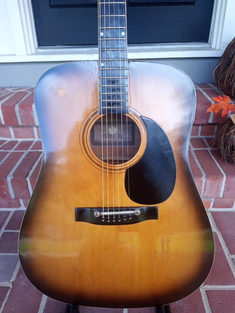 Rare early 1960s Yamaha Youn-Gin Dreadnought. Not alot of info out there on these guitars. What I have read over the years is they were made in 1962/63 for Yamaha by Young-Gin guitars in South Korea. These were supposed to be Yamaha's early entry in budget guitars. Young-Gin guitars has a good reputation in Korea for higher quality budget guitars. However I belive there was no trade agreements with China or Korea at that time and not alot of these guitars made it to the states. If your a Yamaha fan like me this is a nice addtion to your collection that plays and sounds great as well. The guitar it's self is in great structural and mechanical shape with a few cosmetic issuses. Guitar measures at 41" lenght, 12" widest point at top bout and 15 1/2" widest at bottom bout. 4" dept at top and 4 1/2" dept at bottom. 25 1/2" play scale. 20 frets with a zero fret. All smooth on the ends with only lite ware. Neck is thin and taperd making it very fast. Nut size 1 5/8". Just installed new set of D'Addario 12/53s strings. Action is 4.5mm at the 12th fret. No buzzing or dead spots. 3 + 3 open gear tuners are nice quality and hold tune well after new string break in. Very well built high quality binding work front and back of body. Guitar has no wood damage of any kind, No crackes, no seperations, no pull on bridge, No bulging of body. All bracing is tight, no hidden repairs. Bridge is level with no crackes. When I first bought the guitar it had a frat medal gluded to the upper left part of body. When medal was removed it took the finish with it. See last 3 pictures. Guitar also had some sort of message wrote on the front lower right side ( see last 3 pictures ) and looks as if someone tryed to preserve it with some sort of clear coat. Back of guitar has only very lite swirling and lite finish scratches that are hard to see. Over all condition of this 60 year all guitar is very good..Nice collectable and very playable guitar. Does not have case but will use extreme caution when packing for shipment. Happy to answer any questions. Standard shipping is inside 48 states only. UPS ground or FedX home depending on delivery area.