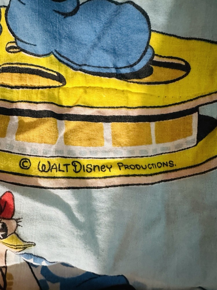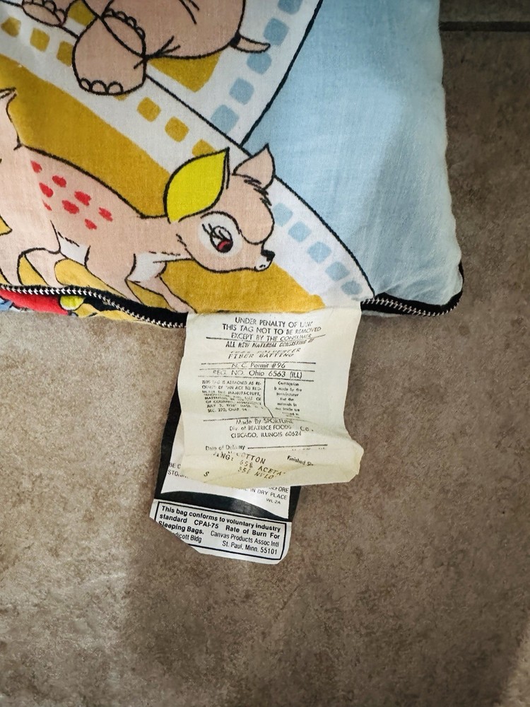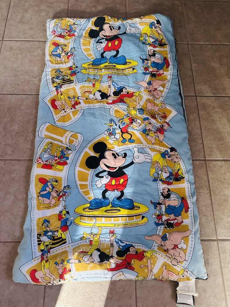 The Rare 1970’s Vintage Walt Disney Remembers Sleeping Bag is a nostalgic and collectible item featuring Mickey Mouse as the main character. This pictorial sleeping bag in a multicolor design is made of nylon and 100% cotton materials, measuring 39” x 64”. With a zip closure and machine washable for easy care, this Disney themed item is perfect for kids and perfect for adding a touch of vintage charm to any bedroom. Made in the United States, this unique sleeping bag is a must-have for any Disney fan or collector.