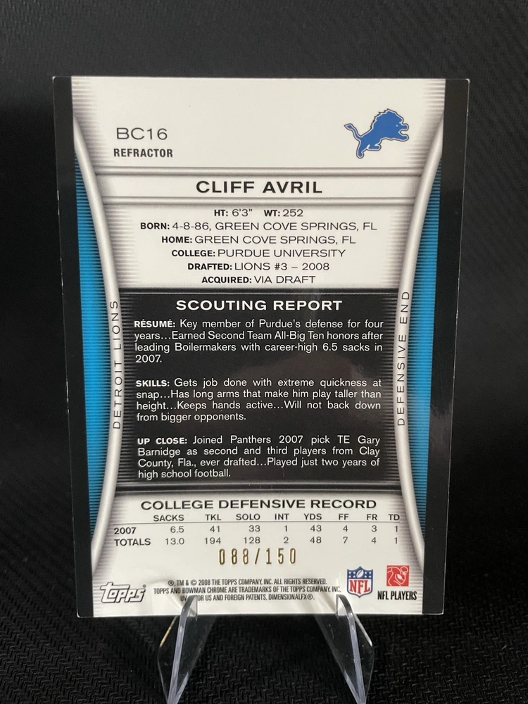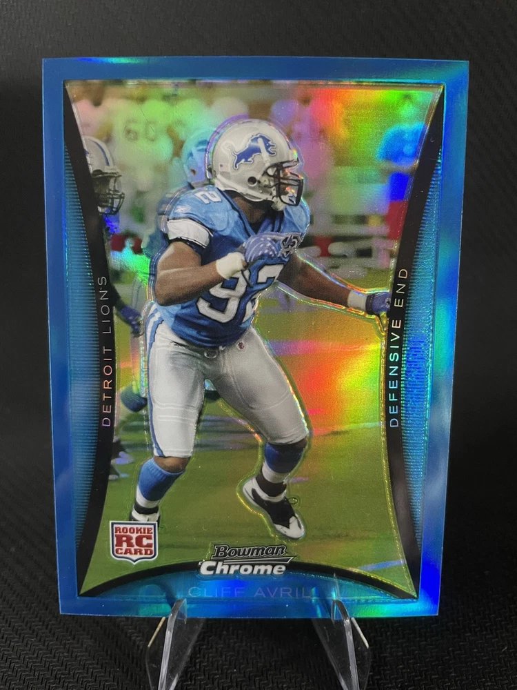 This auction is for a rare blue Topps Bowman Chrome refractor 088/150 of Cliff Avril of the Lions. Card conditions as shown in pictures, excellent small surface scratches / slight whitening on corners. Will be shipped via eBay's standard envelope.