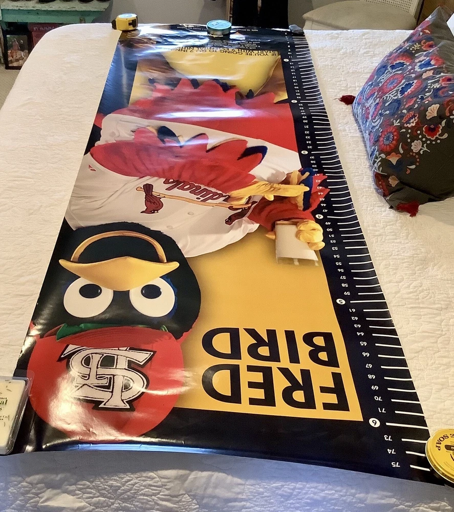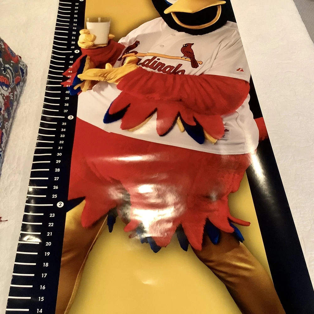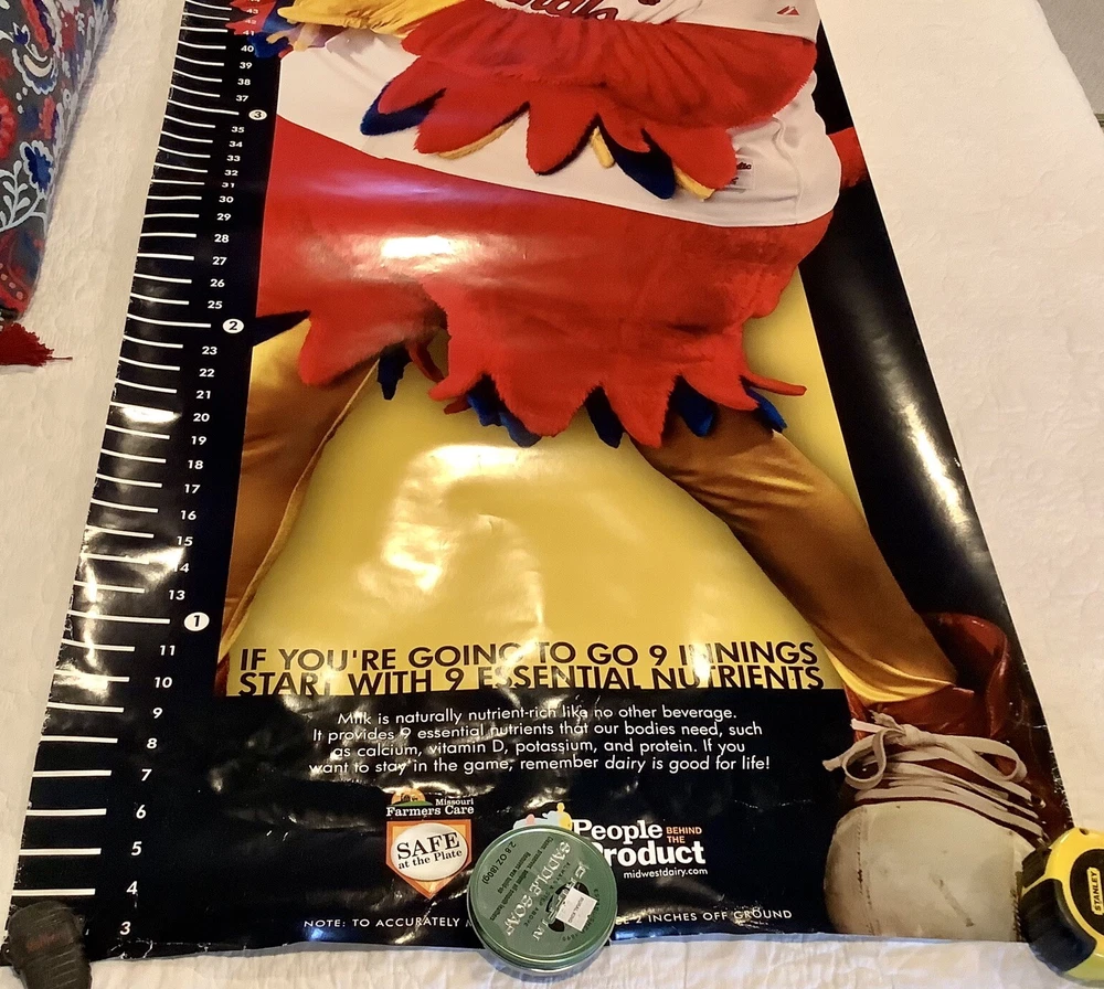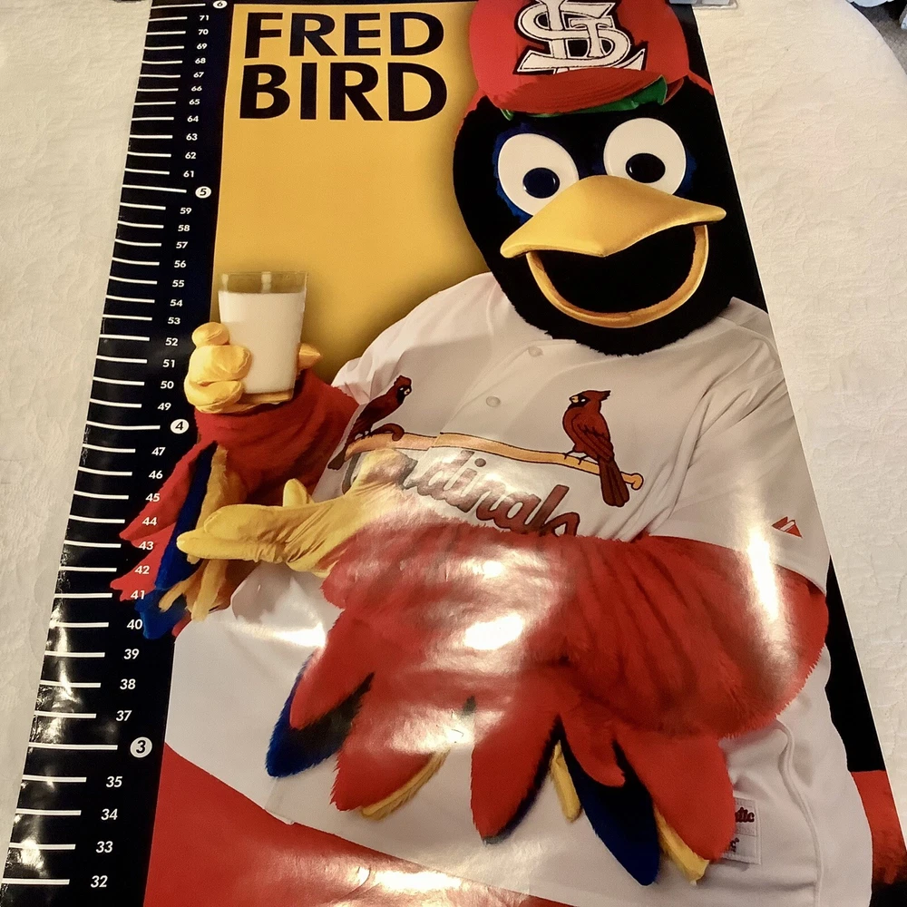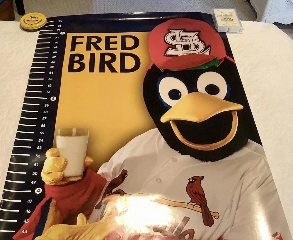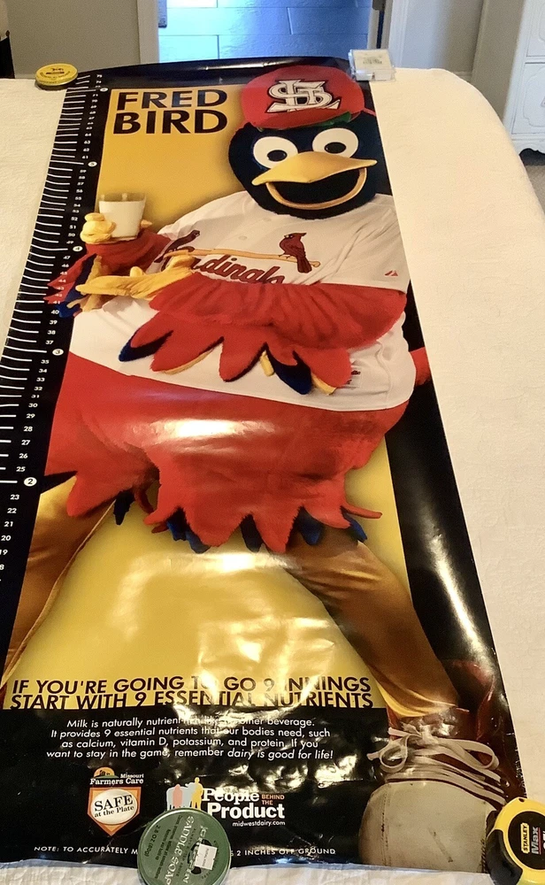 This is a rare 2011 St. Louis Cardinals Fred Bird Growth Chart Poster. It measures 8’ x 26” and features a colorful Fred Bird photograph. The poster is a great piece of fan memorabilia for anyone who loves baseball and the Cardinals. It features Fred Bird holding a glass of milk and is sponsored by the Midwest dairy association. There is some damage along the bottom edges of poster.