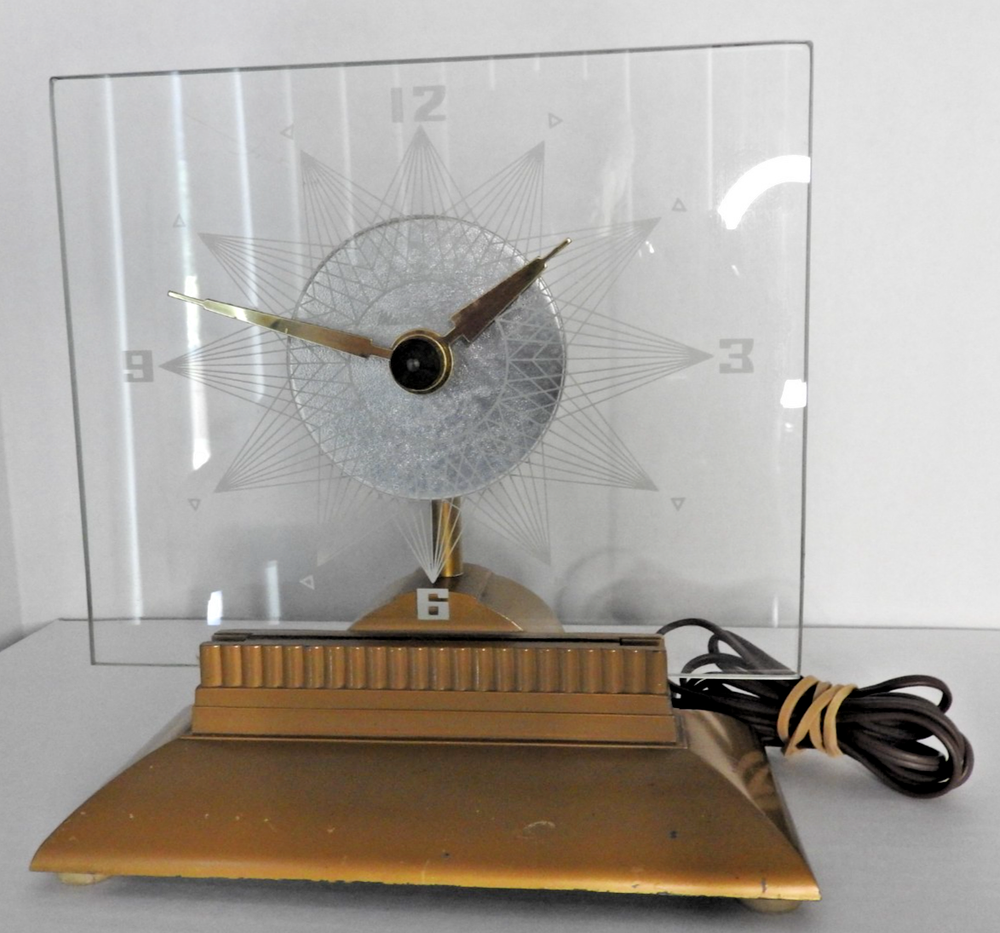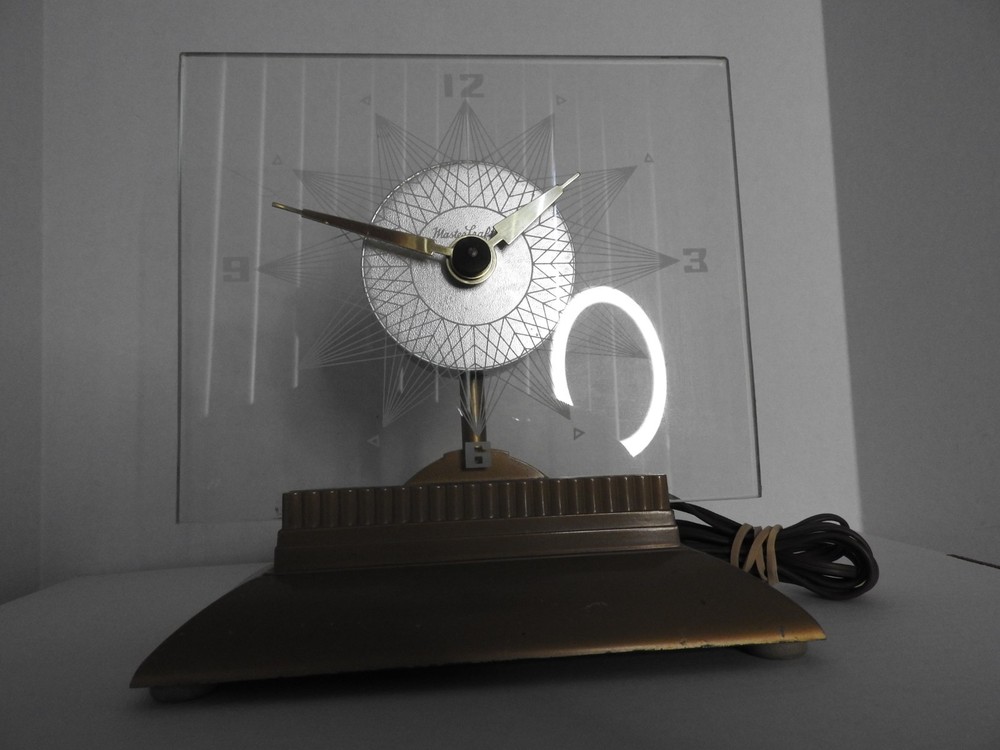 Here we have up for sale an ORIGINAL 1950's MasterCrafters Atomic Eternalight Desk Clock. Clock runs well with its original cord. Light switch works as it should also. Looks really cool when lit. Measures 8 1/2" x 8 1/2". Glass is perfect. Base is nice too but does have a couple of minor paint chips. Clock is in VERY GOOD+ overall condition and ships for FREE. Thanks for viewing.....Triple K