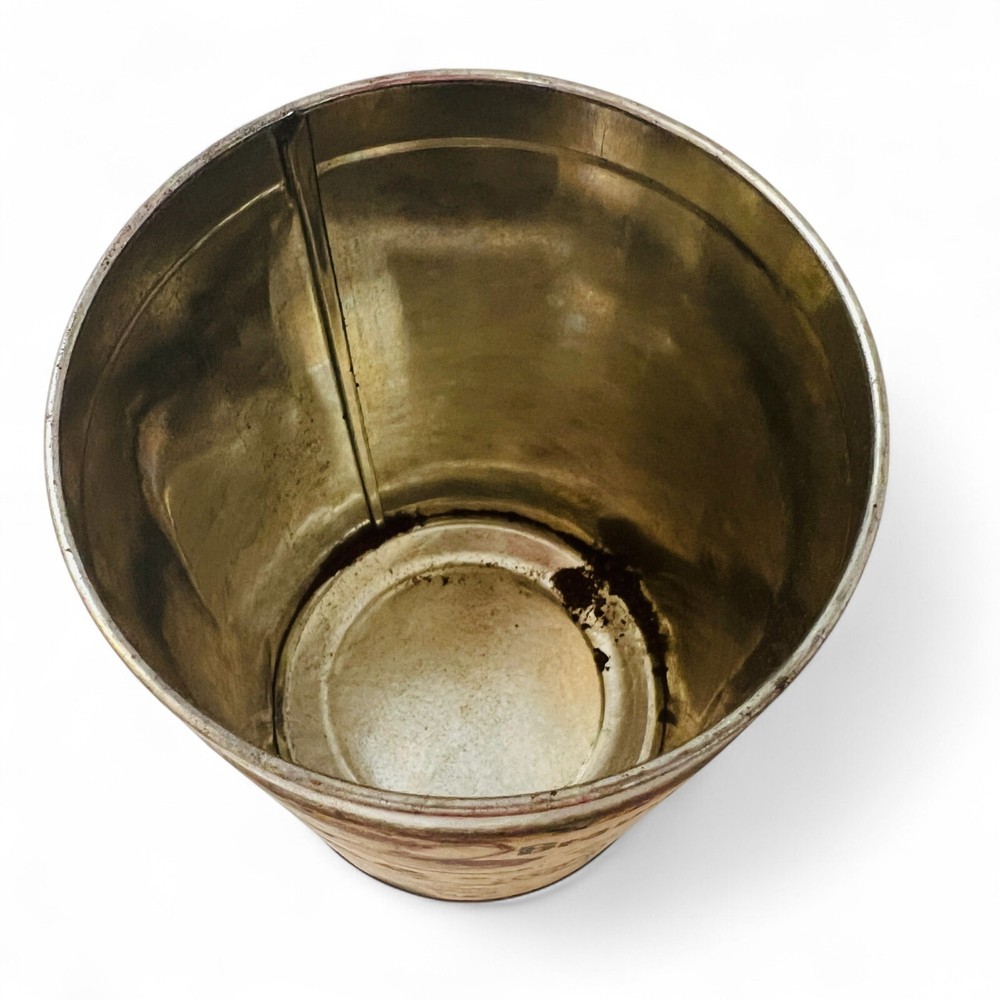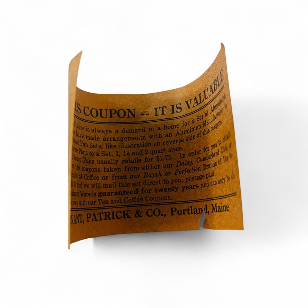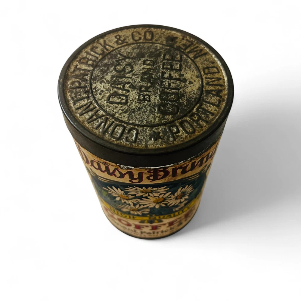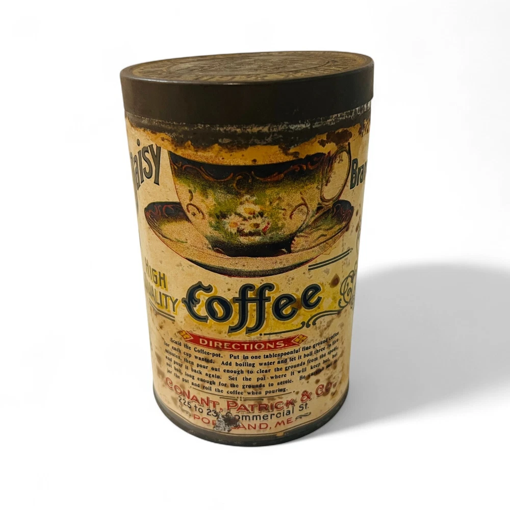 This is a rare antique coffee tin from the Daisy Brand, distributed by Conant, Patrick & Co. of Portland, Maine. Likely dating back to the early 1900s, this cylindrical tin features a beautifully illustrated teacup and saucer graphic and ornate typography advertising “High Quality Coffee.” Instructions for brewing are printed in red on the front label, with charming period directions such as “Scald the coffee-pot” and “Pour out enough to clear the grounds.” The tin stands approximately 6 inches tall and shows expected signs of aging, including oxidation near the top rim and general surface wear. Despite the aging, the piece retains its historical charm and vibrant design. Perfect for collectors of vintage coffee tins, antique advertising, kitchen decor, or Maine-based memorabilia. This tin was acquired from a private antique coffee collector and remains a one-of-a-kind display piece Bonus Inclusion: This listing includes the original promotional coupon that came with the tin. The coupon offered customers a premium aluminum sauce pan set in exchange for tea and coffee coupons—an excellent glimpse into early 20th-century American advertising and loyalty programs.