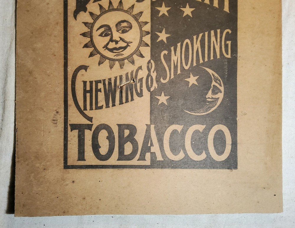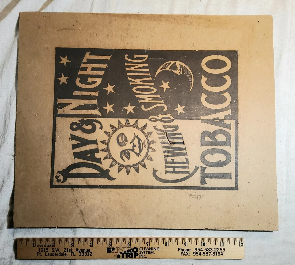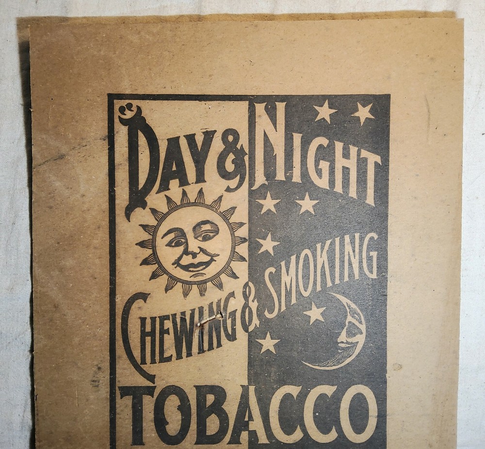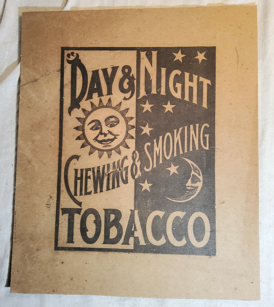 RARE ANTIQUE DAY & NIGHT CHEWING & SMOKING TOBACCO HEAVY PAPER SIGN AND COUPON This is a vintage advertising sign for Day & Night Tobacco and small coupon that probably dates to the early 1900s. First item is a one-sided heavy paper sign that reads, "Day & Night Chewing & Smoking Tobacco" with moon and sun graphics also. It measures 14" tall by 11 and 3/4" wide. It is in good condition with just one small place where a hole goes through the word "Chewing". It would look absolutely fantastic if you were to frame it. The second item is a small coupon for The Pinkerton Tobacco Co. with Red Man, Blue Hen, High Card and Day & Night Tobacco advertising around the corners. Coupon has an expiration date on the back of 1913. It has some wear around the edges but is a nice advertising piece. Measures 3" by 2 and 1/4". Please see pictures for design and condition detail in both items. Wonderful and rare Day & Night Tobacco advertising pieces would be a great find for you. Don't miss them.