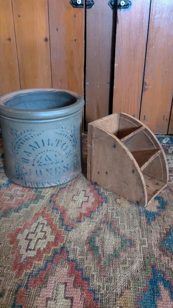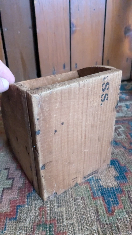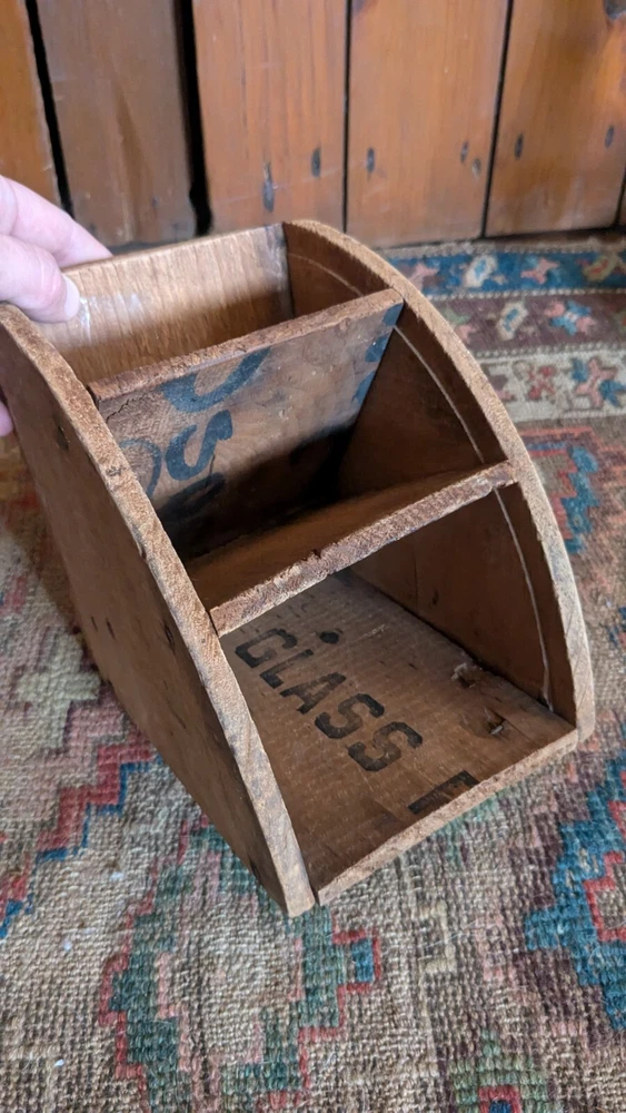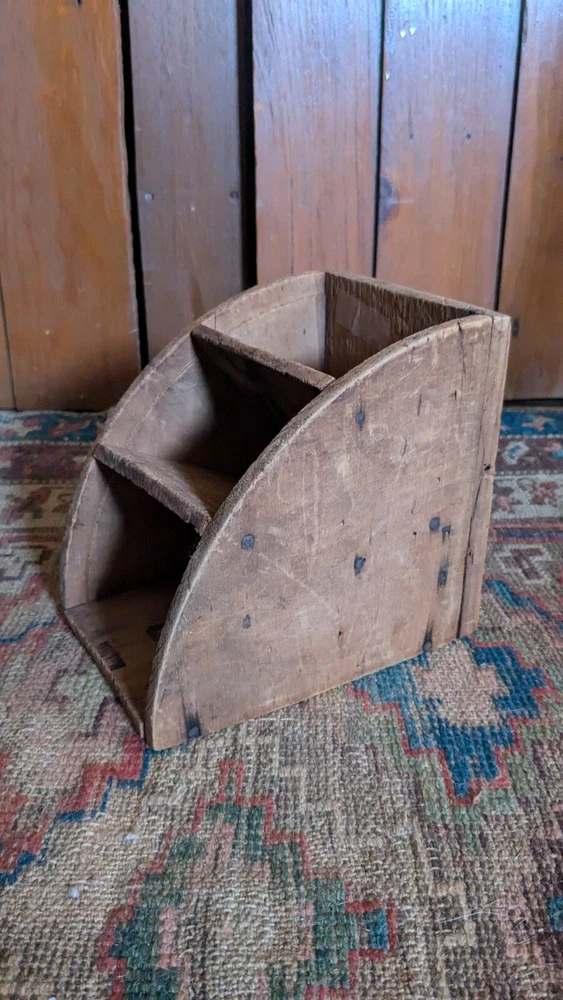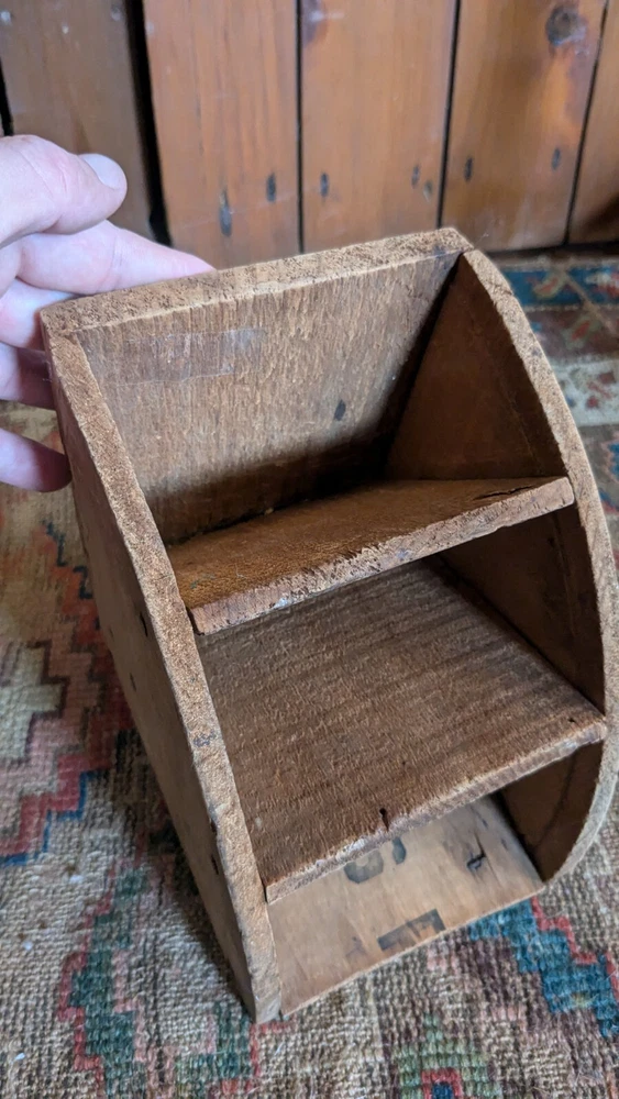 Offering this antique wood handmade small bag holder. Measures 7.5" L x 7" T x 5.5" W. This piece has a nice attic style surface. Made from an advertising piece. Has smooth edges from age and use. Great display piece to hold paper bags or mail if in your home. Perfect size for about anywhere. Thanks for looking.