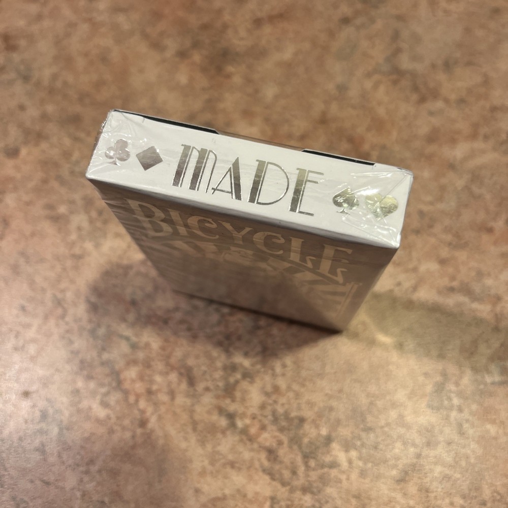 Introducing a rare find for playing card collectors - the Bicycle Silver Brand New Sealed Playing Cards. This deck features the iconic and collectible design of M Made, adding a unique touch to your card collection. The deck is brand new and sealed, ensuring the cards are in pristine condition for your enjoyment. Perfect for collectors or anyone looking for a special gift, these playing cards are a must-have addition to your collection. The deck is made by Bicycle, a trusted name in playing cards, and features a beautiful silver design that is sure to impress. Get your hands on this rare deck today and add a touch of elegance to your card games.