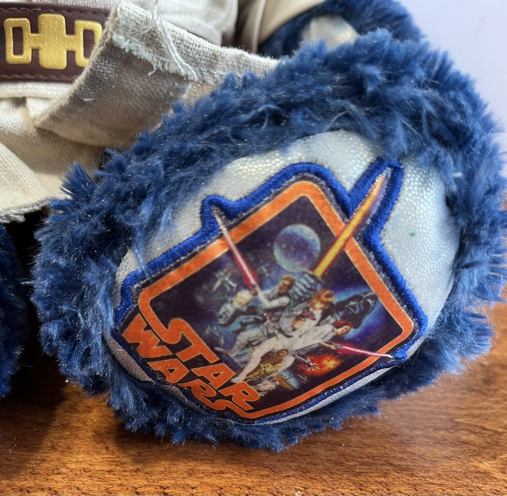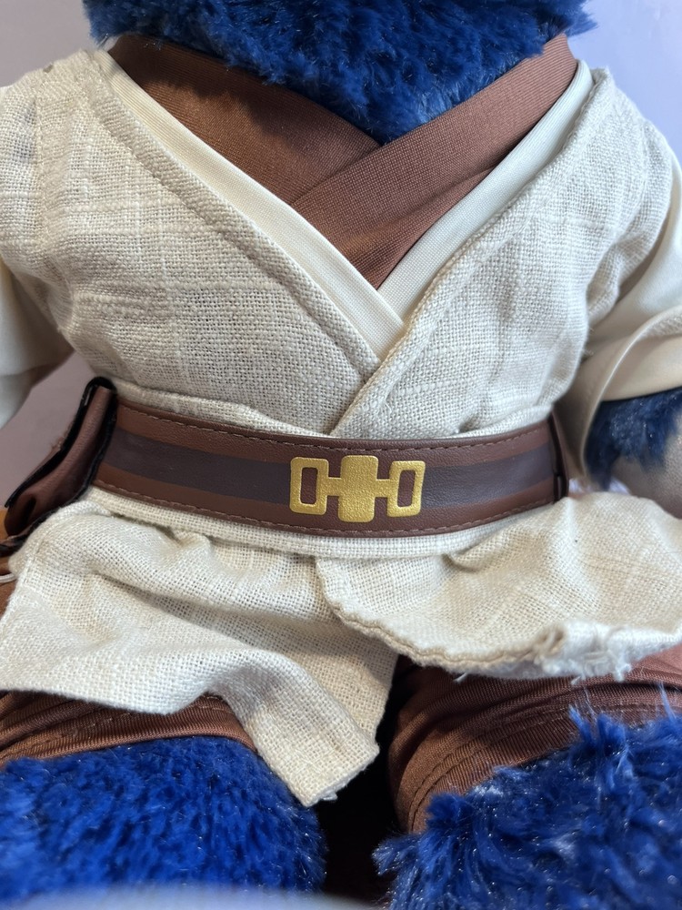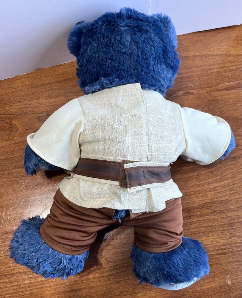 This is a rare blue Jedi plush bear from Build-A-Bear Workshop's Star Wars collection. The bear has black eyes and is dressed in a Jedi costume, making it perfect for all Star Wars occasions. It is part of the Build-a-Bear franchise and is a unique addition for any Star Wars fan. Clothing included as seen in pictures Small smudge above mouth.