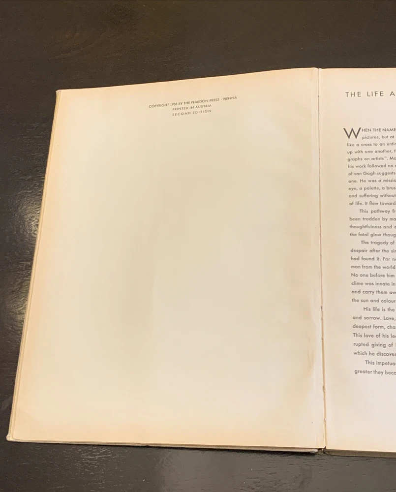 **NOT 1945 Great Britain Printed English Edition - NOT 1941 Great Britain Printed English Edition - This is an Original 1936 Phaidon Press Printed in Austria that is Not in French nor German; but a rare English Printing** This rare 1936 Van Gogh art book is a valuable collector's item, featuring illustrations in color and black and white by L. Goldscheider. Published by Editions Phaidon in Austria, this 2nd edition book provides a detailed look at Van Gogh's artworks, making it a must-have for those interested in art and photography. The hardcover binding adds to its appeal, and the fact that it is an original piece from 1936 adds to its historical significance and value. A fascinating addition to any art lover's collection.