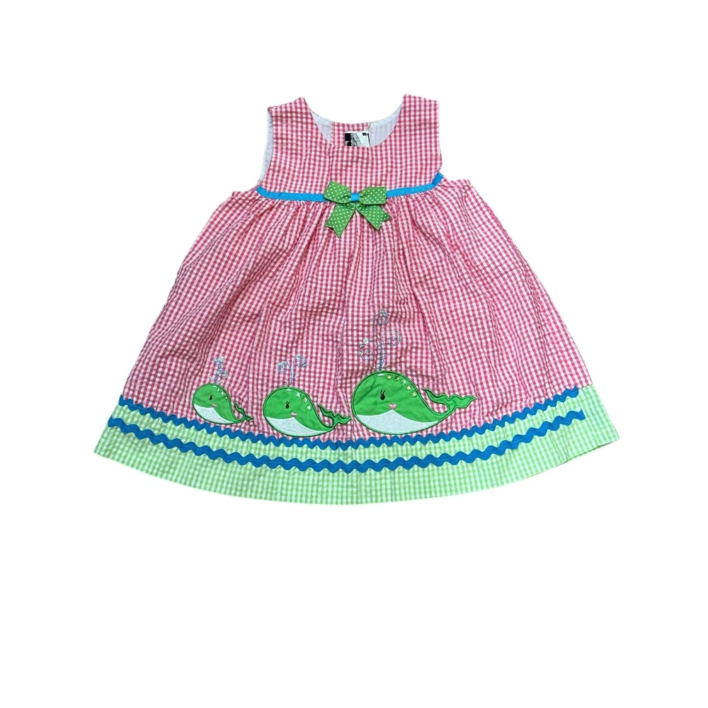 This adorable Rare Editions whale dress is perfect for your little one’s summer wardrobe! Size 24 months, it features a pink and white gingham seersucker fabric, bright green gingham trim, and three appliqué green whales with sequin details. Accented with a green polka dot bow, blue rickrack trim, and back buttons for easy on/off. Lightweight, breathable, and perfect for warm weather, beach photos, or everyday cuteness. Great condition with no holes or stains—just typical wash and wear. Ideal for baby showers, birthday parties, or boutique lovers hunting for playful and classic styles!