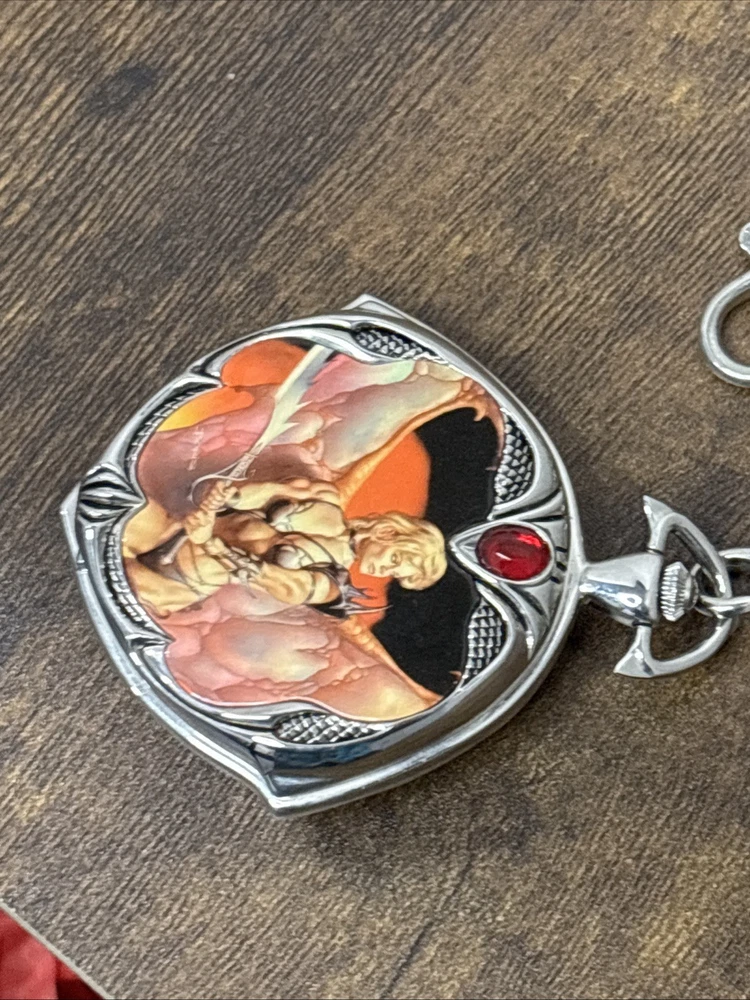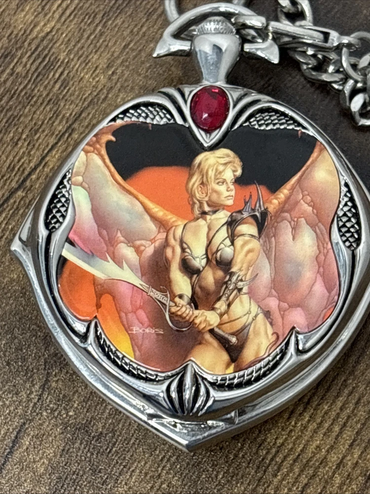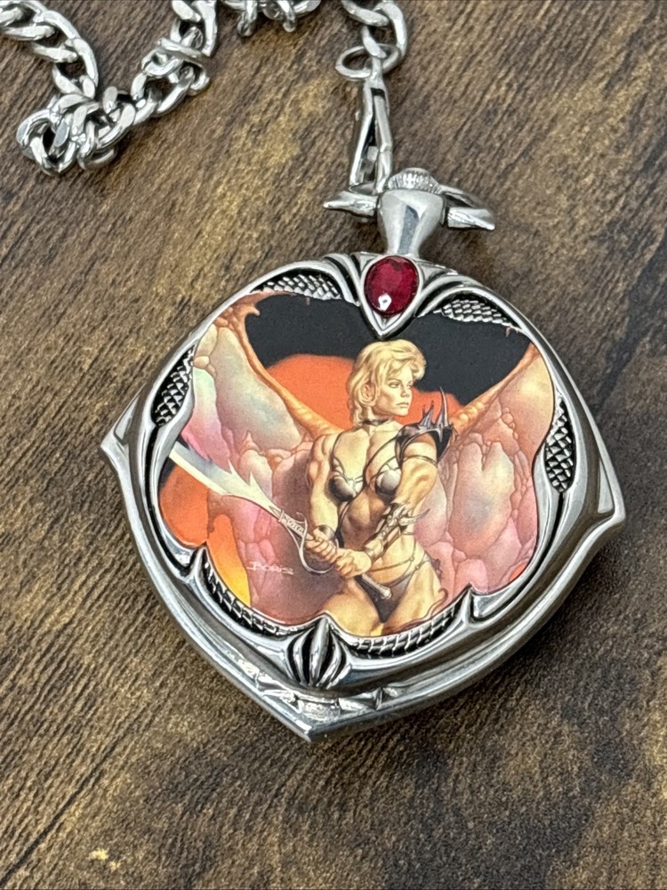The Rare Franklin Mint Boris Vallejo January Calendar Girl Knightstone Pocket Watch is a unique and collectible timepiece designed by renowned brand Franklin Mint. This pocket watch features a beautiful design with a calendar girl for the month of January, making it a special and valuable accessory for any watch enthusiast. The quartz movement ensures accurate timekeeping, while the 12-hour dial adds a touch of sophistication to this charming piece. Its compact size makes it easy to carry and ideal for those who appreciate exquisite craftsmanship and attention to detail.