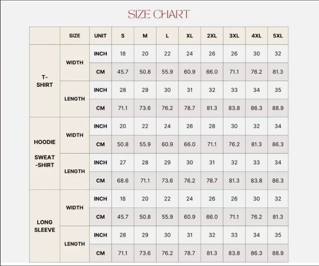 If you are ordering a t-shirt, hoodie, or sweatshirt, please message me or note the color and size you require. We have sizes available from S-5XL and prices are the same for all sizes If you are ordering a digital file, please provide your email address. Note: We want to clarify that a digital file is an electronic file containing a design template that you can use to print the product at home or through a printing service. This is not a physical product that we ship through the mail. To ensure the fastest delivery time, customers in each region will receive their shipments from the warehouse located in that region Delivery Time Customers in the USA, Canada: Shipped from the USA warehouse, delivery within approximately 5-9 business days. Customers in the UK and EU: Shipped from the EU warehouse or UK warehouse, delivery within approximately 4-8 business days. Customers in Australia: Shipped from the Australia warehouse, delivery within approximately 4-8 business days. If you want to buy a Sweatshirt, Hoodie or Tank Top but there are no options on the product listed, please message us for assistance. A. ORDER PLACEMENT INSTRUCTIONS Please review all the provided photos. Select your preferred shirt size. Indicate your color preference. Click the "ADD TO CART" button. You can return to add more items for your family or proceed to checkout. If you have added any additional notes, continue by choosing "Proceed to checkout." Your selected shirt will be prepared for shipping. B. PRODUCT DETAILS A comprehensive size guide can be found among the item photos. The materials used may vary slightly depending on the chosen product type, such as a t-shirt, sweatshirt, or hoodie. Irrespective of the product type, our primary focus remains on comfort and quality. All our products are lightweight, with a fabric weight of 4.5 oz/y² (153 g/m²). We have pre-shrunk them to minimize potential shrinking after washing. To enhance durability, we have included shoulder-to-shoulder taping. Additionally, the quarter-turn design prevents creasing at the center, ensuring a tidy appearance. Feel free to explore our store for the perfect gift suitable for any occasion. FAQs: I JUST PLACED AN ORDER, WHEN WILL IT SHIP? It is noted that your order processing time can be affected if the initial information provided to us is insufficient or incorrect such as inaccurate or incomplete payment; incorrect address information and insufficient product measurements. We seek your understanding and support if it is the case. FEEDBACK Please feel free to contact us if you have any questions about the merchandise. If you are satisfied with the item, please leave a positive feedback and full-star rating for us! Your satisfaction is the most important thing to us. Please contact us first if you could not leave a positive feedback! Just let us know what the problem is, and we are happy to help. CONTACT US If you have any questions or suggestions, please email to us immediately. Your messages will be answered within 24 -48 hours. We shall try our best to solve your problem to your satisfaction. Have A Nice Day! Thank you