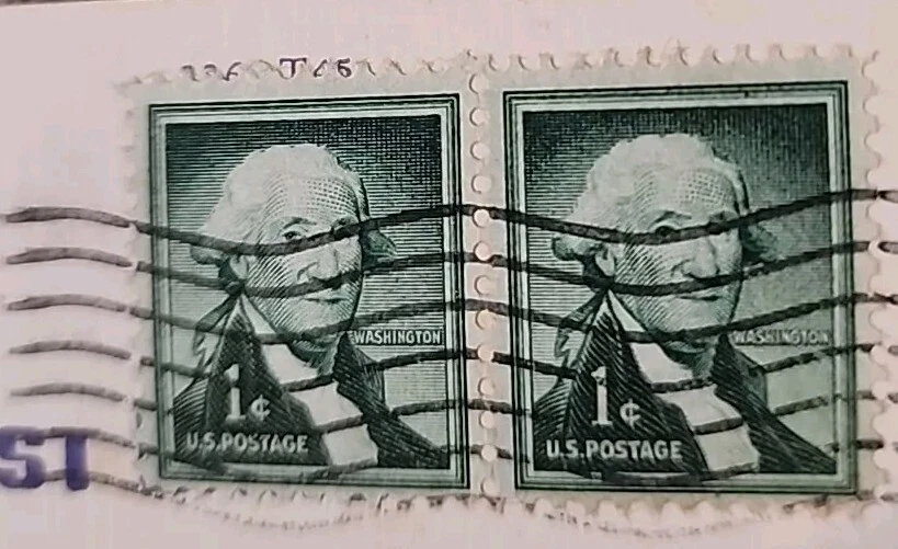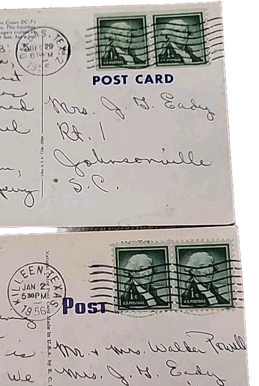 Four vintage red George Washington 1 cent postage stamps, Extremely Rare, featured on postcards, one from Texas and one with a plane.