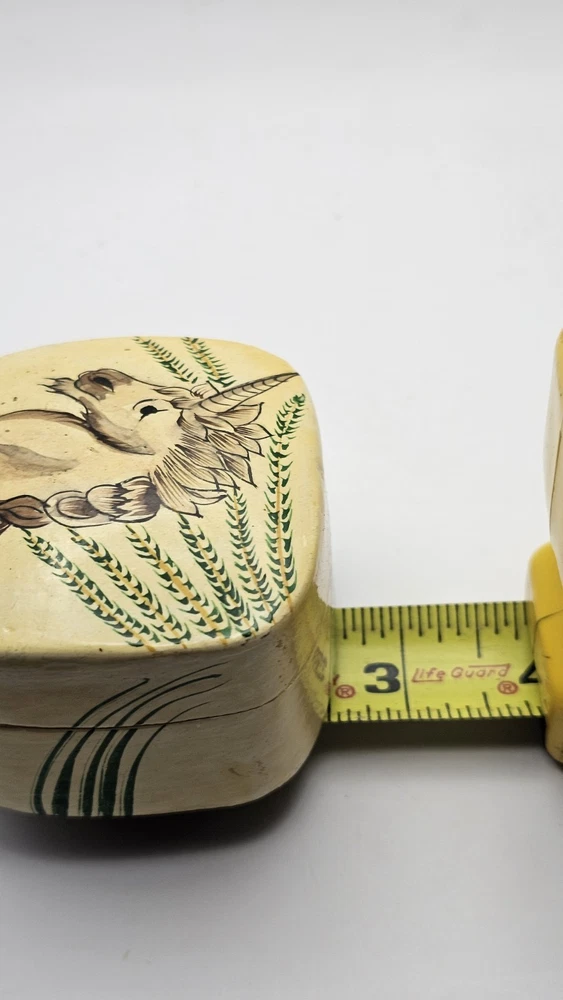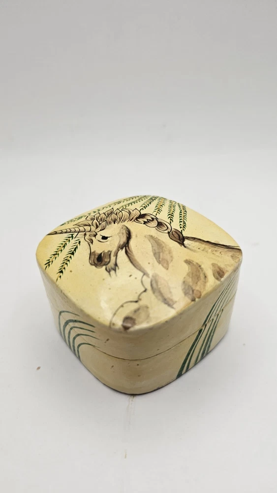 This product is a small hand-made wooden trinket box featuring a unique unicorn pattern and design in ivory and black colors. The square-shaped box is perfect for storing small items or jewelry, making it suitable for all occasions. The 1980s style collection from Kashmir India adds a touch of magic to any bedroom or dining room decor. This special piece is sure to delight teens and adults alike with its unicorn subject and hand-painted finish.