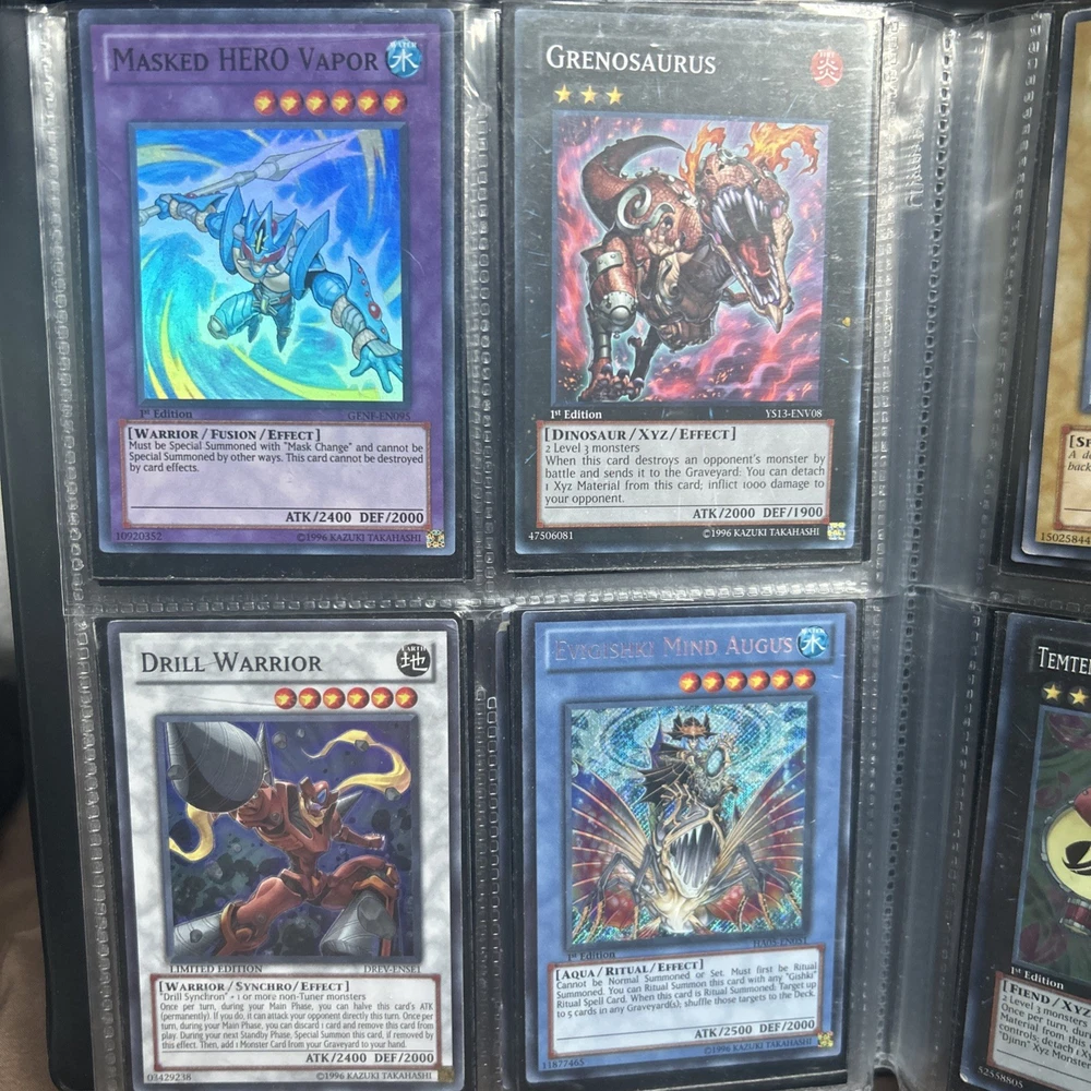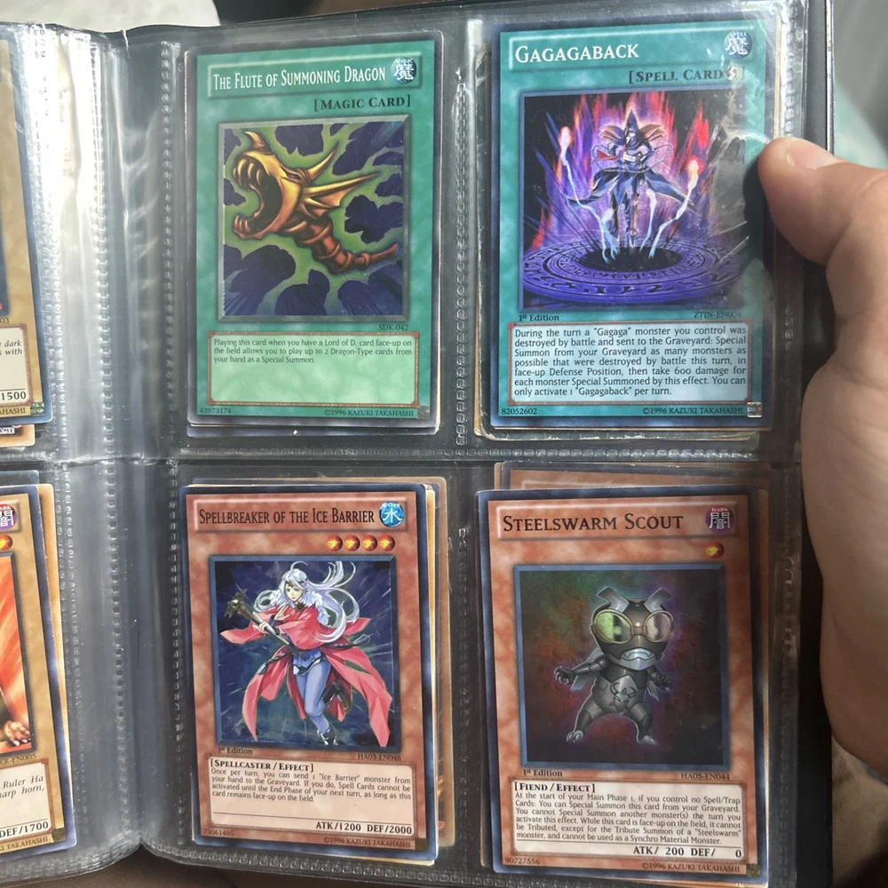 This product is a vintage binder full of Yu-Gi-Oh! trading cards from the Yugi set, manufactured by Konami in 1996. The cards are standard size, made of card stock with a holo finish, and are in English. It is a collection of collectible cards for the Yu-Gi-Oh! TCG, ideal for fans and collectors looking to expand their card collection with classic cards from the early years of the game.