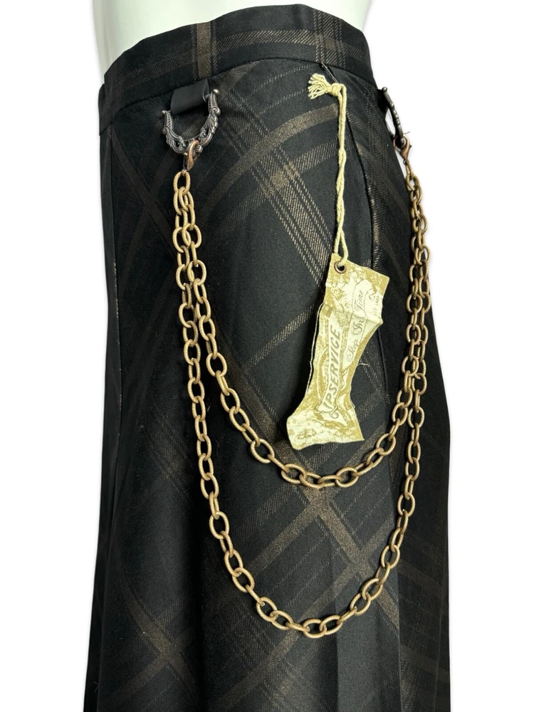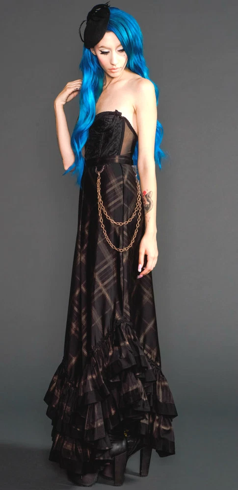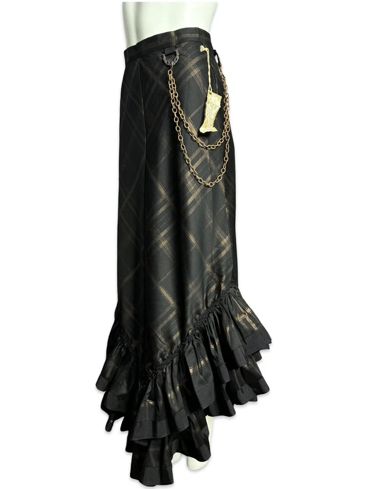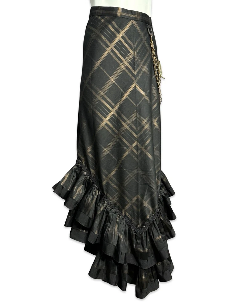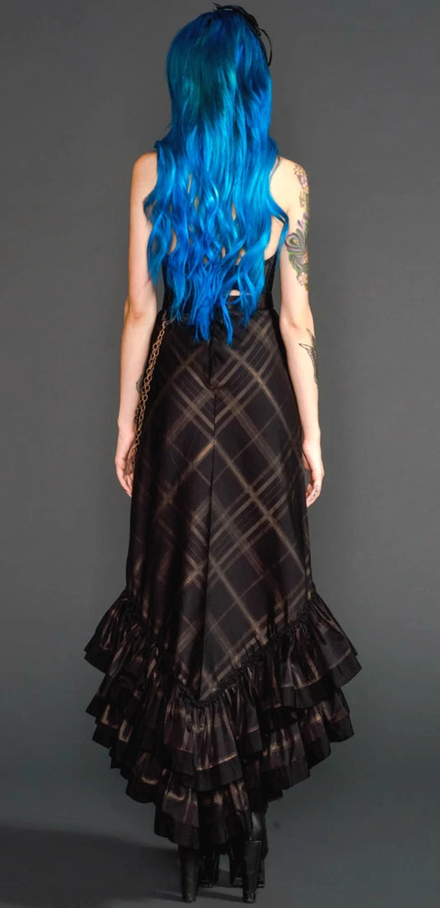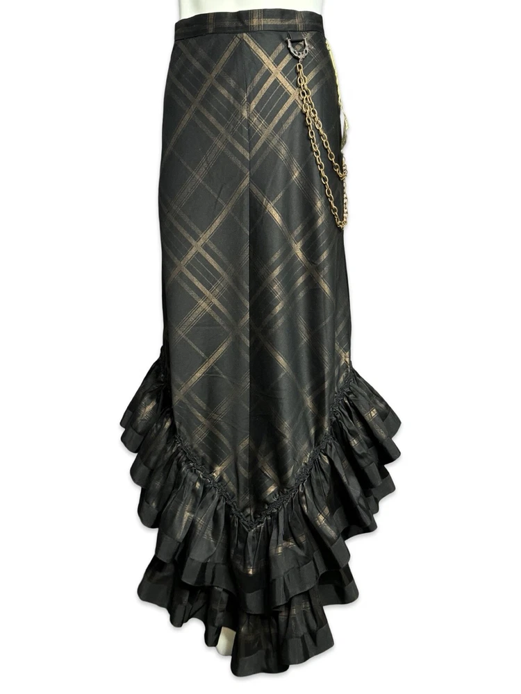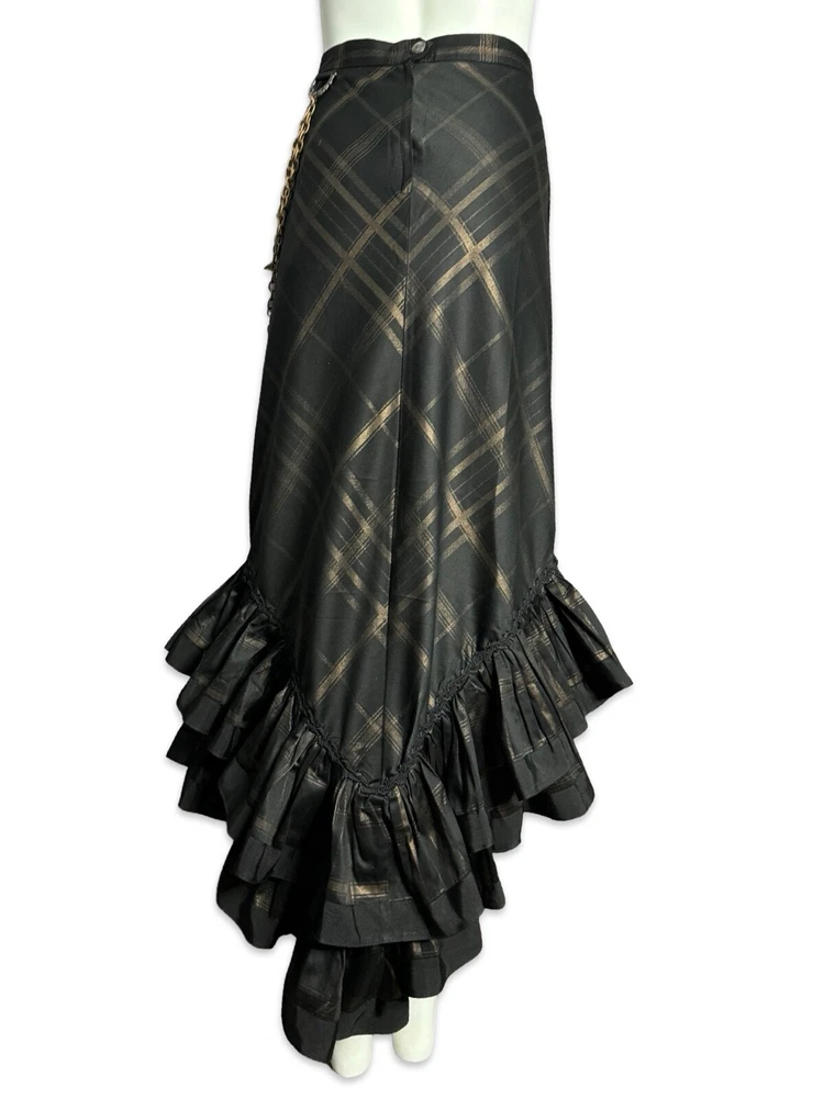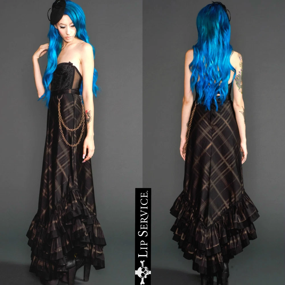 from : LIP SERVICE Rare Step in Time Long Skirt 83-257 BS-8 Steampunk - Step in Time - Westing Manor - Plaid Printed Sateen Long Skirt - Brown / Black. Beautiful plaid printed sateen long layered skirt, with copper chain detail and ruffle trim. This skirt is SOLD OUT and VERY HARD TO FIND...so if you want it...GRAB IT! Measurements when laying flat. Size XS - waist 12", hips 18" Size S - waist 13", hips 19"