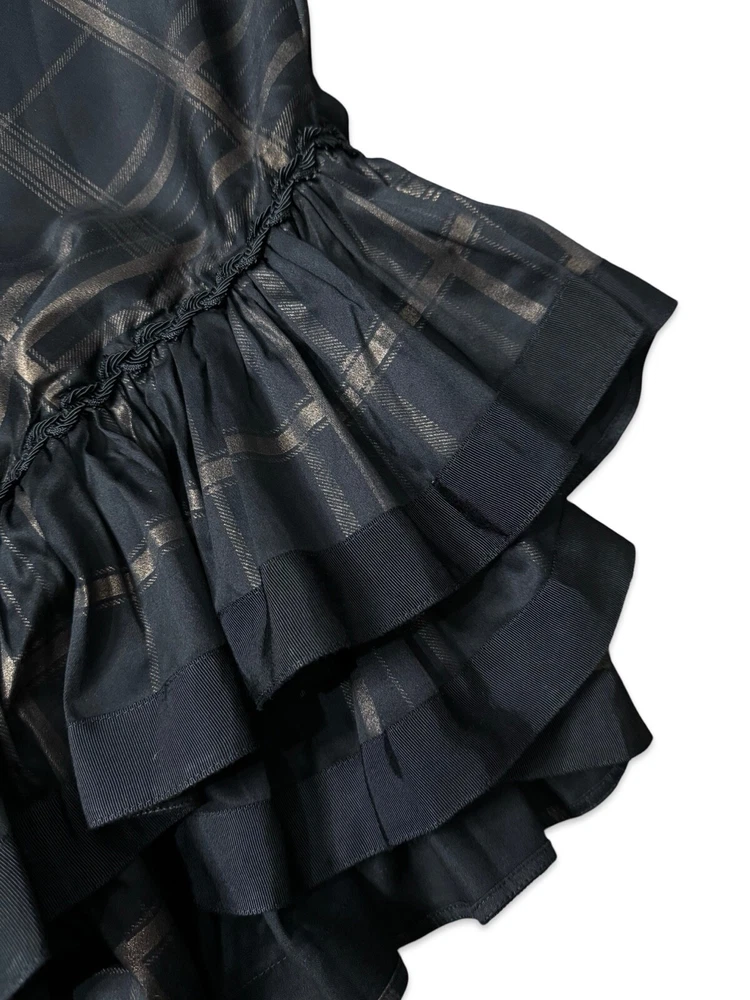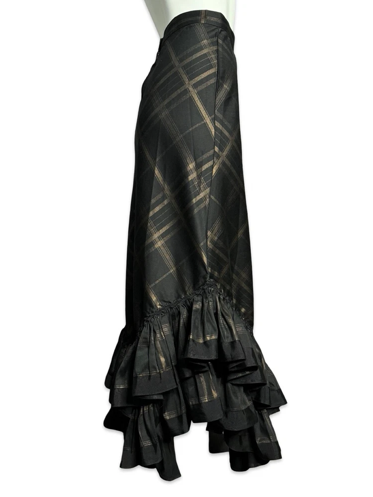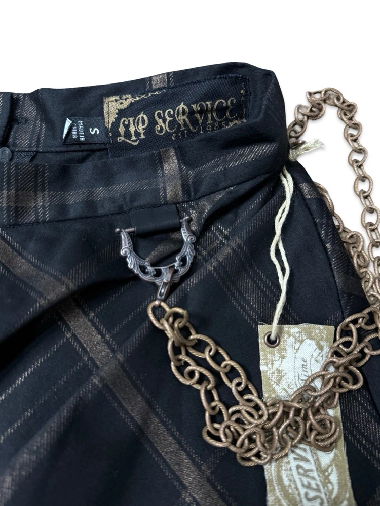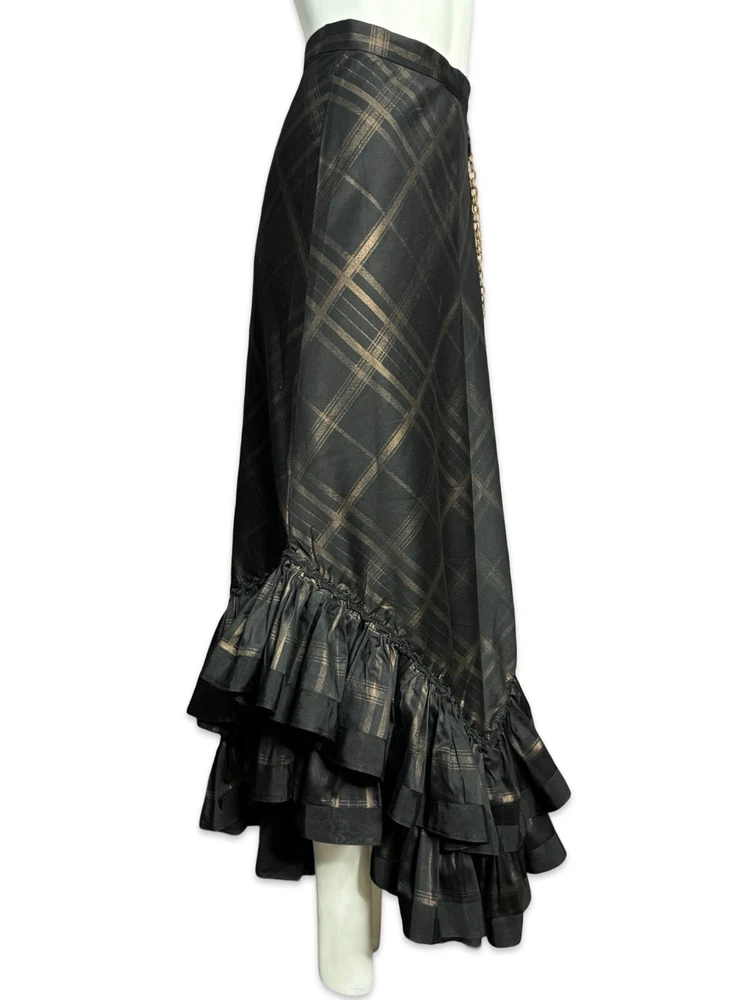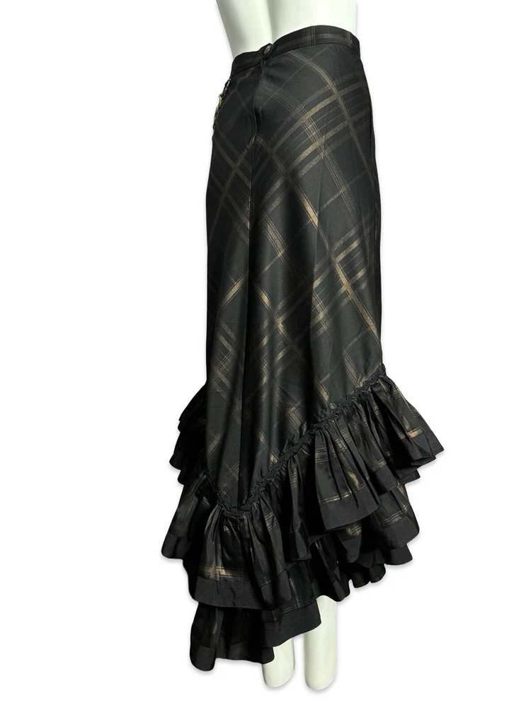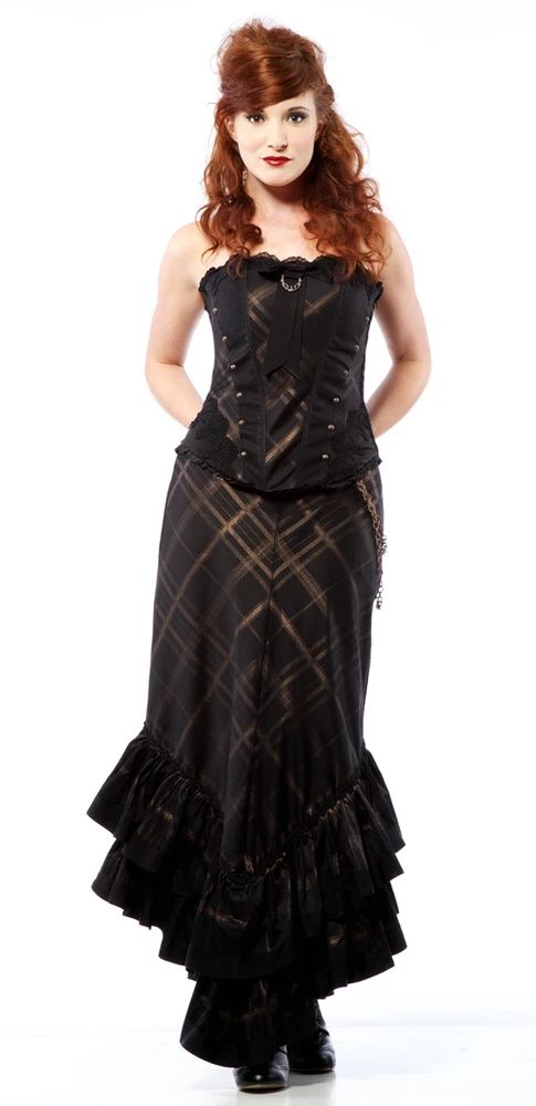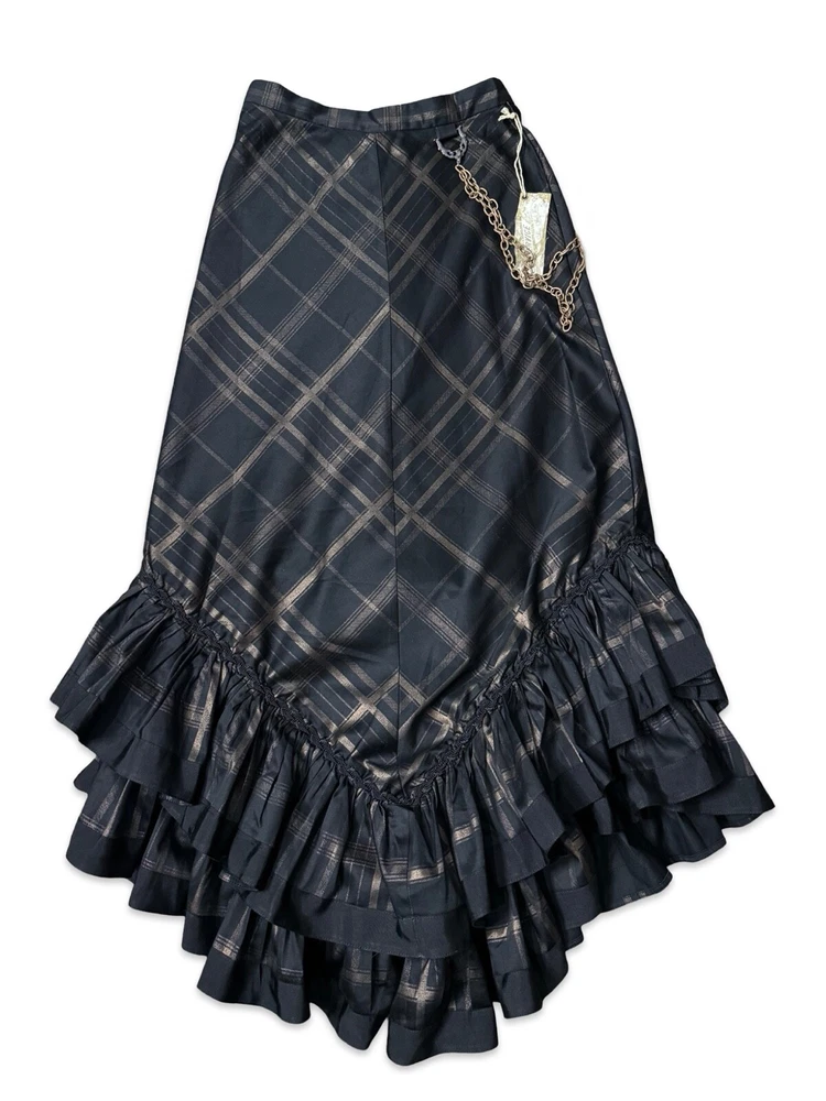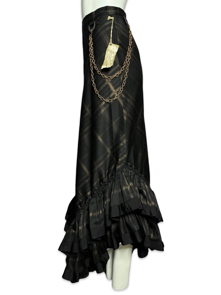 from : LIP SERVICE Rare Step in Time Long Skirt 83-257 BS-8 Steampunk - Step in Time - Westing Manor - Plaid Printed Sateen Long Skirt - Brown / Black. Beautiful plaid printed sateen long layered skirt, with copper chain detail and ruffle trim. This skirt is SOLD OUT and VERY HARD TO FIND...so if you want it...GRAB IT! Measurements when laying flat. Size XS - waist 12", hips 18" Size S - waist 13", hips 19"
