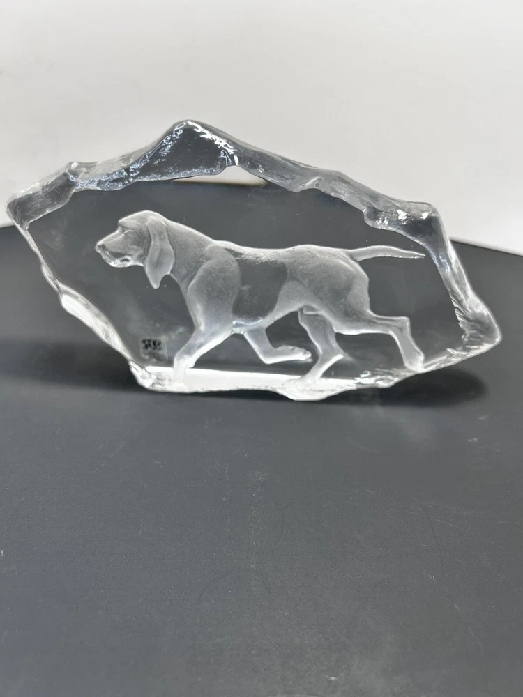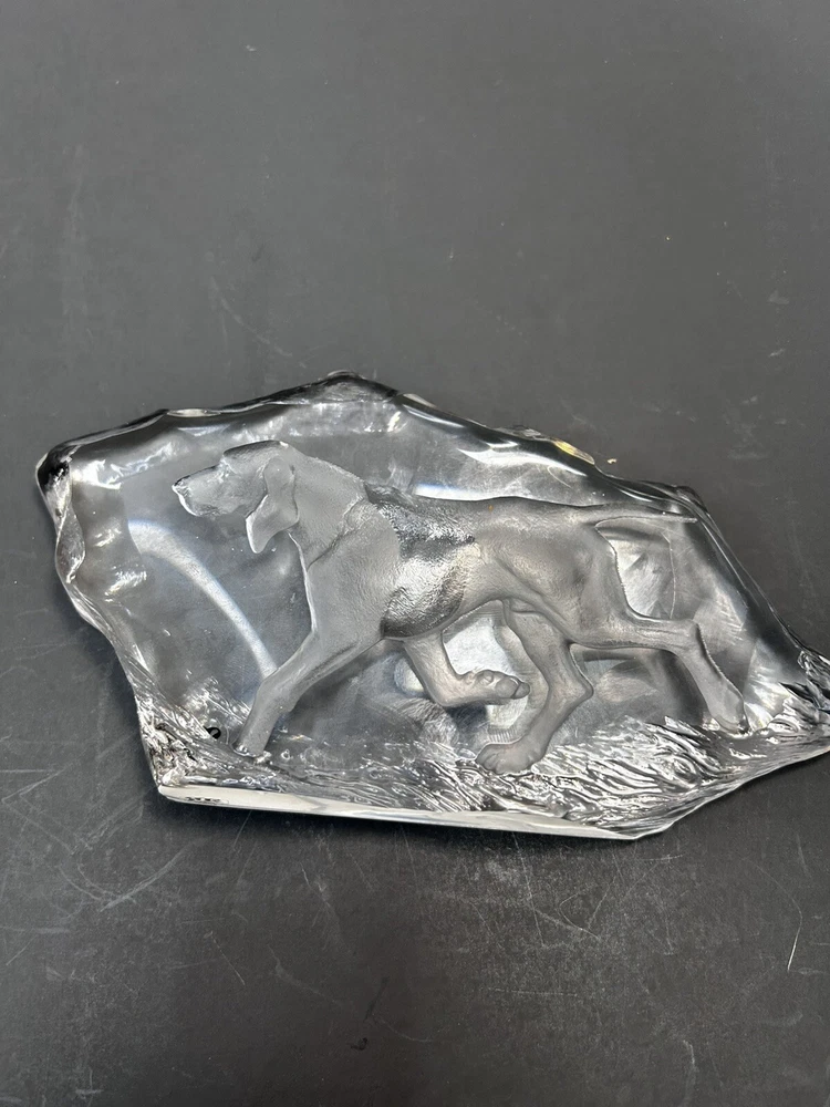 This rare Mats Jonasson Crystal Paperweight features an engraving of a hunting dog, showcasing the intricate artistry of the renowned artist. Handmade in Sweden, this exquisite piece is crafted from clear crystal, highlighting the fine details of the design. Signed by the artist, this paperweight is a collectors' item that adds elegance and sophistication to any space.