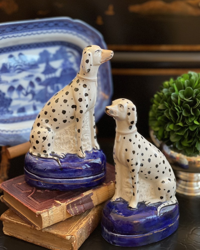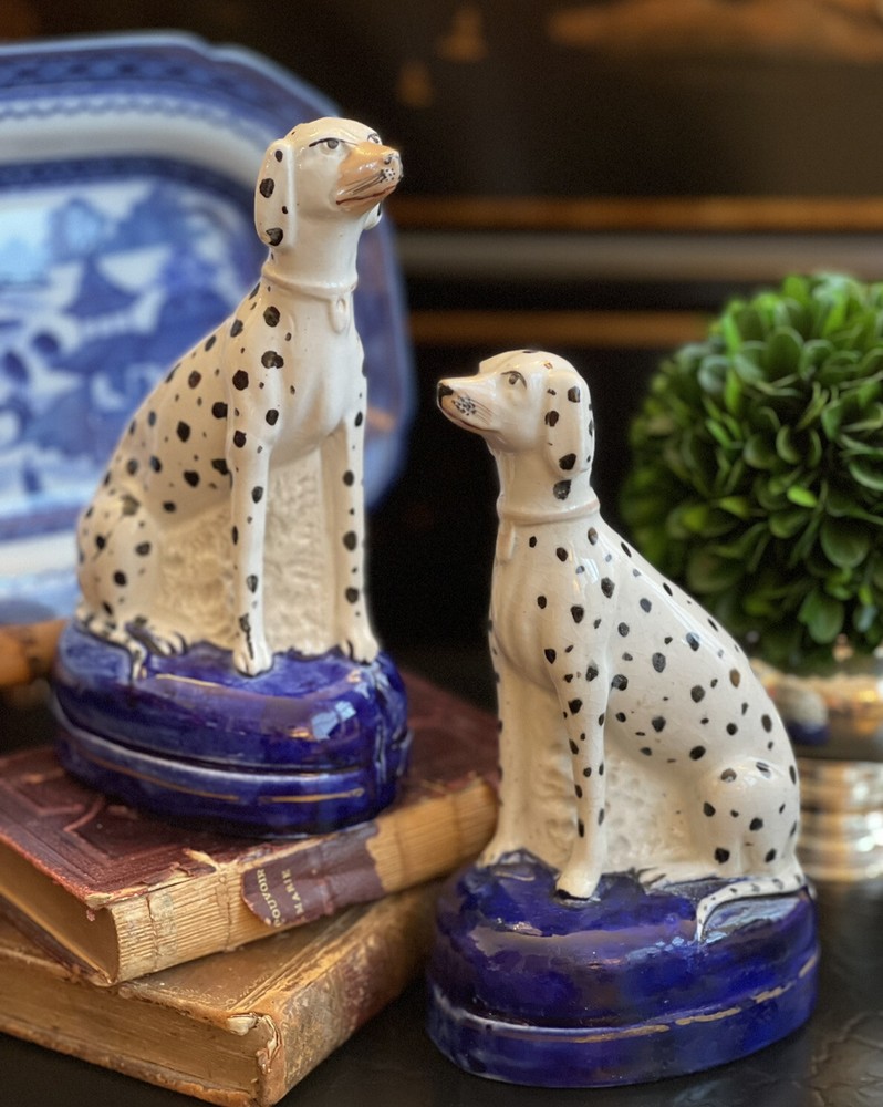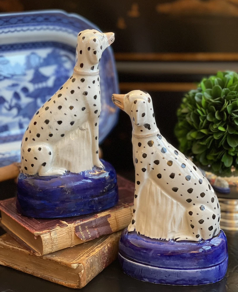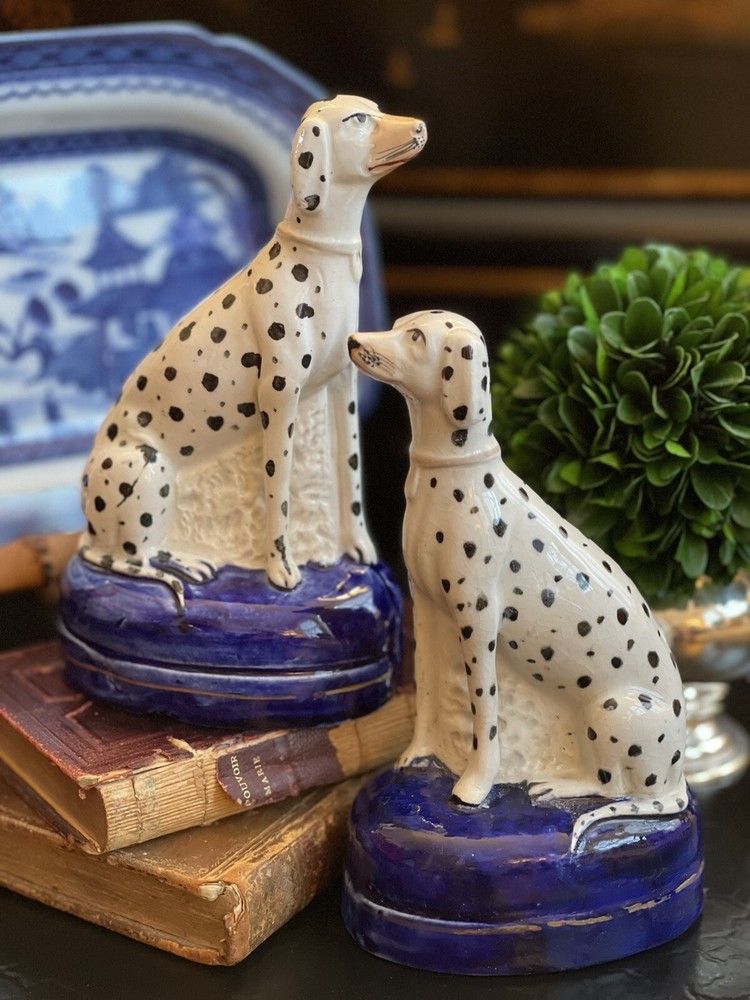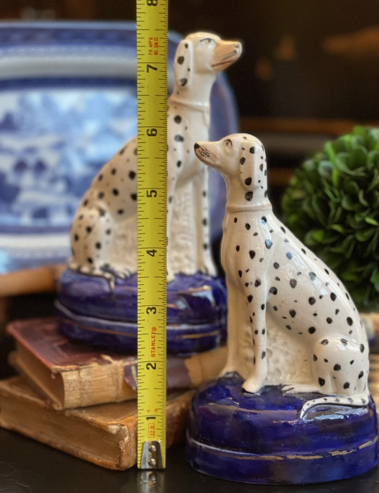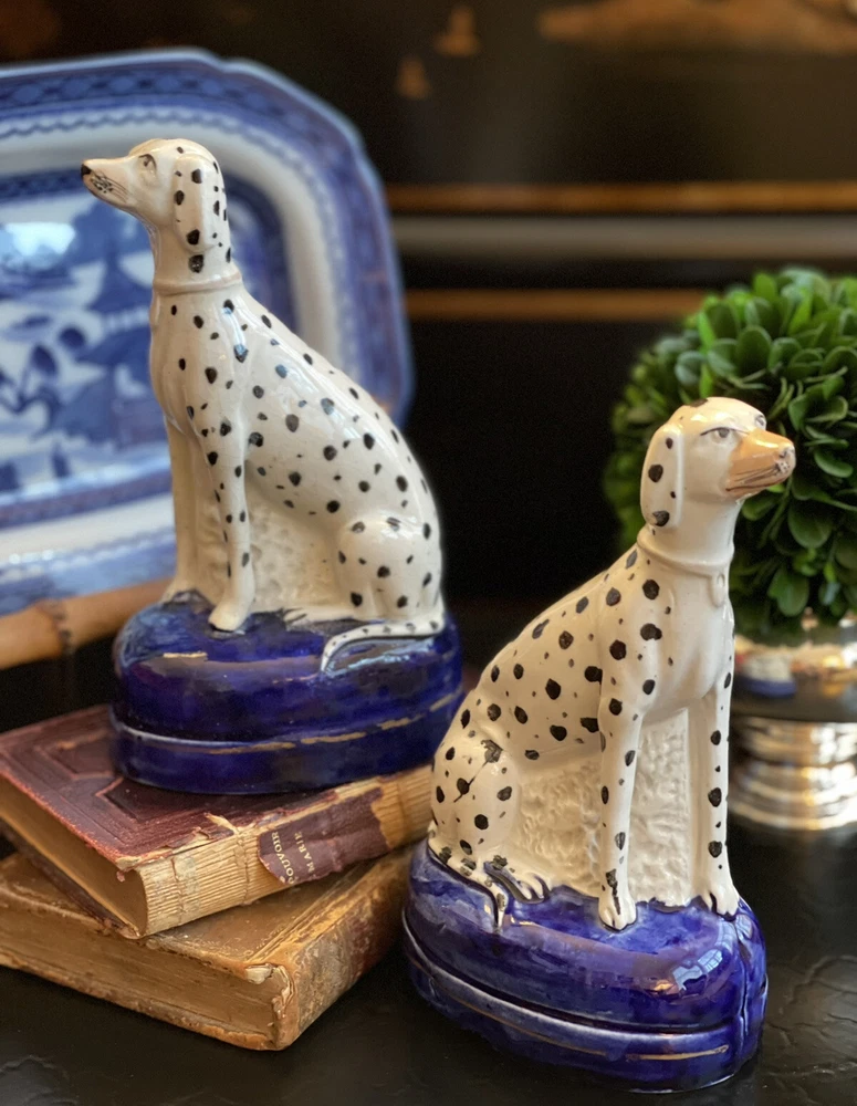 Early Rare 19C English Porcelain Staffordshire Dalmatian Figural Mantle Dog Flat Back Examples • Height 5.9” • Length 3.5” • Width • 2.4” This stunning rare original pair of right and left facing 19C English Staffordshire dalmatian mantle table dogs is hand painted with spotted coats, gold aristocratic accessories and cobalt pillow bases on which they are seated in formal pose. Highly desirable and scarce with tan snoots, as well as extremely rare form and pattern, these elegant figures in formal pose will bring a touch of the English countryside to any setting in which they are placed whether paired on their own as a focal point or grouped as part of a collection or arrangement. Superb. Minimal expected age related post production wear to this beautiful rare find. Marvelous surviving period examples. Purchased England. Height 5.9”