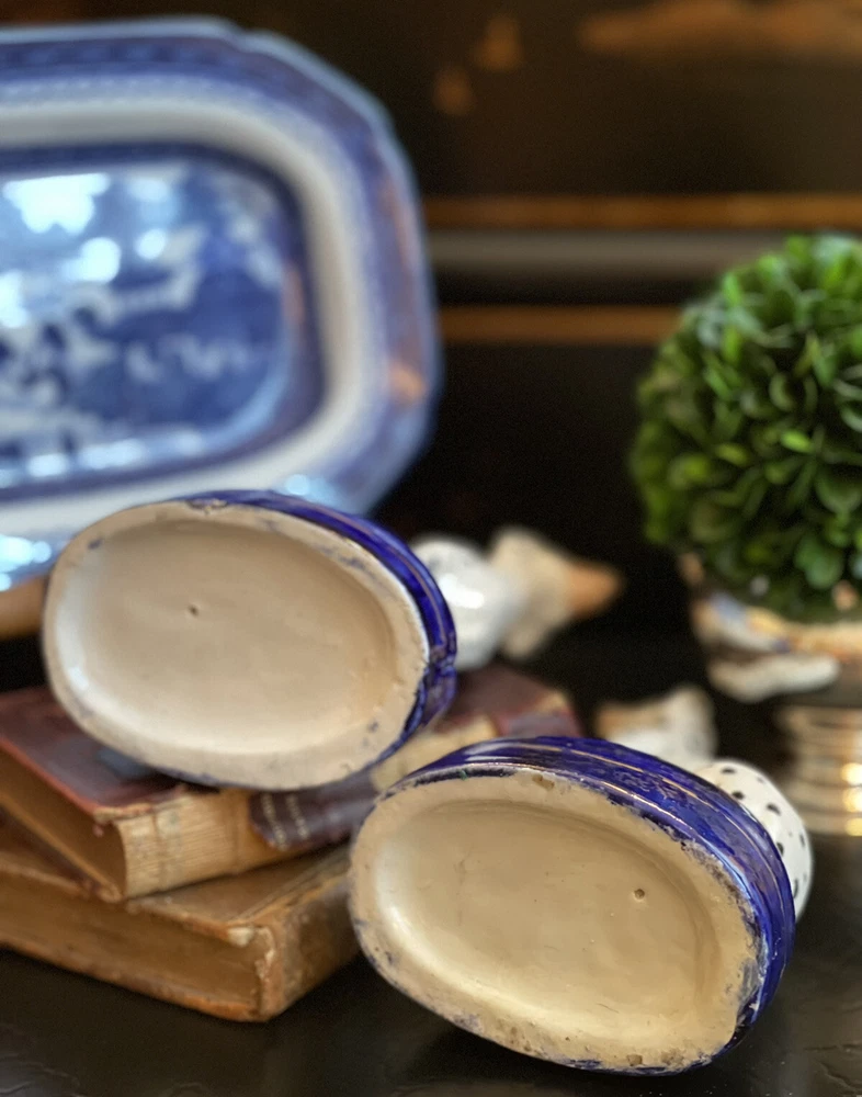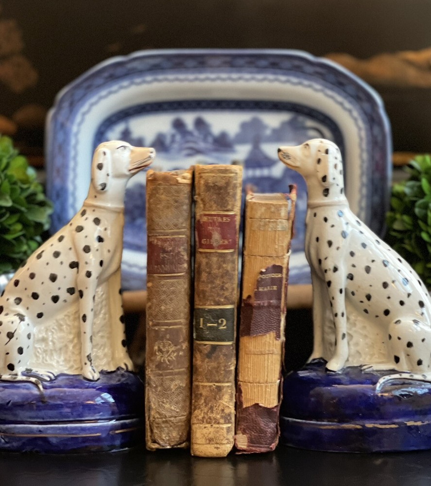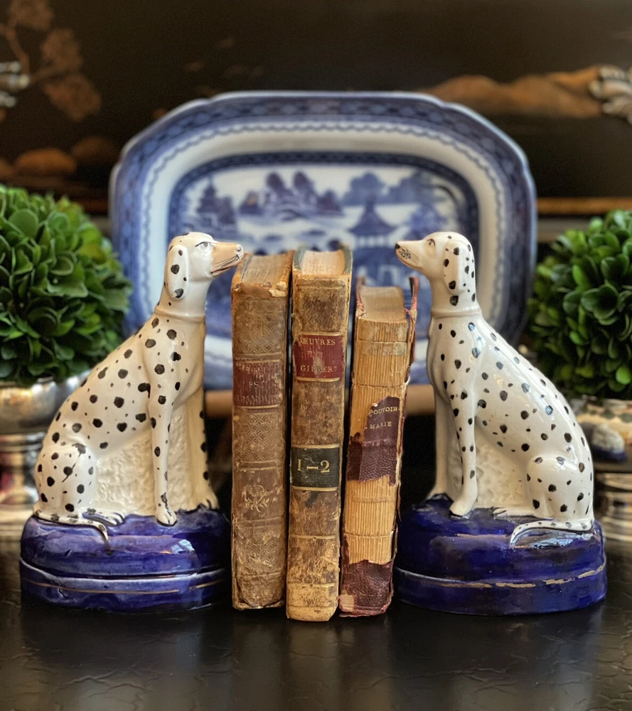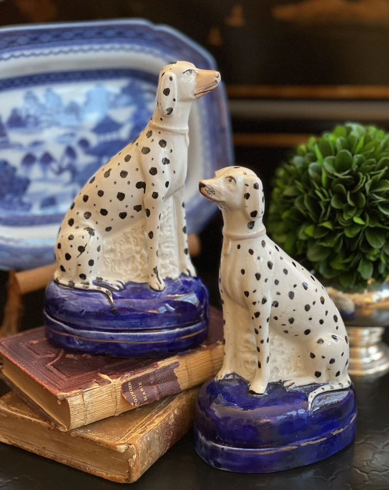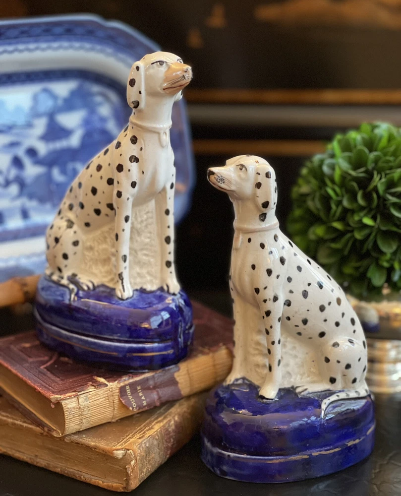 Early Rare 19C English Porcelain Staffordshire Dalmatian Figural Mantle Dog Flat Back Examples • Height 5.9” • Length 3.5” • Width • 2.4” This stunning rare original pair of right and left facing 19C English Staffordshire dalmatian mantle table dogs is hand painted with spotted coats, gold aristocratic accessories and cobalt pillow bases on which they are seated in formal pose. Highly desirable and scarce with tan snoots, as well as extremely rare form and pattern, these elegant figures in formal pose will bring a touch of the English countryside to any setting in which they are placed whether paired on their own as a focal point or grouped as part of a collection or arrangement. Superb. Minimal expected age related post production wear to this beautiful rare find. Marvelous surviving period examples. Purchased England. Height 5.9”