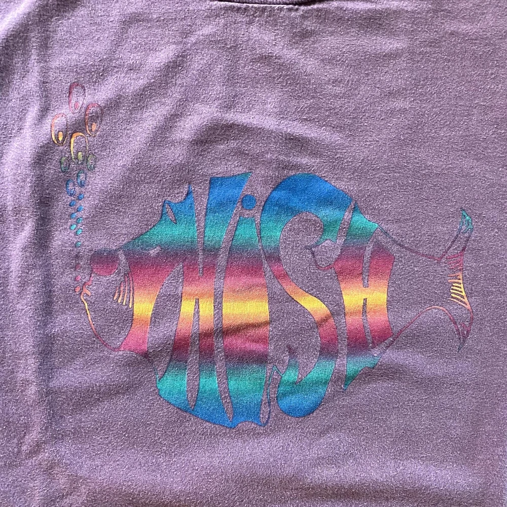 Rare vintage 1995 Phish tour tee features a vibrant rainbow graphic, capturing the spirit of the band's iconic '95 tour. Made in the USA with single stitch sleeves, it's a true piece of concert memorabilia. The tee is marked as XL and shows some light wear, but there are no major flaws. Measurements are in the photos to ensure the perfect fit.