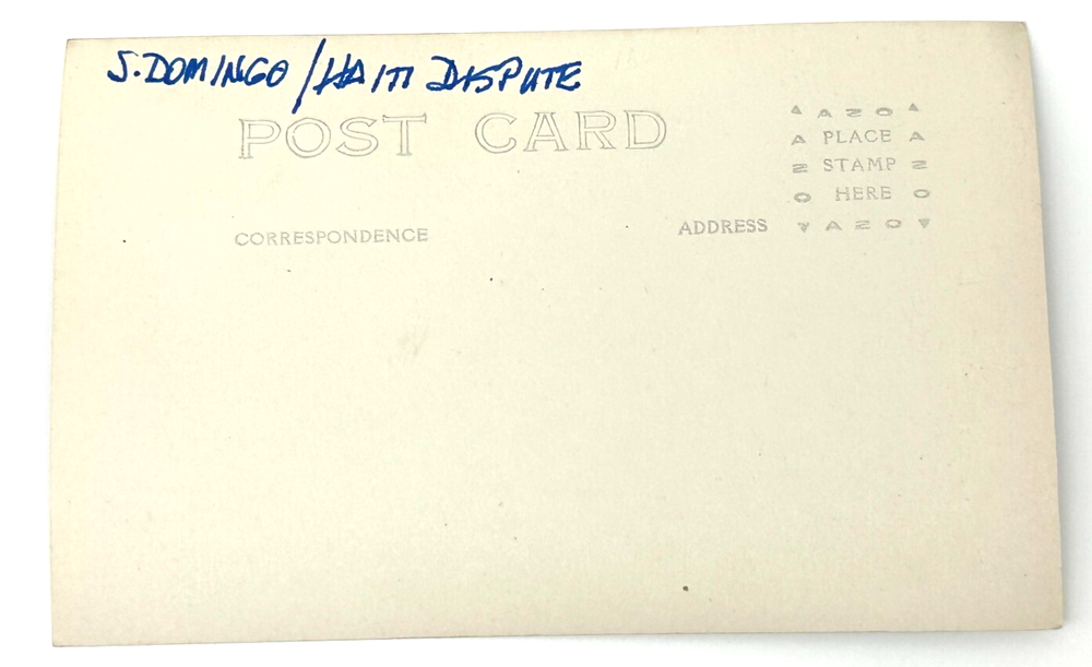 This striking real photo postcard documents U.S. troops stationed in the Caribbean during the early 20th century “S. Domingo / Haiti Dispute.” With a line of soldiers standing at attention under the American flag, this card offers a historically potent view of U.S. occupation forces in the region. A key find for military postcard collectors and those studying Caribbean intervention history.
