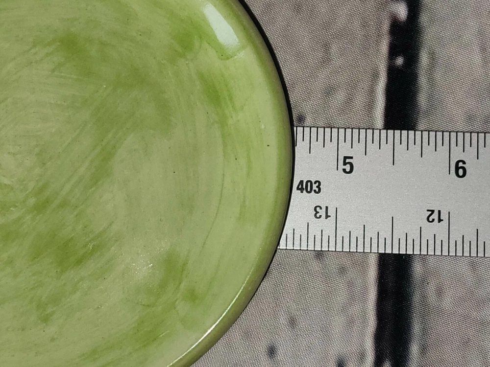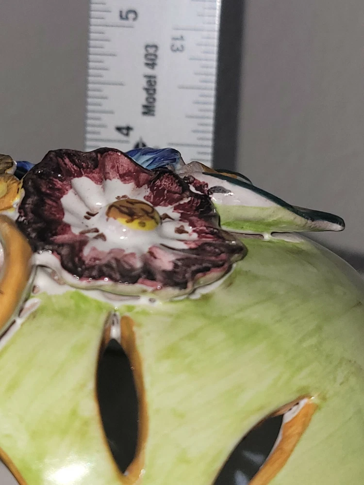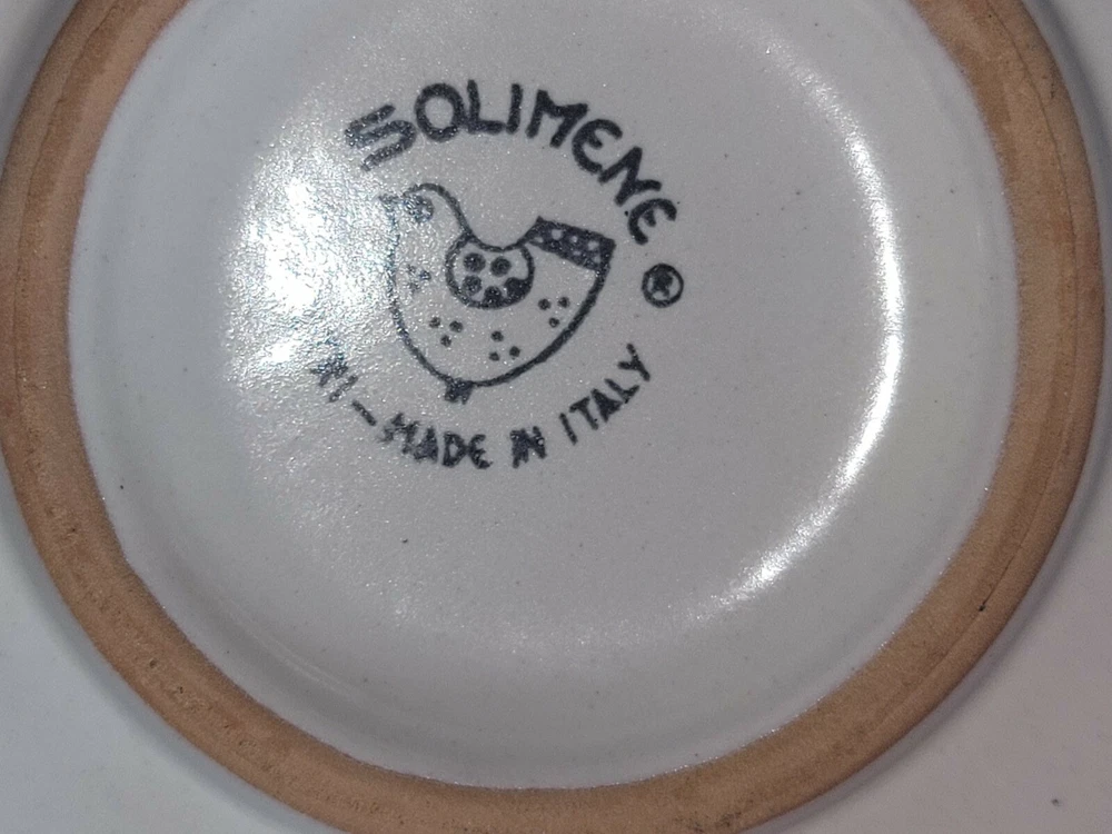Beautiful Solimene Vietri tea light candle holder ( trivet and shade). This is a punched pottery shade with three flowers on top in Blue, yellow & maroon. The base and shade are a pistachio green. The base and shade are both marked. I don't think she ever actually used it since the two tea lights are unlit, but it is being listed are pre-owned. It is free from chips or crasks. The style is is a bit rustic as there are imperfections that are original to the piece (see pictures). For example the bubbling to the pottery on the bottom of the trivet (pictured) and the painting is like a opaque overlapping water color painting. I thought it might be chipped inside the blue flower at first but it is actually how it was painted and there is no chip there (see last picture). It measure apprx. 4" tall and 4.5" wide. Please look at all pictures and ask all questions prior to placing your bid. Thanks!