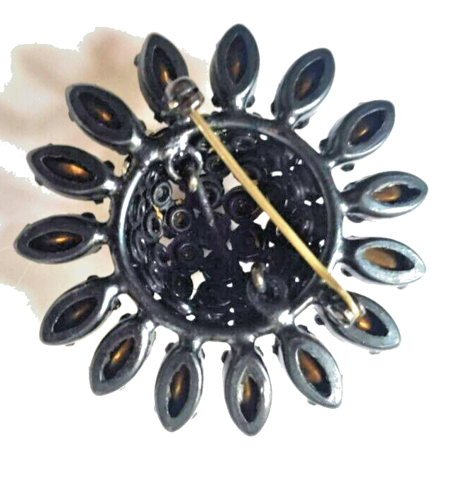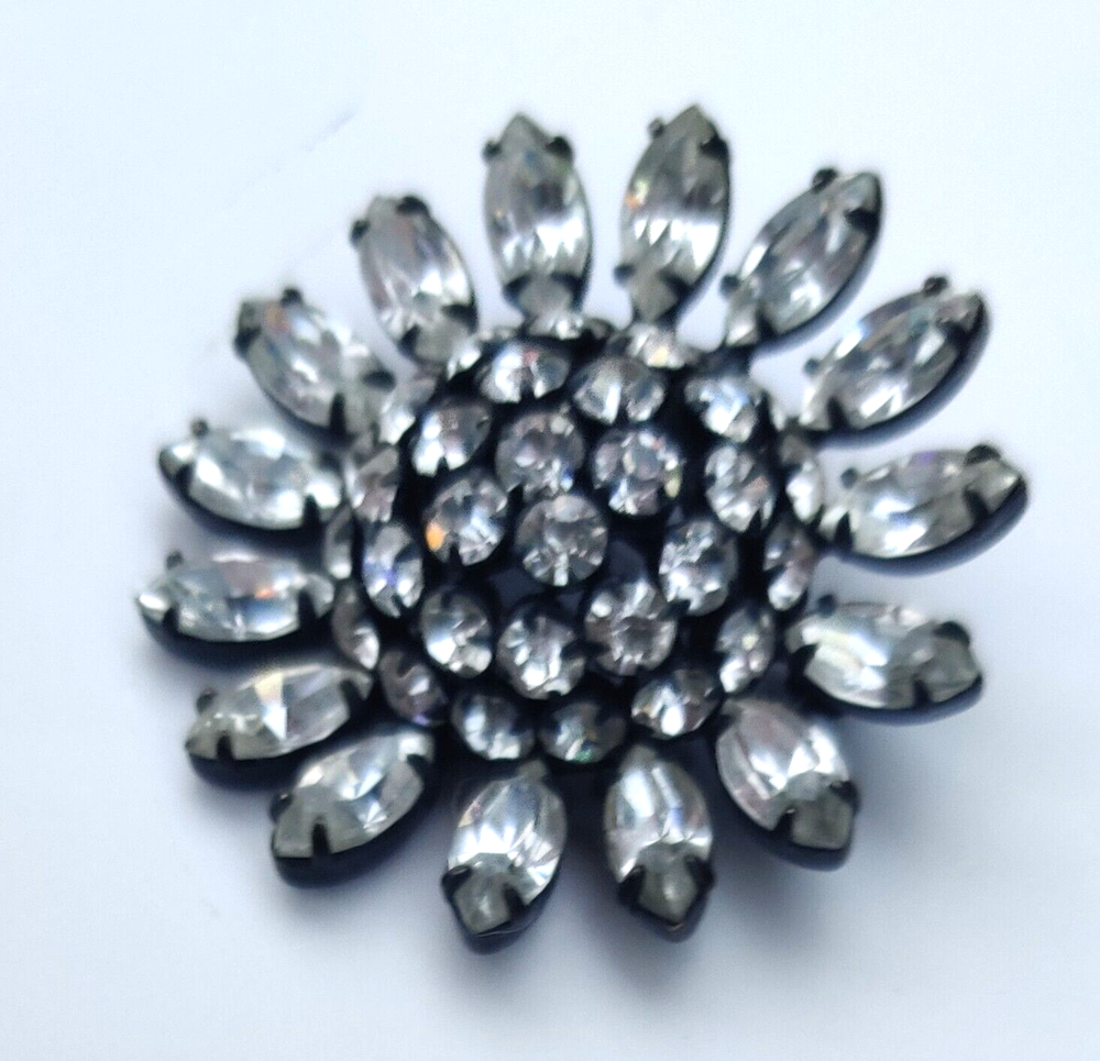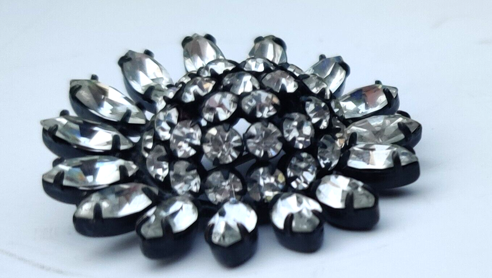 Rare Schreiner Crystal Brooch Verified Japaned Back 1.75" Domed All Rhinestones present and sparkle. No wear noted on black finish. Unsigned kj