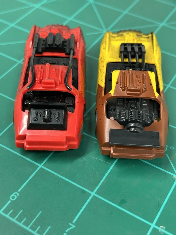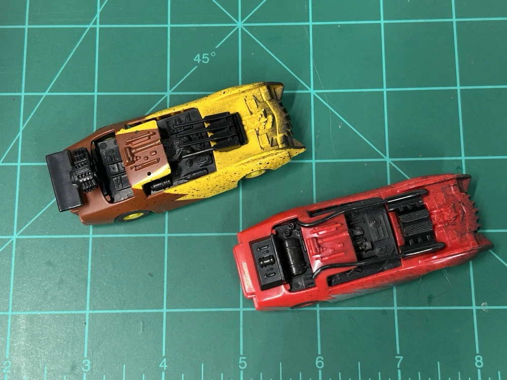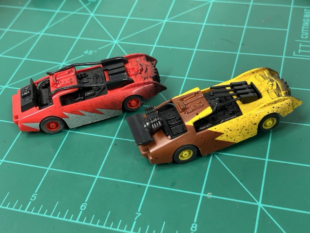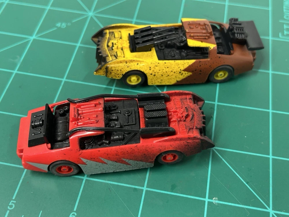 These rare Tyco Doomsday Duel set Cars are a must-have for any slot car enthusiast. With HO scale cars that can run on AFX tracks, this set is perfect for collectors and hobbyists alike. The brand, TYCO, is known for producing high-quality slot cars, and this set is no exception. These are perfect for those who want to add to their collection or for those who want to start a new hobby. The cars are designed to be compatible with other HO scale slot cars and can be used on most tracks. These cars are hard to find and is sure to make a great addition to any collection.